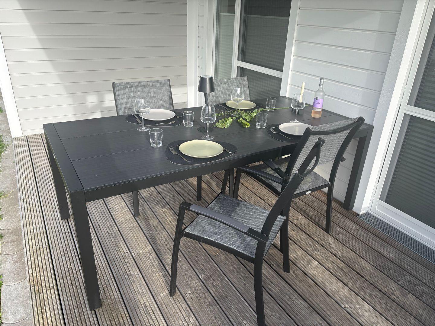 Dein privater Wellnessbereich erwartet Dich im exklusiven Badezimmer mit bodengleicher Dusche und eigener Infrarotkabine. Genieße wohltuende Entspannung nach einem Tag am Meer. Die zwei eigenen Terrassen mit bequemen Gartenmöbeln, Loungebereich, Rasenfläche und einem großen Weber Lumin Elektrogrill laden Dich zum Verweilen ein – ob für Grillabende, Gemüse garen, Fisch räuchern oder einfach nur zum Sonnen genießen.