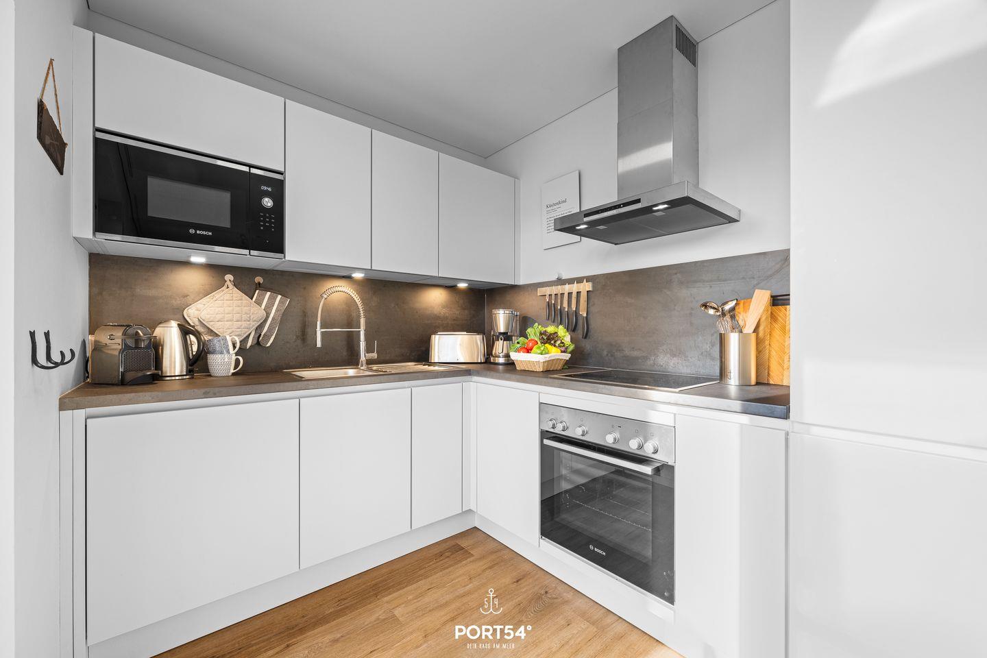 Die offene Küche ist nicht nur funktional, sondern auch ein Ort zum gemeinsamen Kochen und Genießen. Ausgestattet mit modernen Geräten wie Backofen, Geschirrspüler und Nespresso-Maschine bietet sie Dir alles, was Du für kulinarische Ausflüge von Snacks bis hin zu festlichen Menüs benötigst.