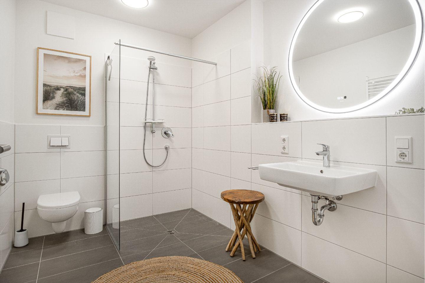 Das geschmackvoll eingerichtete Badezimmer verfügt über eine bodengleiche Dusche, ein Waschbecken mit Spiegel sowie einen Haartrockner. Ein Ganzkörperspiegel, eine Garderobe und Sichtschutz an allen Fenstern runden den hohen Wohnkomfort ab. Für Dein tägliches Wohlgefühl stehen Dir zusätzlich eine gemeinschaftlich nutzbare Waschmaschine und ein Trockner gegen Aufpreis zur Verfügung.