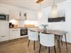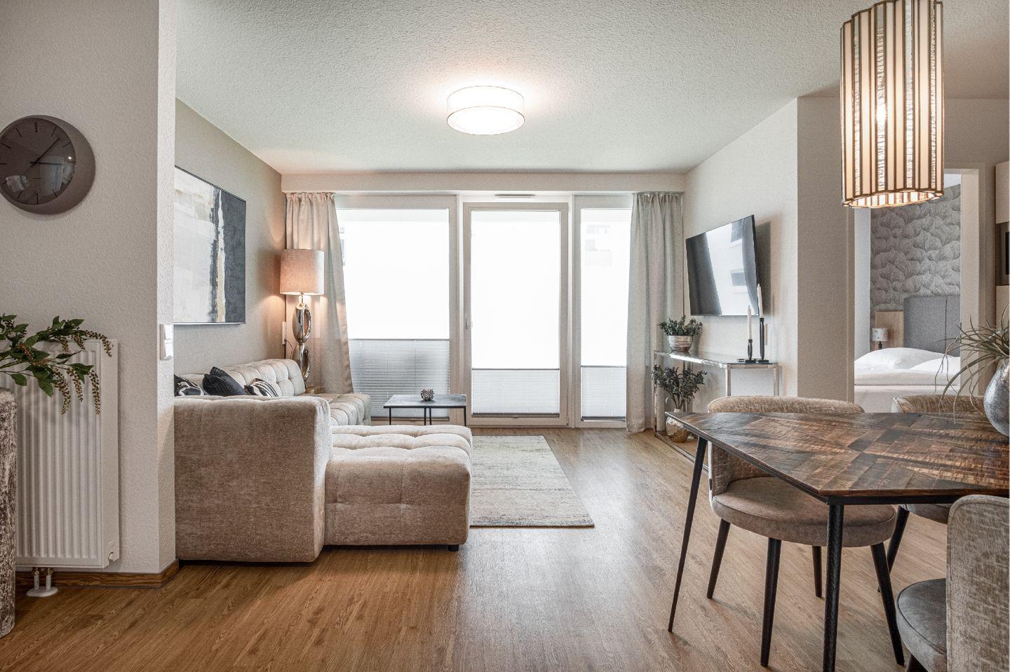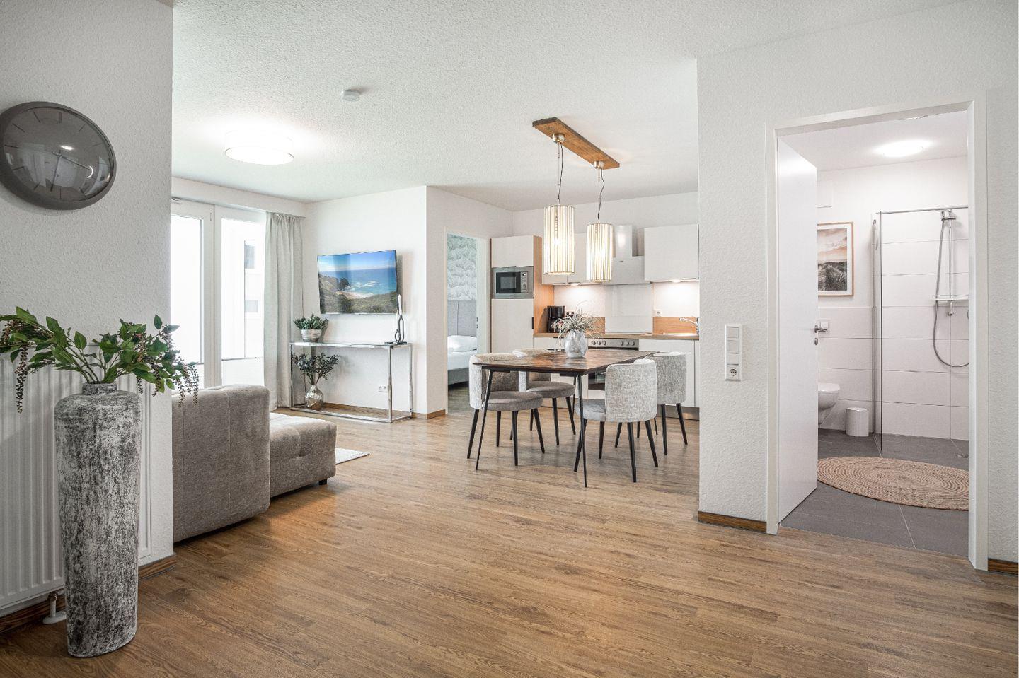 Das helle, offen gestaltete Wohn- und Esszimmer ist mit einem gemütlichen Sofa, einem Esstisch sowie einem Smart-TV ausgestattet. Die moderne, offene Küche gliedert sich nahtlos in den Wohnbereich ein und begeistert durch eine hochwertige Ausstattung. Dir stehen unter anderem eine Mikrowelle, eine Spülmaschine und eine Kaffeemaschine sowie sämtliche benötigten Küchenutensilien zur Verfügung. Gemeinsamen Kochabenden steht hier nichts im Wege.