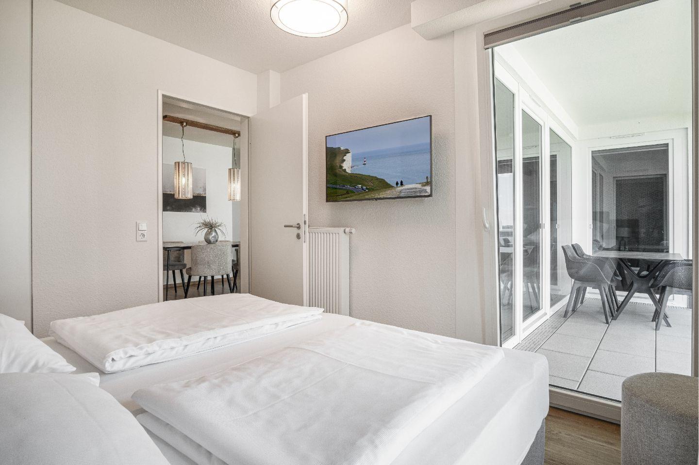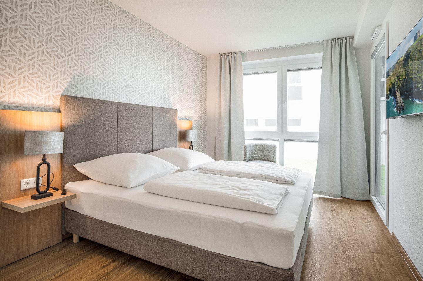 Die großzügig geschnittene Wohnung umfasst drei Räume, darunter zwei separate Schlafzimmer, die erholsamen Schlaf für bis zu vier Personen bieten. In beiden Schlafzimmern befindet sich jeweils ein Doppel-Boxspringbett (190 × 200 cm), ein Kleiderschrank sowie je ein Smart-TV. Verdunklungsmöglichkeiten runden das Angebot für erholsamen Schlaf ab.