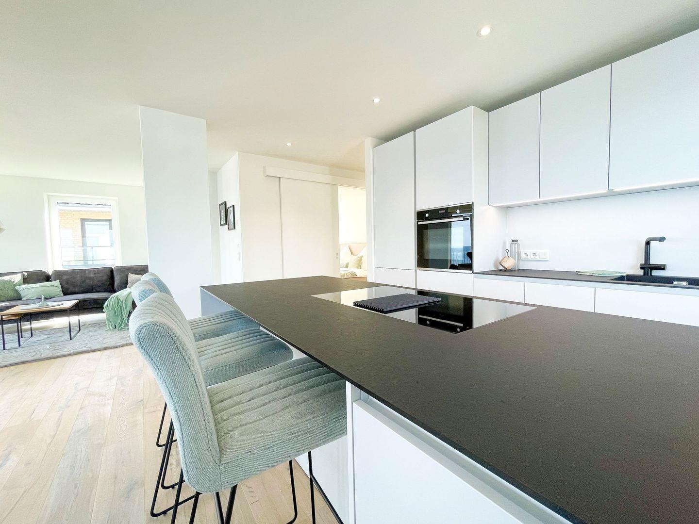 Herzlich Willkommen in „Molenliebe“, einer außergewöhnlichen Wohlfühloase, die mit viel Liebe zum Detail und höchstem Komfort auf 118 qm im 2. Obergeschoss auf Dich wartet. Tritt ein und lasse den Alltag hinter Dir – der offene, lichtdurchflutete Wohn- und Essbereich lädt Dich nicht nur zum gemeinsamen Kochen, Essen und Verweilen ein, sondern auch zum Genießen der unvergleichlichen Atmosphäre. Große, bodentiefe Fenster lassen das warme Tageslicht in den Raum strömen und schenken Dir einen atemberaubenden Blick auf das weite Blau der Ostsee. Hier kannst Du bei jedem Wetter das sich ständig verändernde Meer in seiner vollen Schönheit erleben.