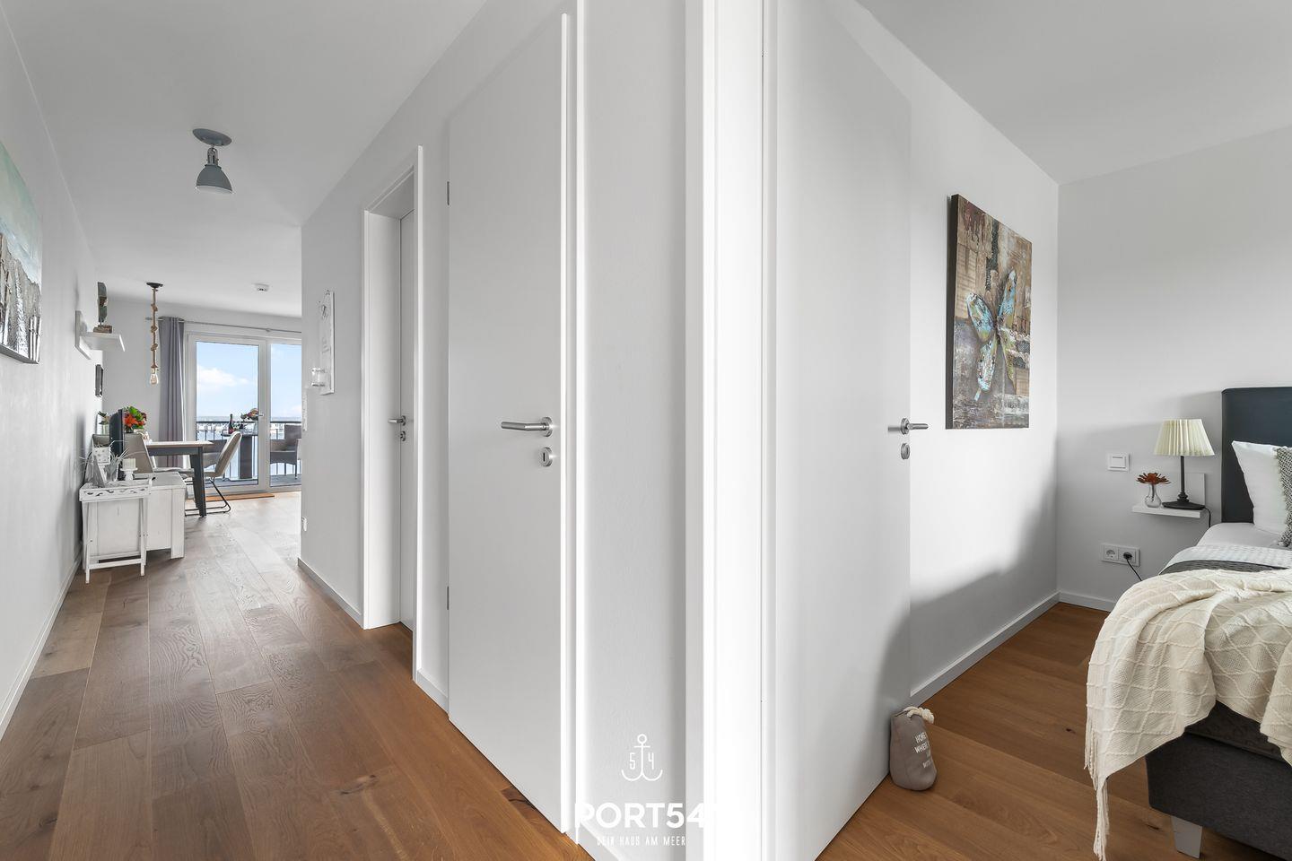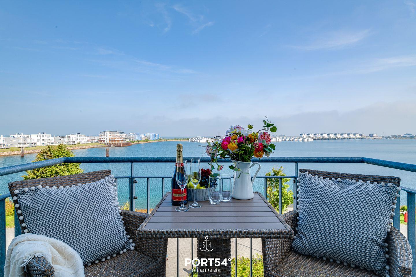 Das Appartement im zweiten Stock bietet Dir einen wunderschönen Blick auf das Meer und die maritime Umgebung – direkt vom Wohnzimmer und dem privaten Balkon aus.