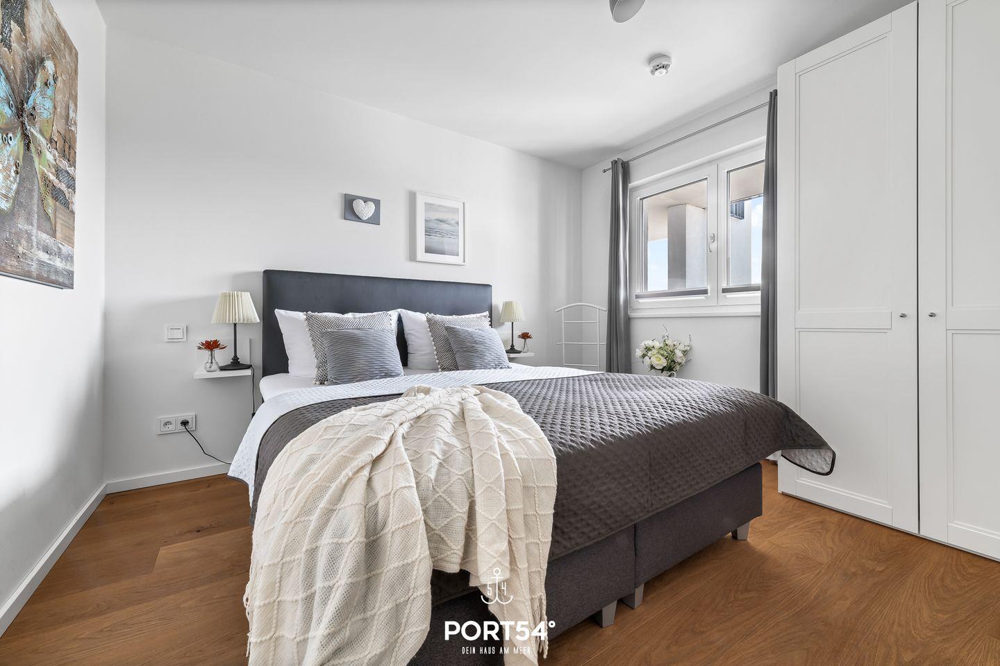 Das Schlafzimmer ist mit einem komfortablen Doppel-Boxspringbett (180×200 cm) ausgestattet und verfügt über einen eigenen Fernseher.