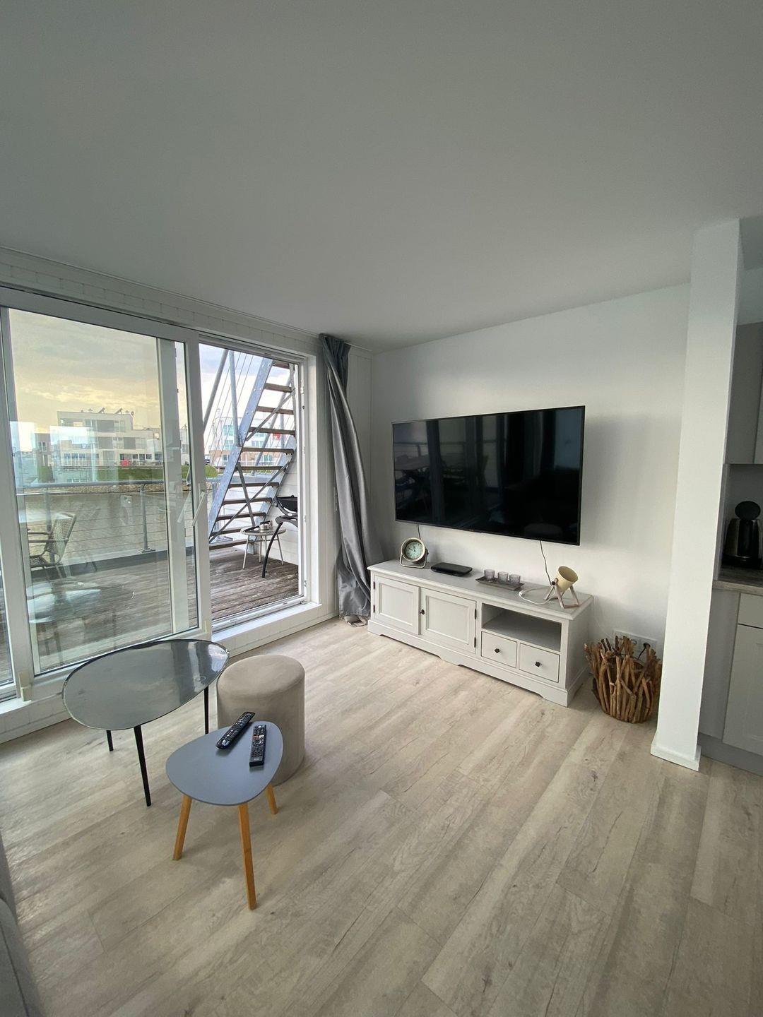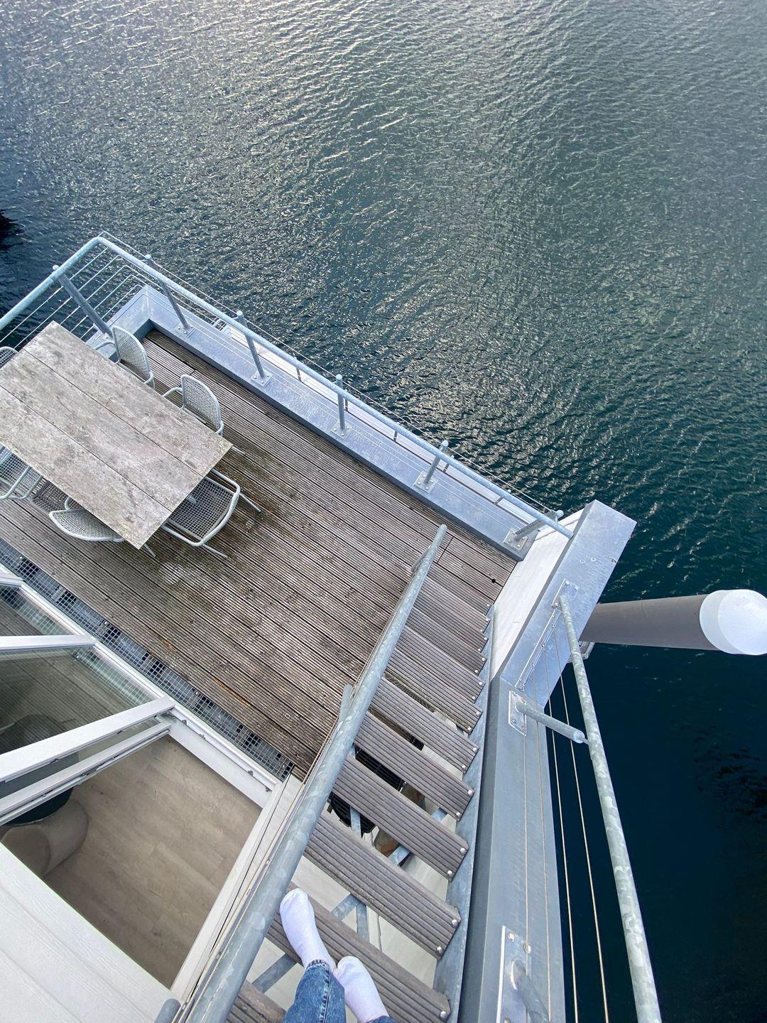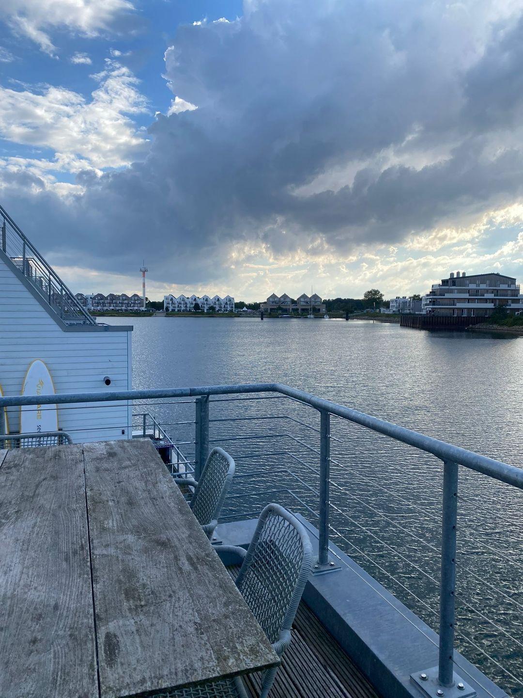 Auf der Terrasse oder dem Balkon genießt Du einen fantastischen Meerblick, der fast an das Sonnendeck eines Bootes erinnert. Die Dachterrasse mit ihrer runden Sonneninsel lädt zum Sonnenbaden, Lesen oder einfach zum Entspannen mit Blick auf das Wasser ein.