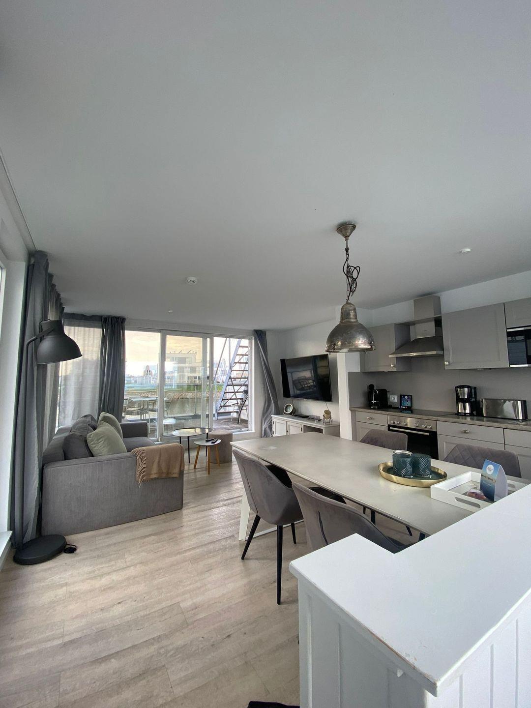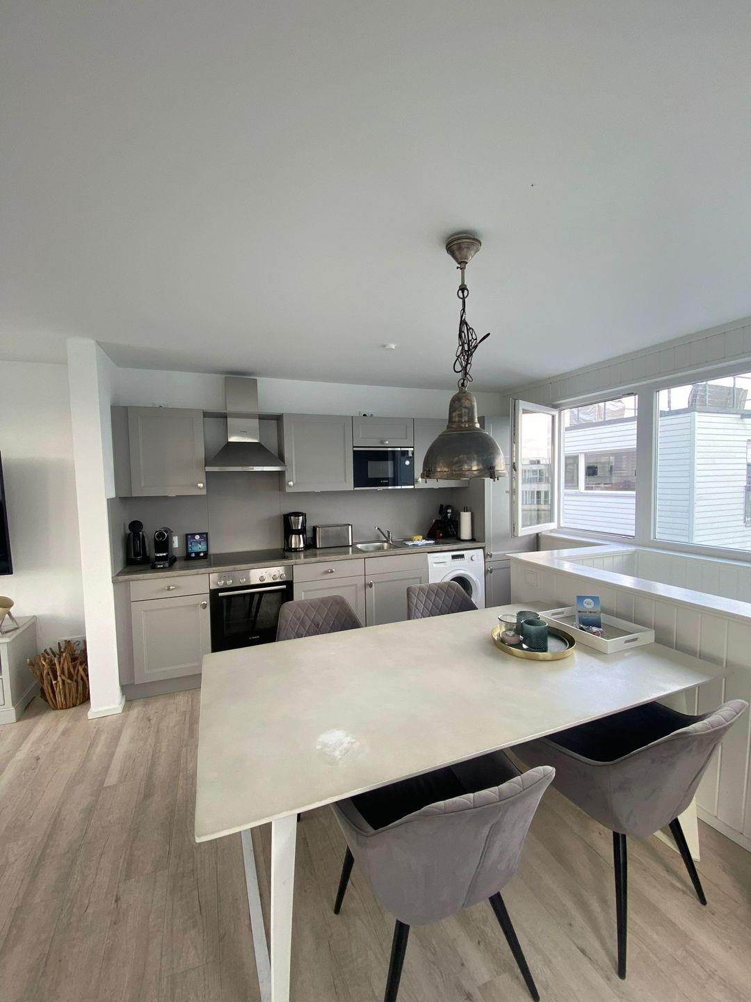 Ergänzt wird das Raumangebot durch ein modernes Badezimmer sowie einen offenen Wohn-, Ess- und Küchenbereich, der zum gemeinsamen Verweilen einlädt. Die voll ausgestattete Küche lässt keine Wünsche offen – vom Cerankochfeld bis zur Kaffeemaschine ist alles vorhanden, um Deinen Urlaub kulinarisch ganz nach Deinem Geschmack zu gestalten.