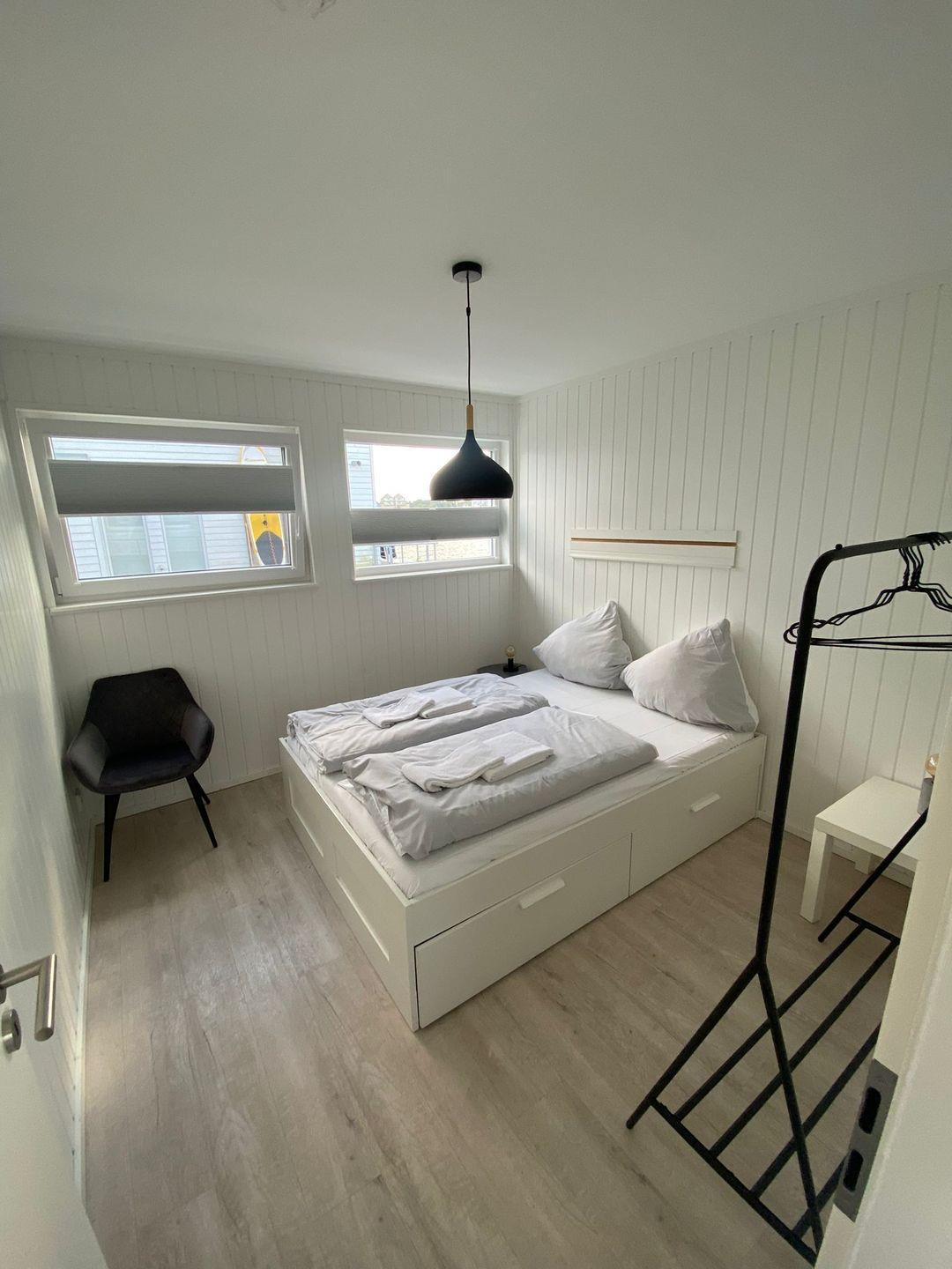 Das freistehende Ferienhaus erstreckt sich über zwei Etagen und bietet ausreichend Platz für bis zu vier Personen. Zwei gemütliche Schlafzimmer sorgen für erholsame Nächte: Eines ist mit einem komfortablen Doppelbett (180x200 cm) ausgestattet, das zweite mit einem kuscheligen Bett (140x200 cm). Beide Räume schaffen eine ruhige, entspannte Atmosphäre zum Abschalten und Wohlfühlen.