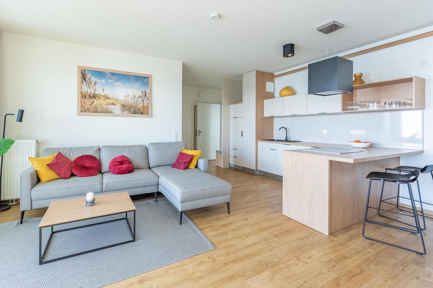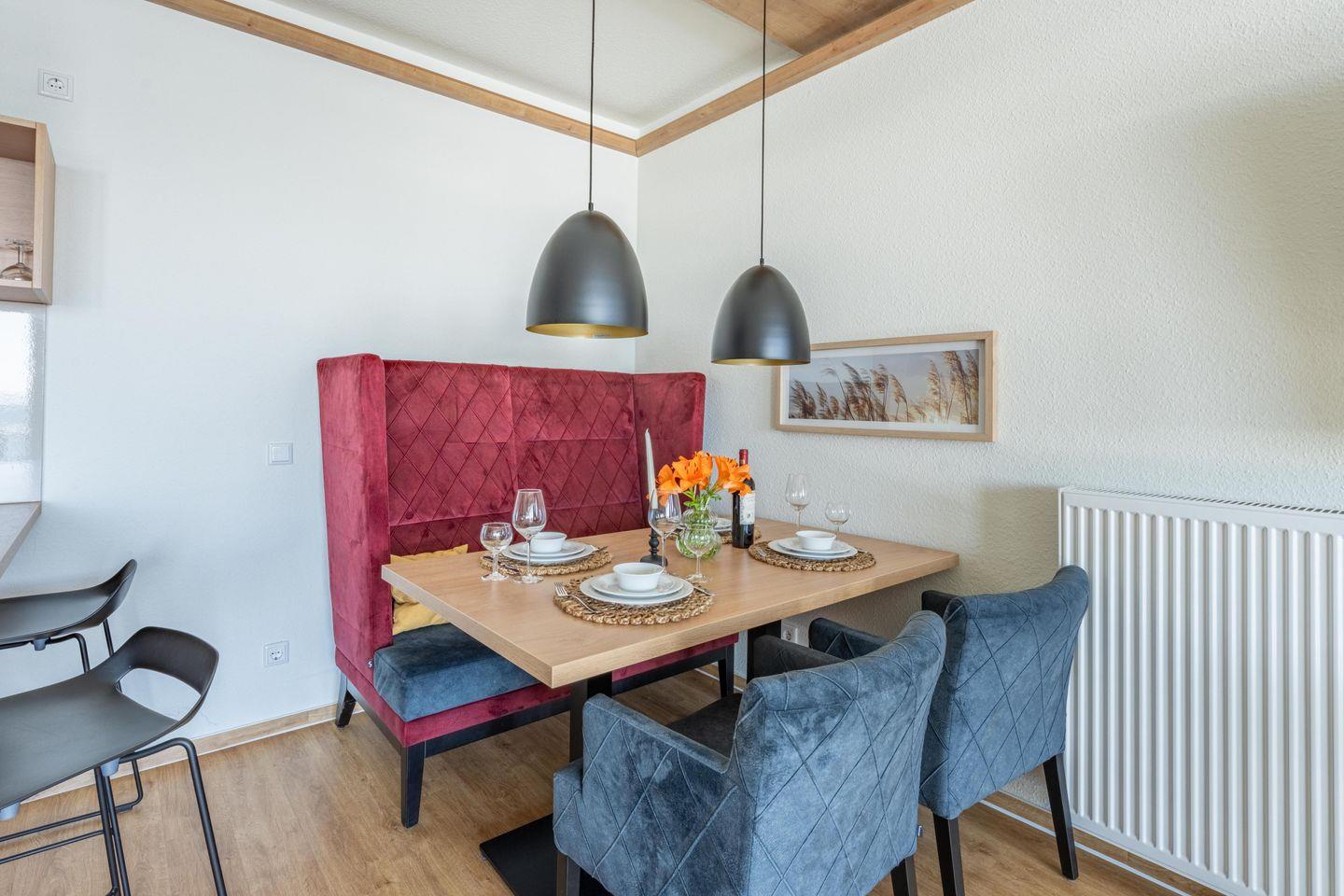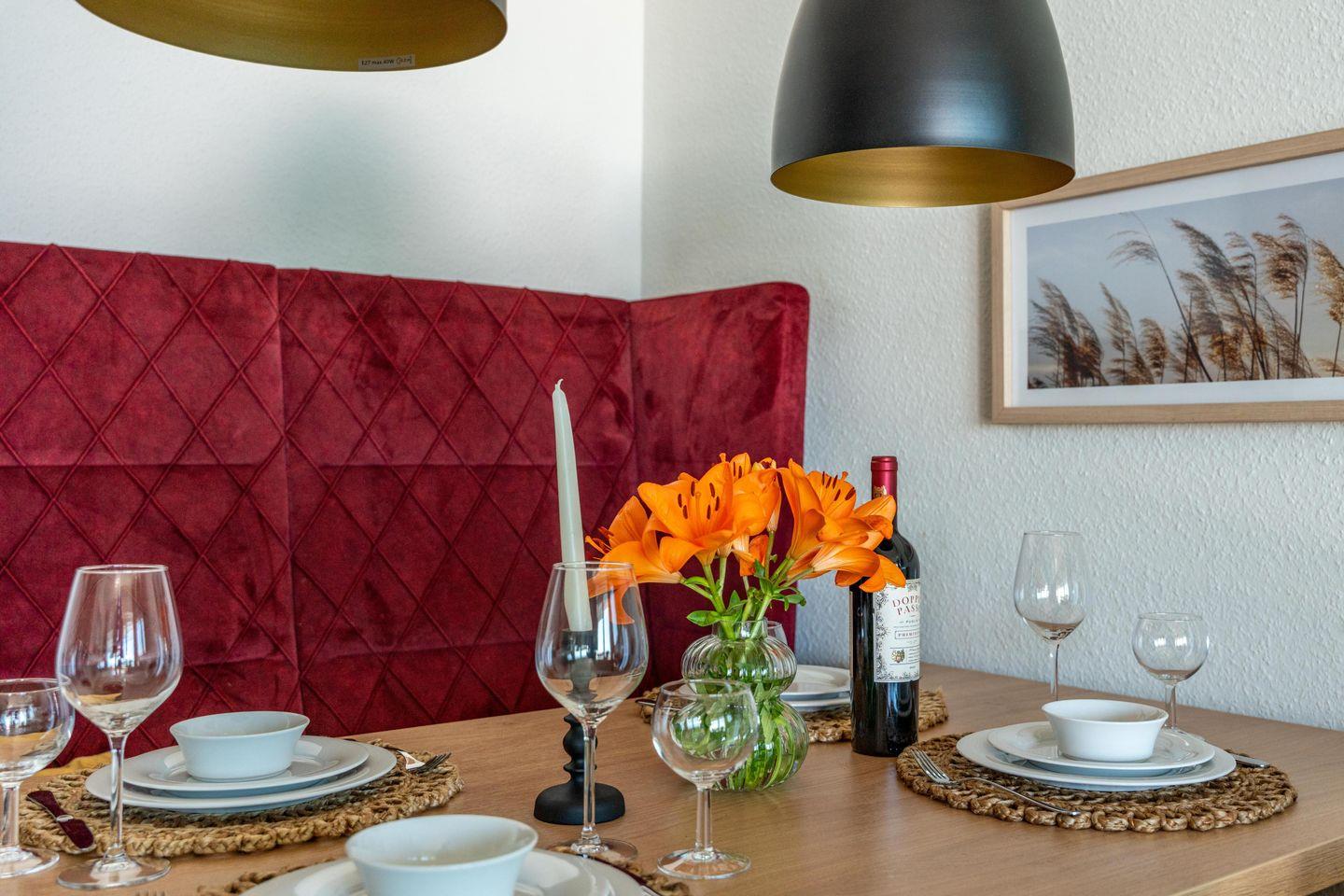 Herzstück der Wohnung ist der Wohn- und Essbereich mit offener Küche: modern, praktisch und genau richtig für gemütliche Frühstücke, entspannte Kochabende oder einfach ein Glas Wein nach einem langen Tag an der frischen Luft. Hier kommst Du ganz automatisch zusammen, ohne dass es eng wird oder sich jemand „im Weg steht“. Ob gemeinsames Kochen, Spieleabend oder einfach nur Füße hoch und kurz Durchschnaufen – der Raum ist genau dafür gemacht.