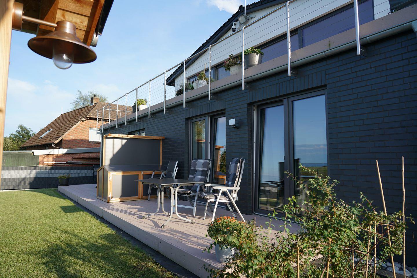 Die großzügige, möblierte Terrasse mit Gartenbereich und tollem Ausblick auf die Schlei ist ein weiteres Highlight der Ferienwohnung. Ein Elektrogrill steht ebenfalls zu Deiner Verfügung. Von hier genießt Du einen modernen Rückzugsort mit Blick in die grüne Umgebung und auf das nahe Wasser.