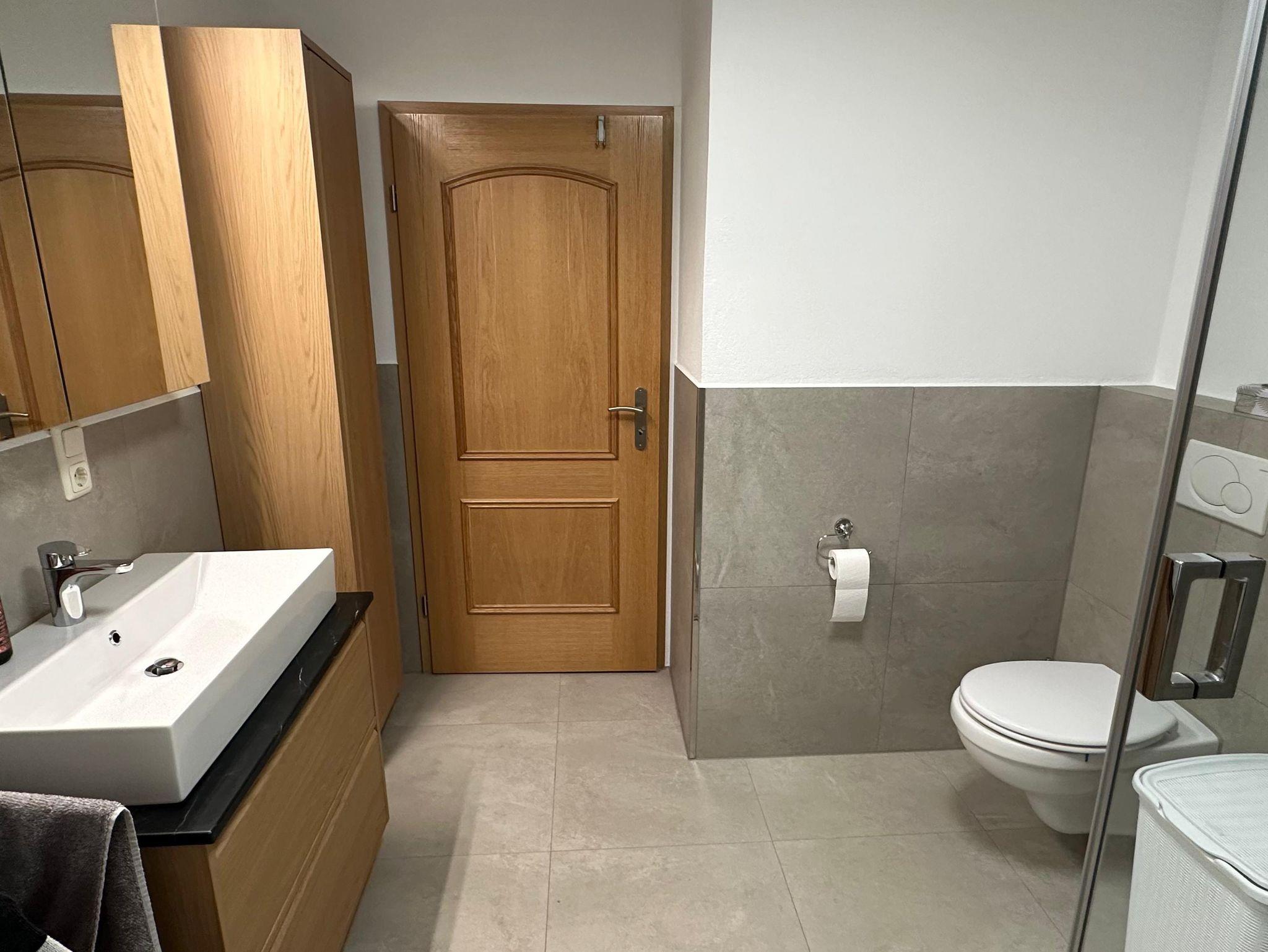 • großes Bad mit Glasdusche und WC, Fön
