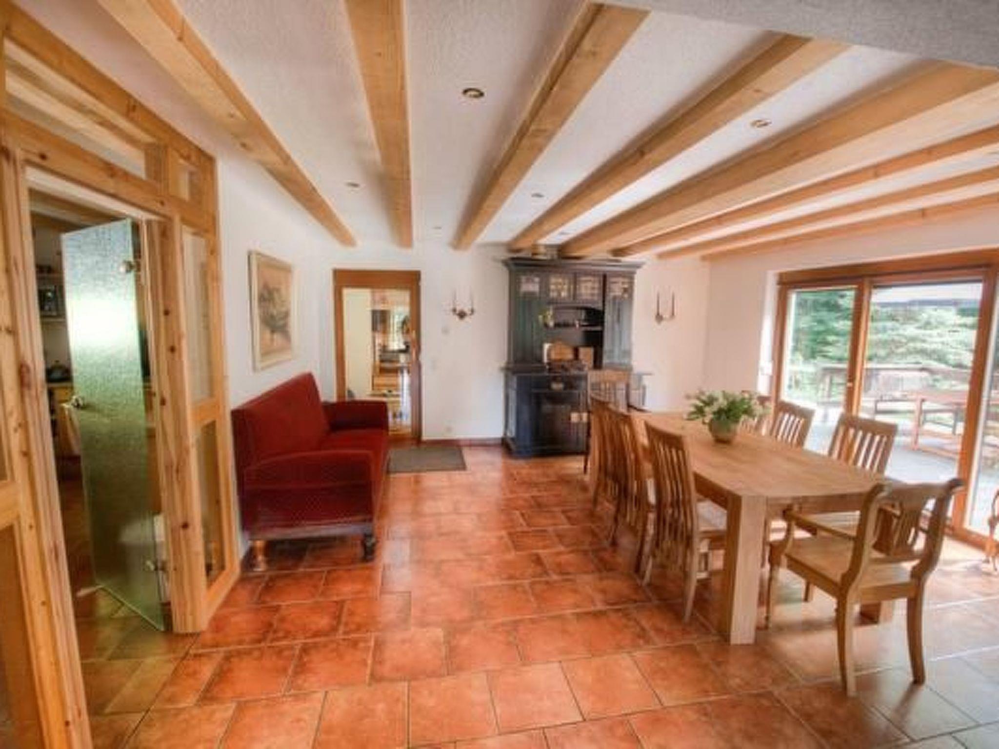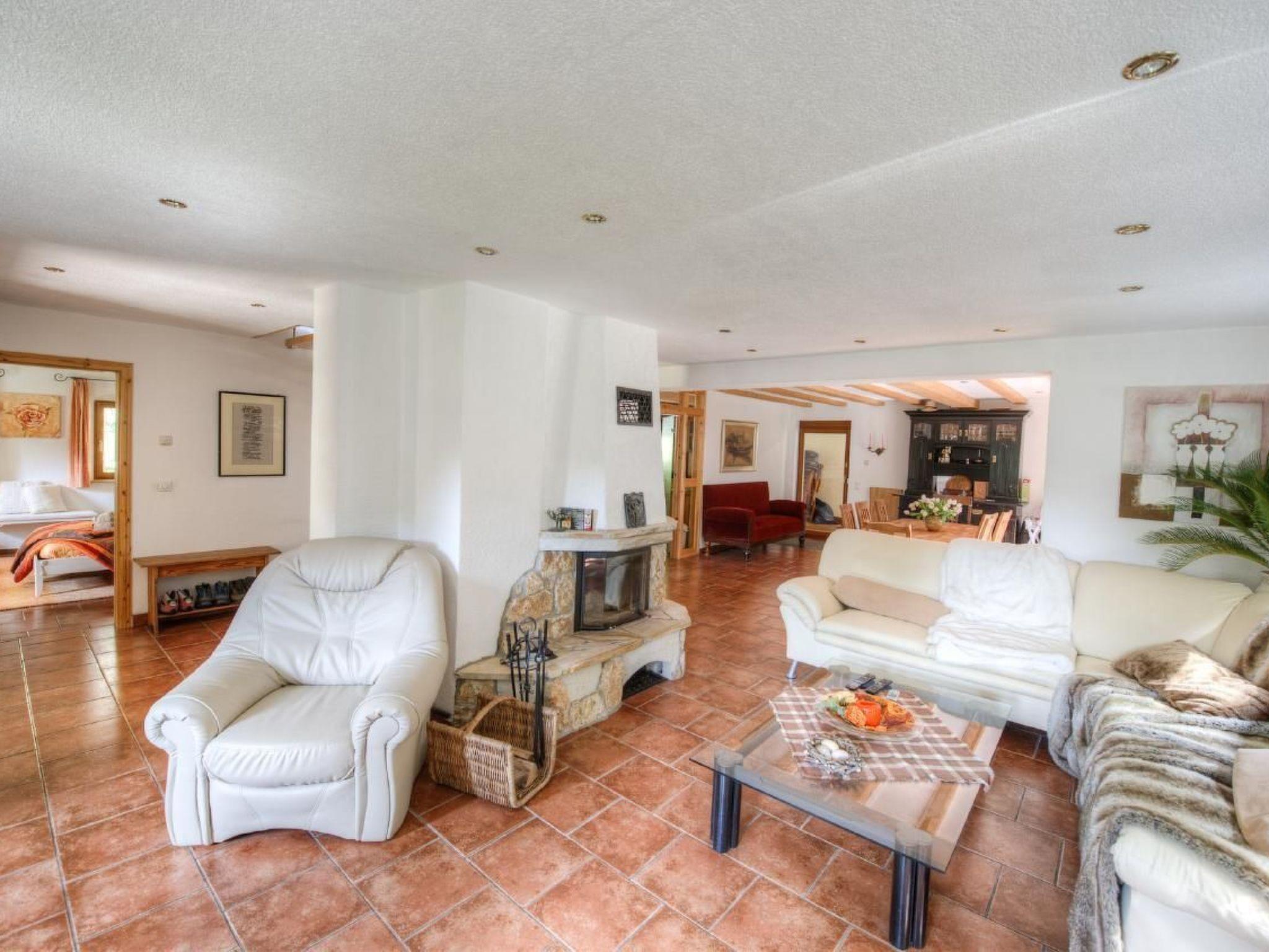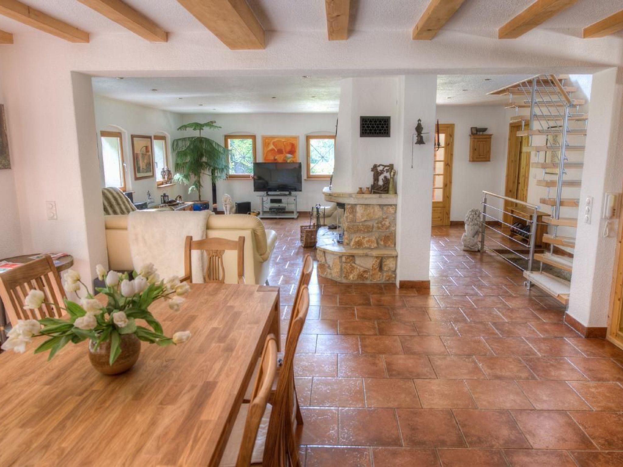 The lounge is divided into a cosy living area and a dining room with a large table, which can also be used for a games evening.