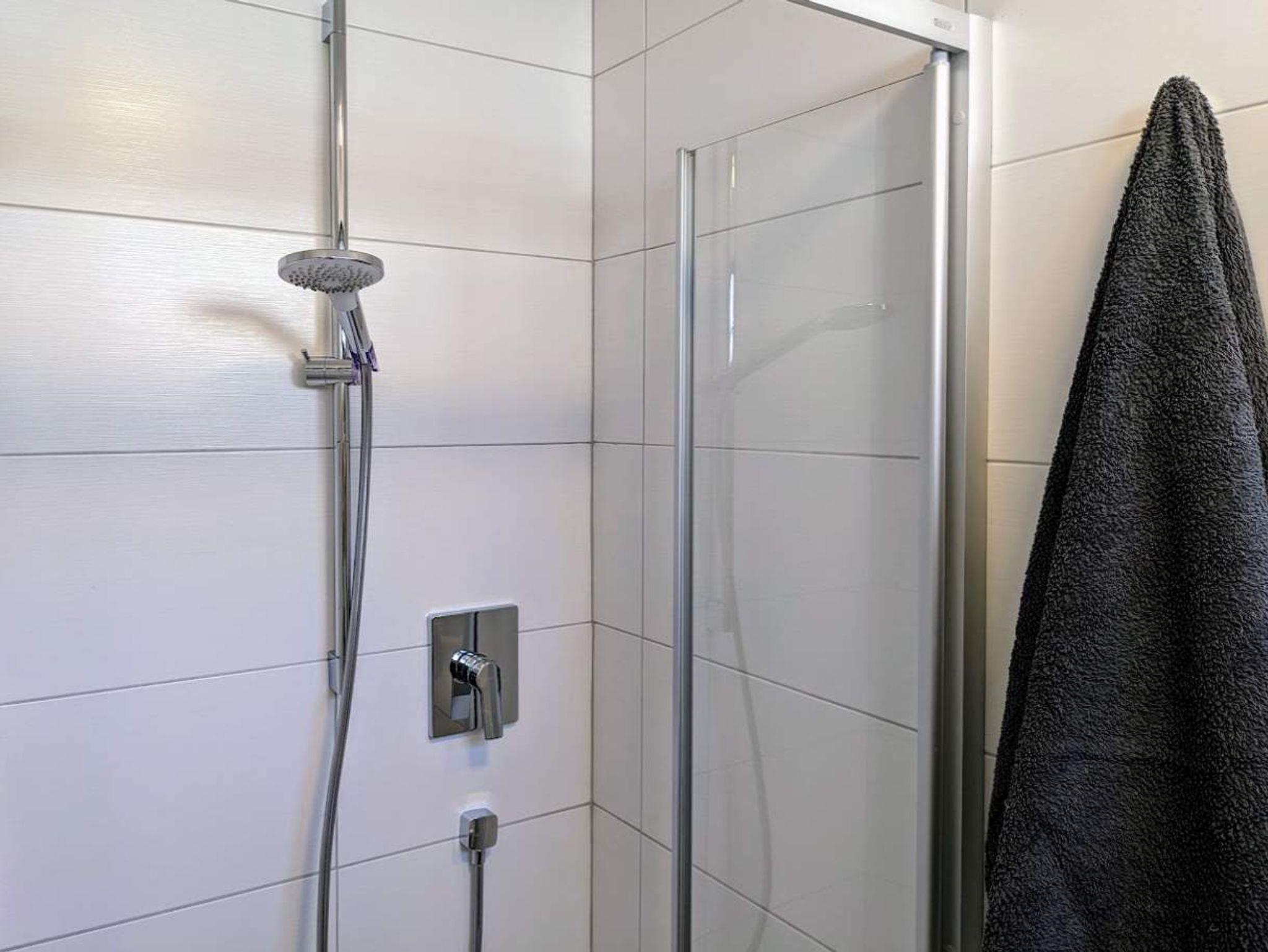 Dusche, WC und Waschbecken sind neben dem Gemeinschaftsraum, Hand-/ Duschtücher und Fön sind vorhanden.