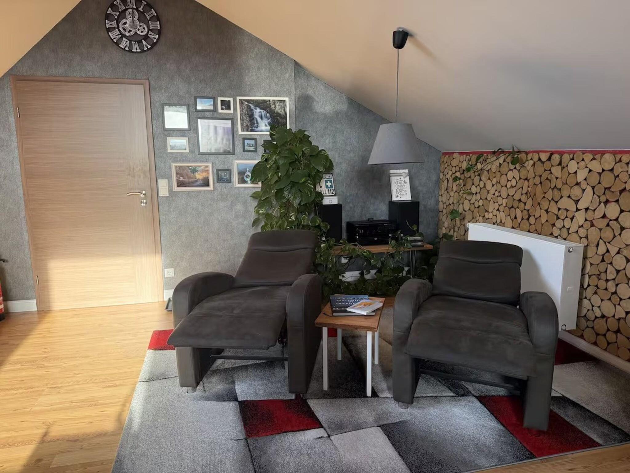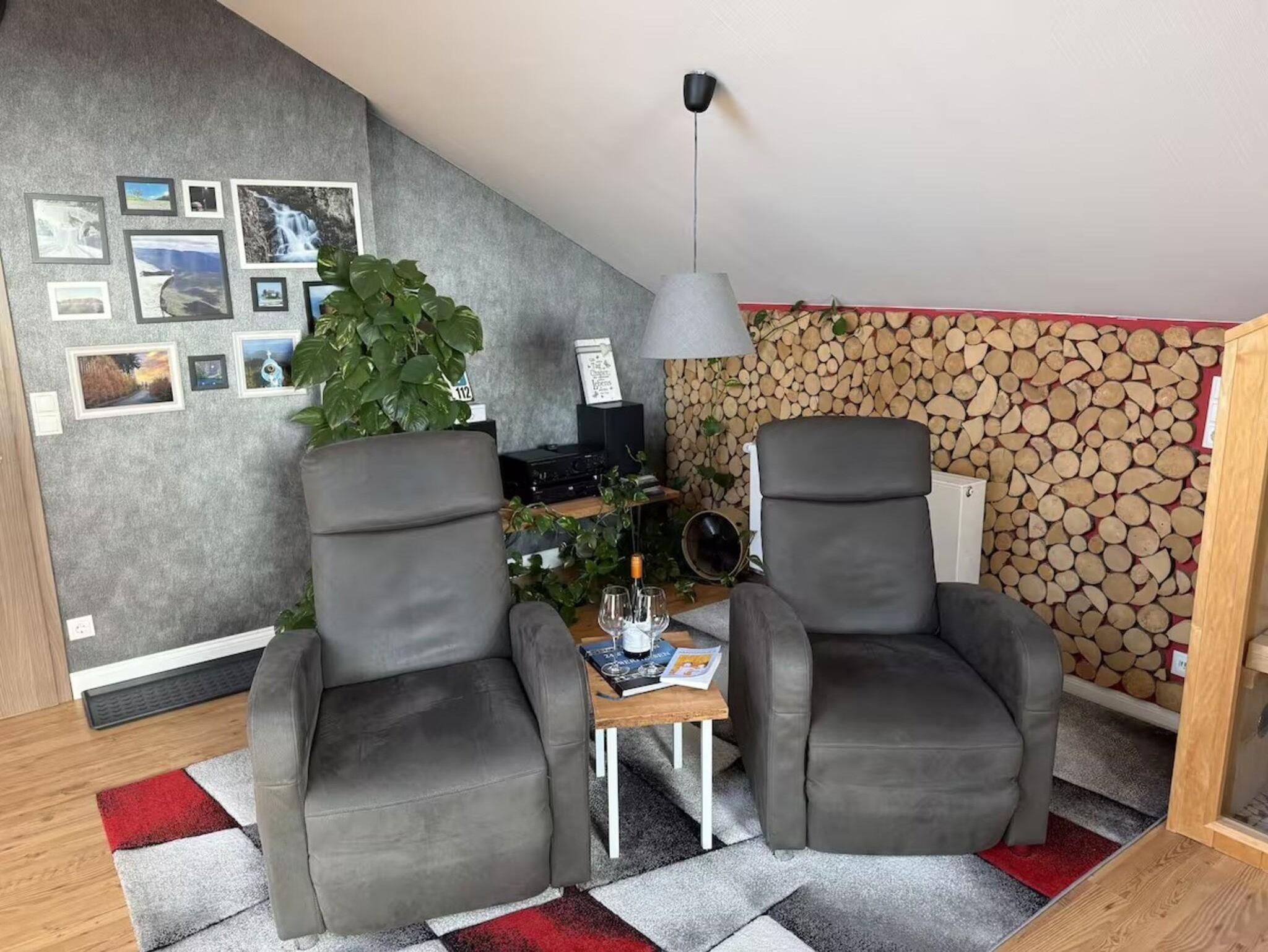Zum Abschalten laden zwei besonders bequeme Relaxsessel ein. Ein echtes Highlight ist die finnische Sauna, die ihr kostenfrei nutzen könnt. An kühleren Tagen sorgt der Kamin für wohlige Wärme und eine romantische Atmosphäre – Brennholz stellen wir euch selbstverständlich kostenlos zur Verfügung .