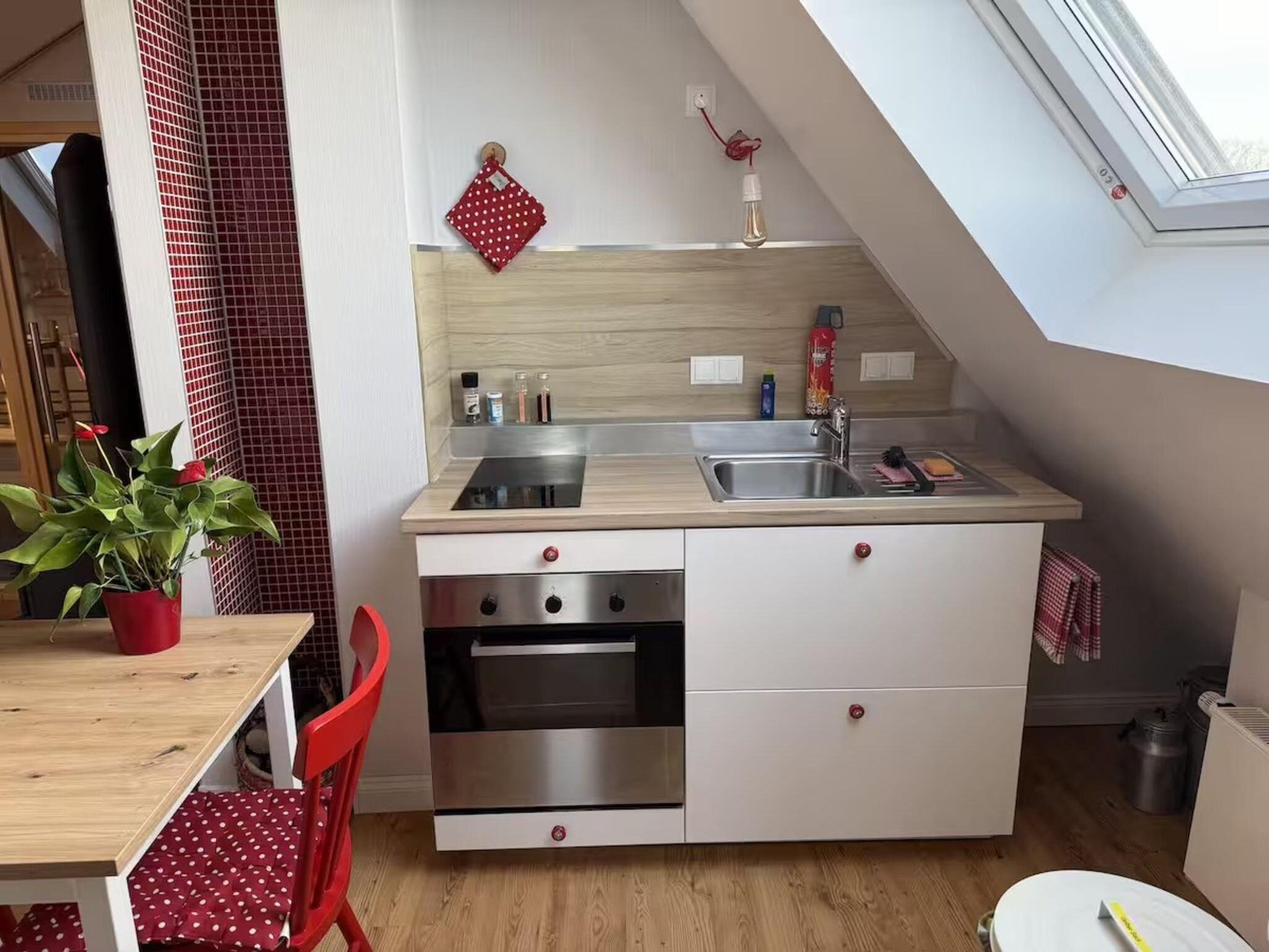 • Voll ausgestattete Küche mit Esstisch, Kühlschrank, Mikrowelle
