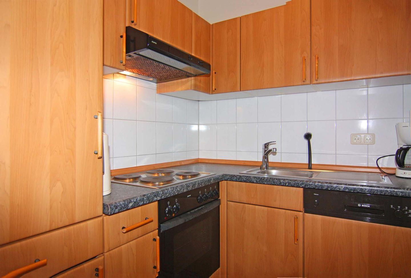 Die Küche ist komplett ausgestattet mit Geschirr, Gläsern, Kochutensilien, Kaffeemaschine, Heißwasserkocher, Herd mit 4 Kochplatten und Backofen sowie Kühlschrank mit Gefrierfach und Geschirrspüler. Frische Brötchen für das Frühstück erhalten Sie in der Ferienanlage im Café.