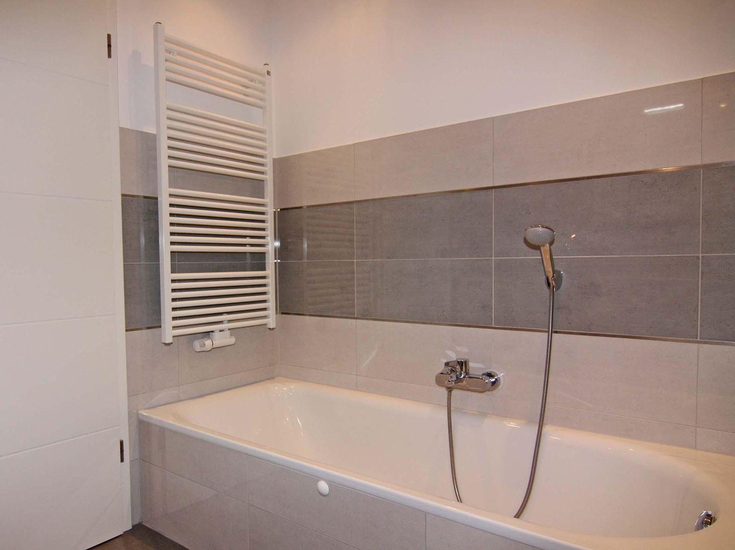 Modernes Vollbad mit Dusche, separater Badewanne und Waschmaschine