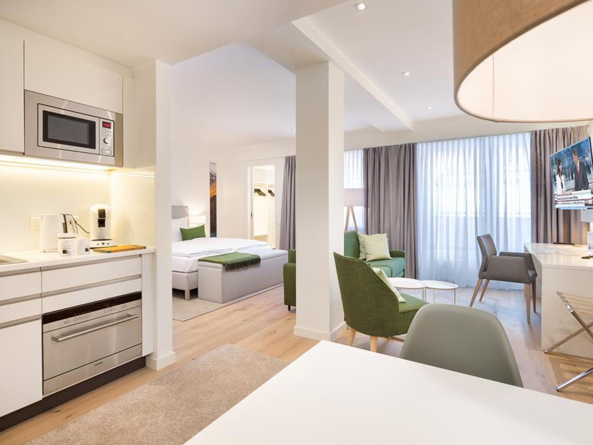 Ausstattung: Moderne Raumgestaltung auf ca. 34 qm, mit Arbeitsplatz und Polstermöbeln, Balkon, 40 Zoll Full HD Flat Screen, DVD-Player, Radio, CD-Player, Safe. Komplett ausgestattete Kitchenette mit Spülmaschine, Mikrowelle, 2-Platten-Ceran-Herd, Kühlschrank mit Gefrierfach, Kaffeemaschine, Toaster, Bügelbrett, Bügeleisen, Geschirr, Töpfen, Wasserkocher und vielem mehr. Exklusiv gestaltetes Bad mit Dusche, Waschtisch, Kosmetikspiegel, ausziehbarem Wäschekorb, Föhn und viel Stauraum für persönliche Pflegeartikel. Babybett ist auf Anfrage möglich.