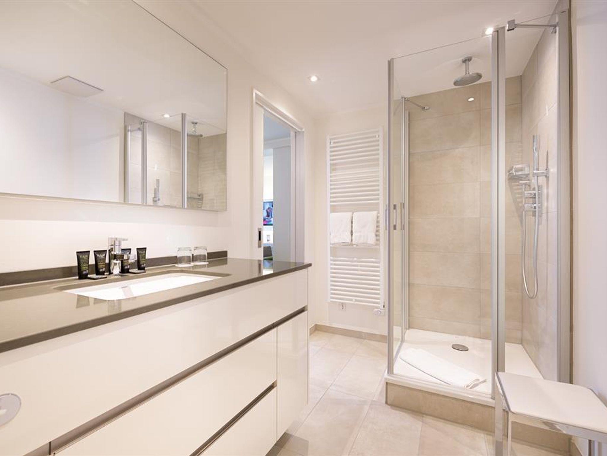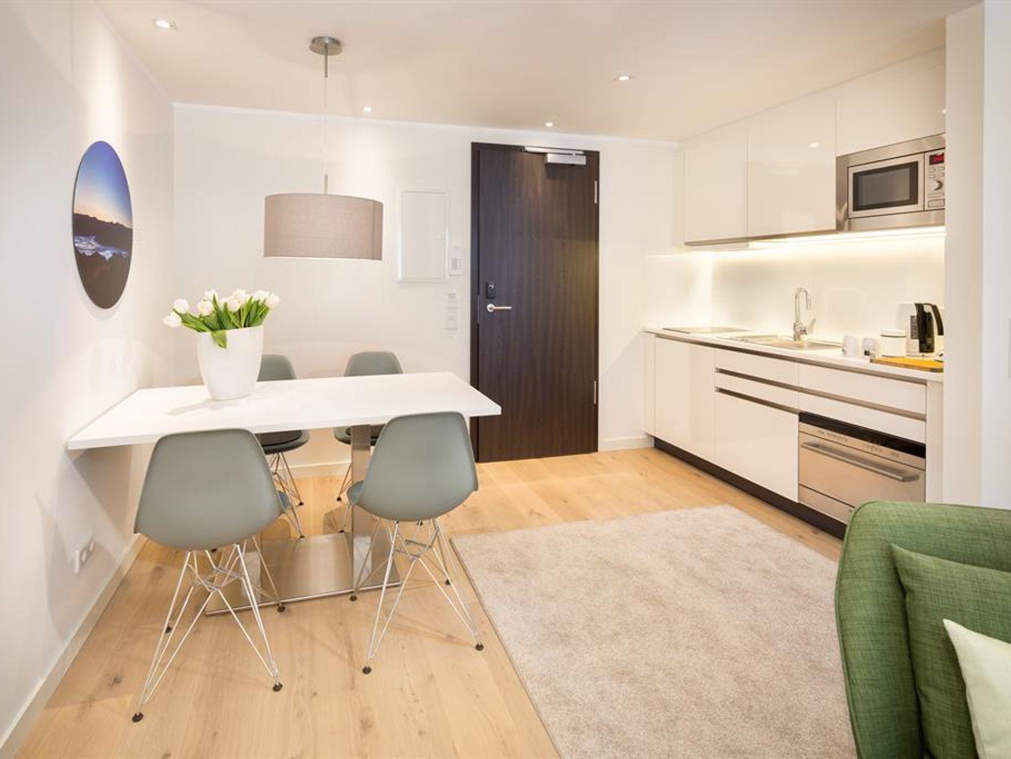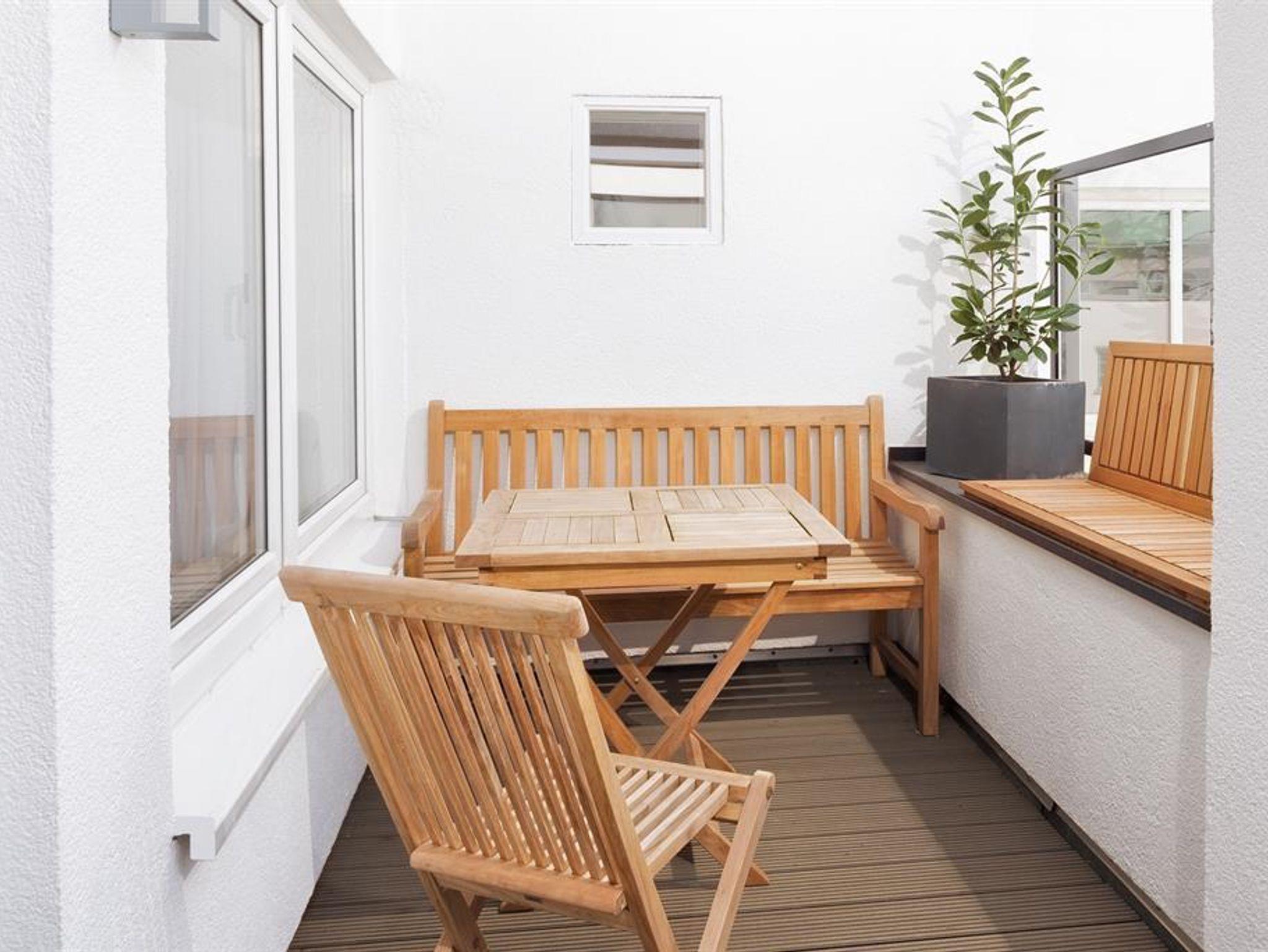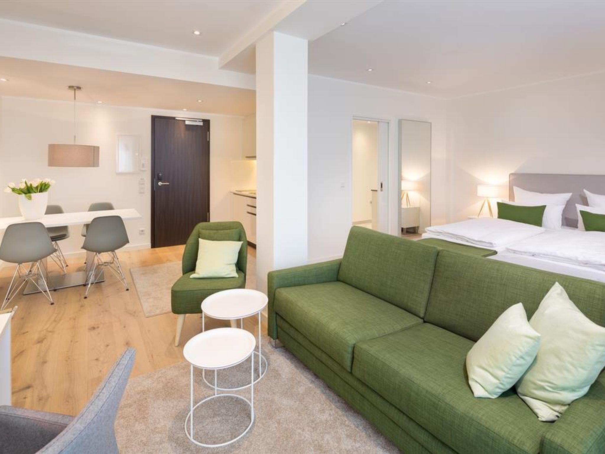 Ausstattung: Moderne Raumgestaltung auf 30 qm und Balkon, mit Arbeitsplatz und Polstermöbeln, Fernseher, DVD-Player, Radio, CD-Player, Safe. Komplett ausgestattete Kitchenette mit Spülmaschine, Mikrowelle, 2-Platten-Ceran-Herd, Kühlschrank mit Gefrierfach, Kaffeemaschine, Toaster, Bügelbrett, Bügeleisen, Geschirr, Töpfen, Wasserkocher und vielem mehr. Exklusiv gestaltetes Bad mit Dusche, Waschtisch, Kosmetikspiegel, ausziehbarem Wäschekorb, Föhn und viel Stauraum für persönliche Pflegeartikel. Zusätzliches Schlafsofa oder Extrabett sowie Babybett auf Anfrage möglich.