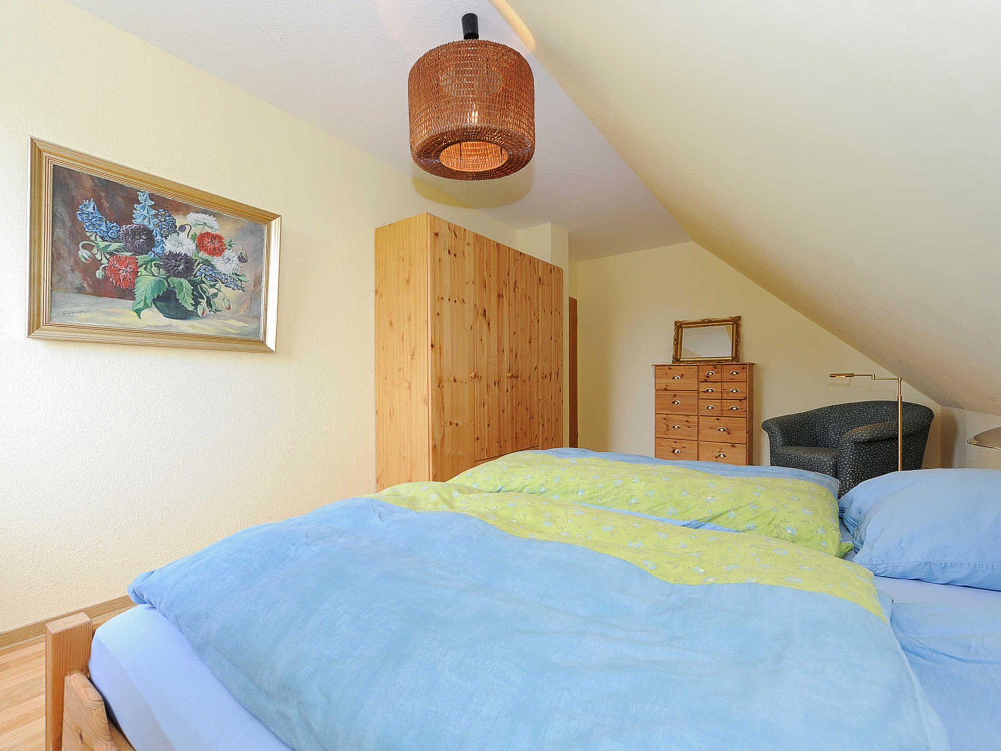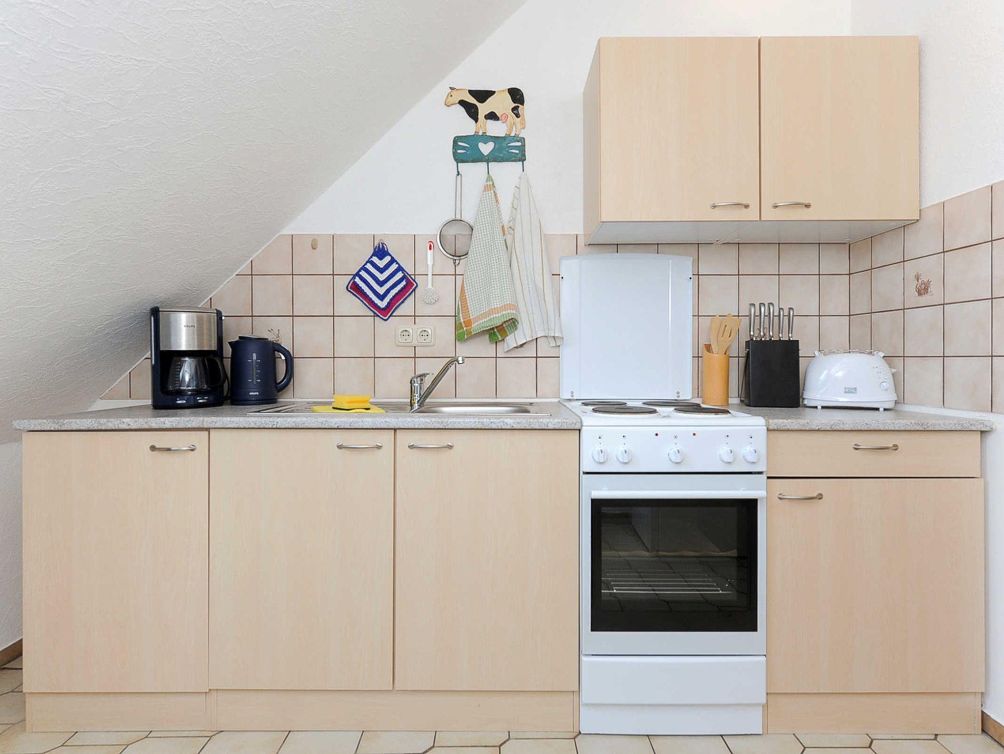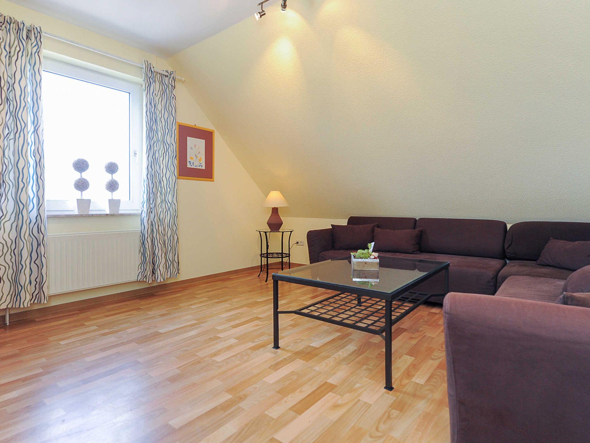 Größe ca. 50 Quadratmeter, Wohnzimmer, Küche, Schlafzimmer, Badezimmer mit Dusche, Waschtisch und WC, Obergeschoss, optimal für 2 Personen.