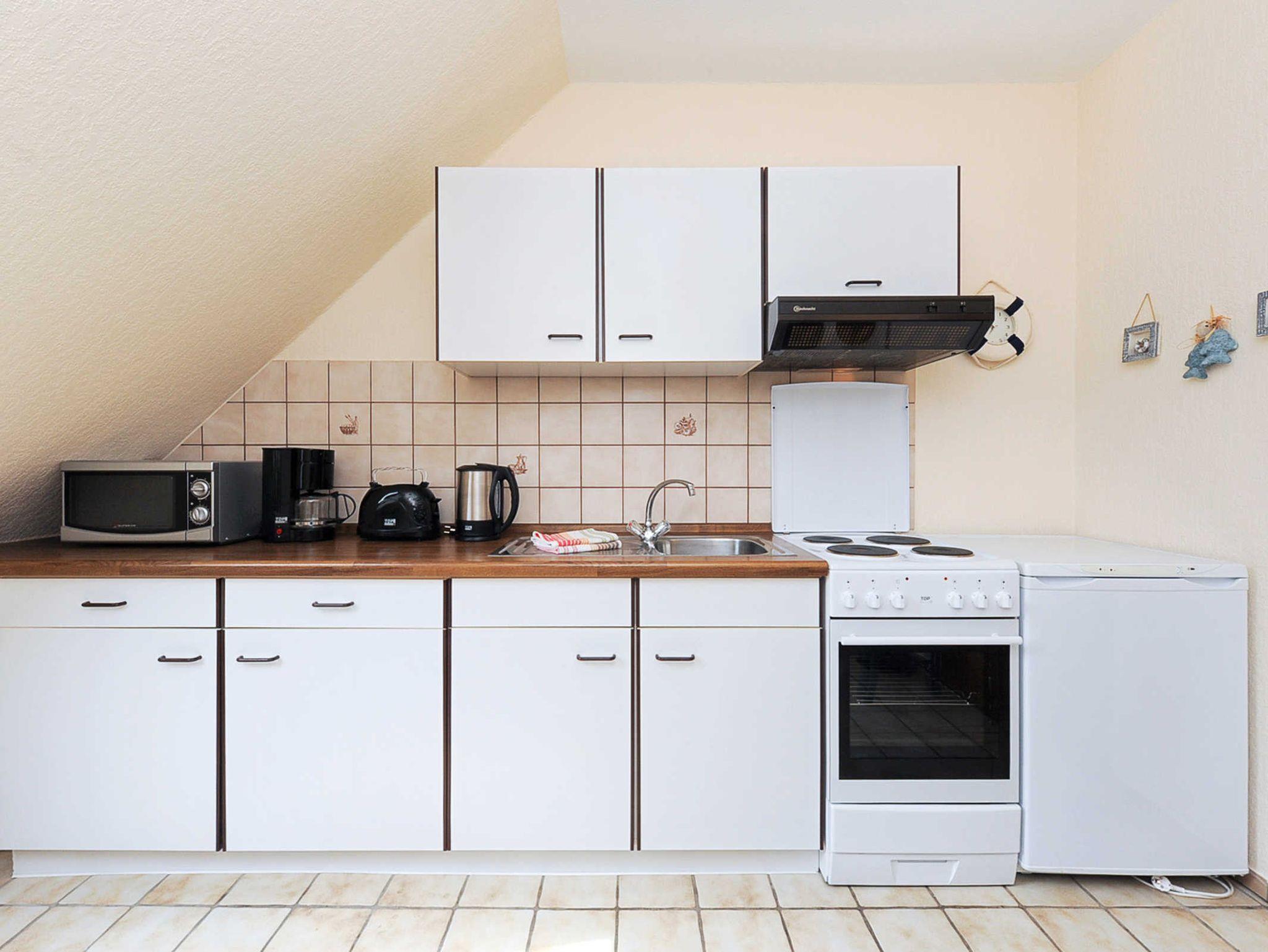 Größe ca. 40 Quadratmeter, Wohnzimmer, Küche, Schlafzimmer, Badezimmer mit Dusche, Waschtisch und WC, Obergeschoss, optimal für 2 Personen.