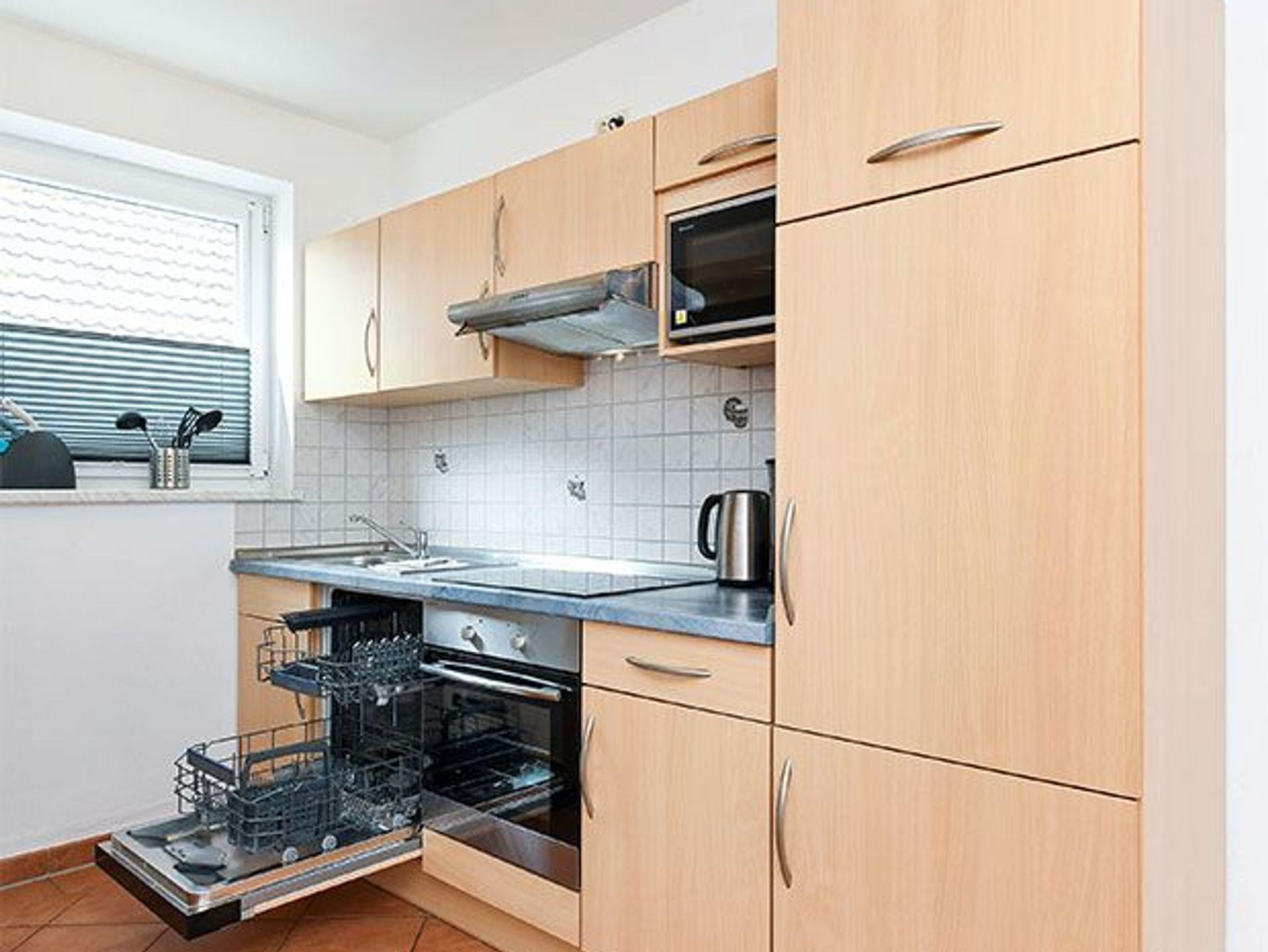 Größe ca. 60 Quadratmeter, Wohnzimmer mit integrierter Küche, Schlafzimmer, zweites separates Schlafzimmer/Kinderzimmer, Badezimmer mit Dusche, Waschtisch und WC, Erdgeschoss, Terrasse, optimal für 2 bis 5 Personen und zusätzlich ein Kleinkind.