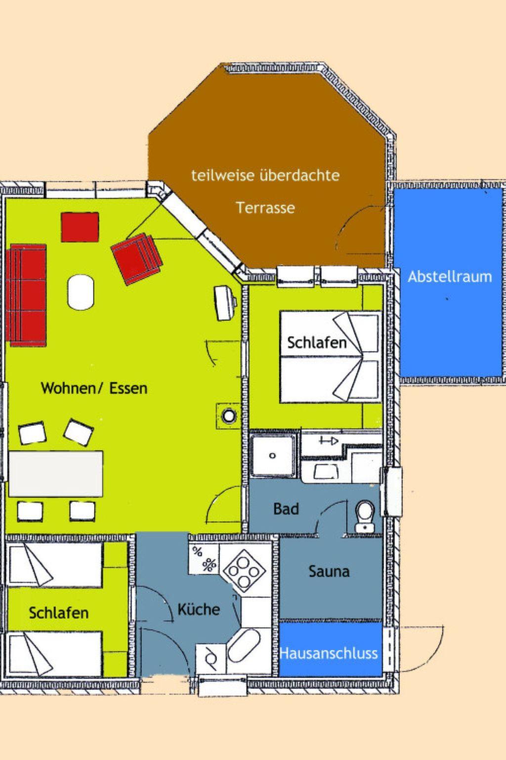 The high-quality furnished holiday home has a spacious living/dining room with wood-burning stove, 2 bedrooms, a fully equipped fitted kitchen and a shower room with sauna.