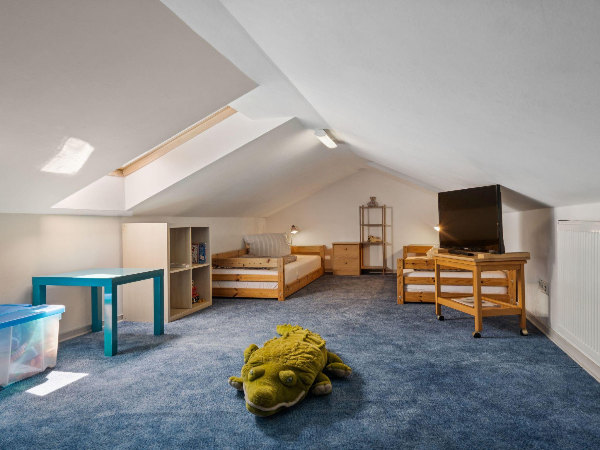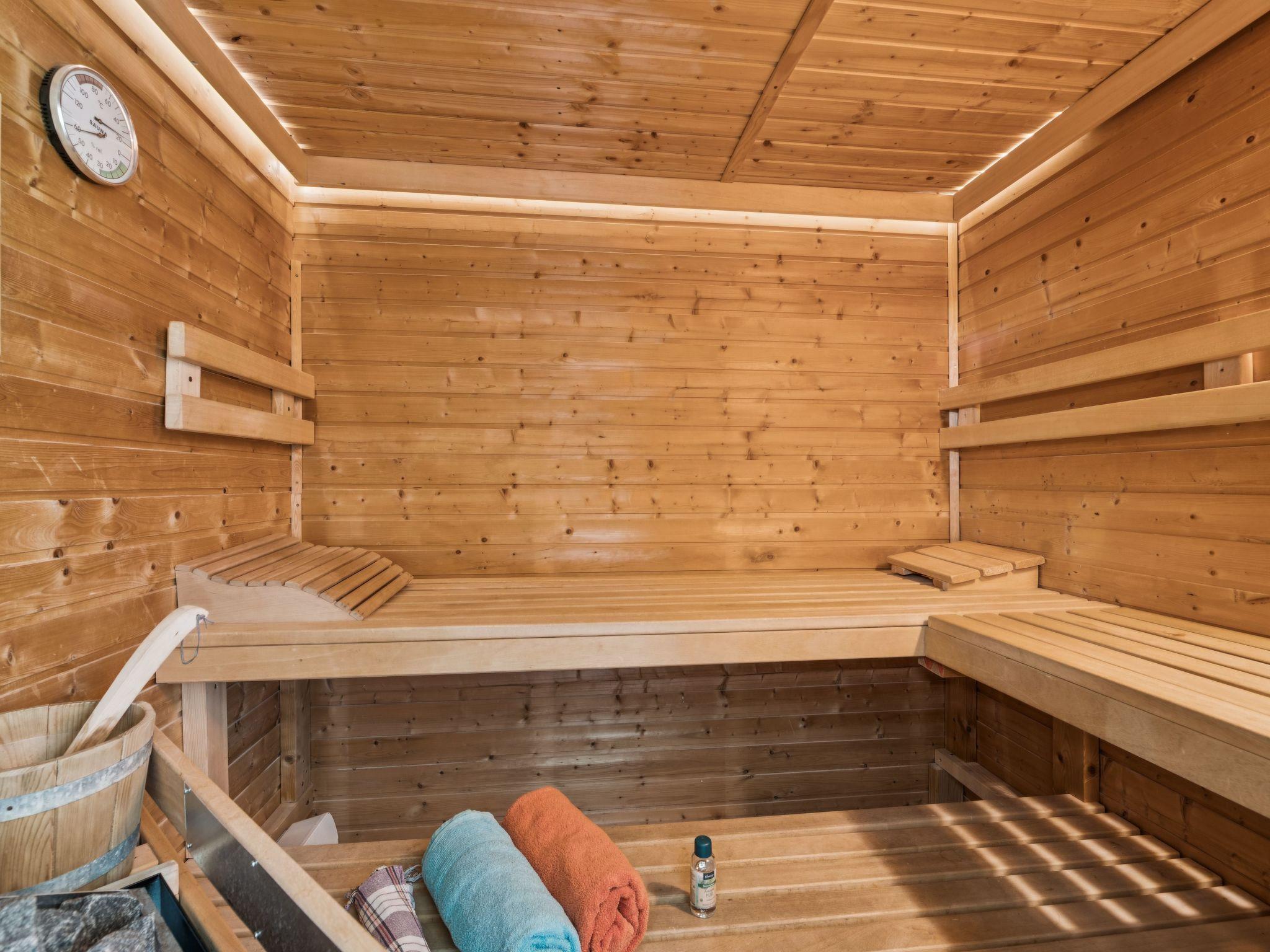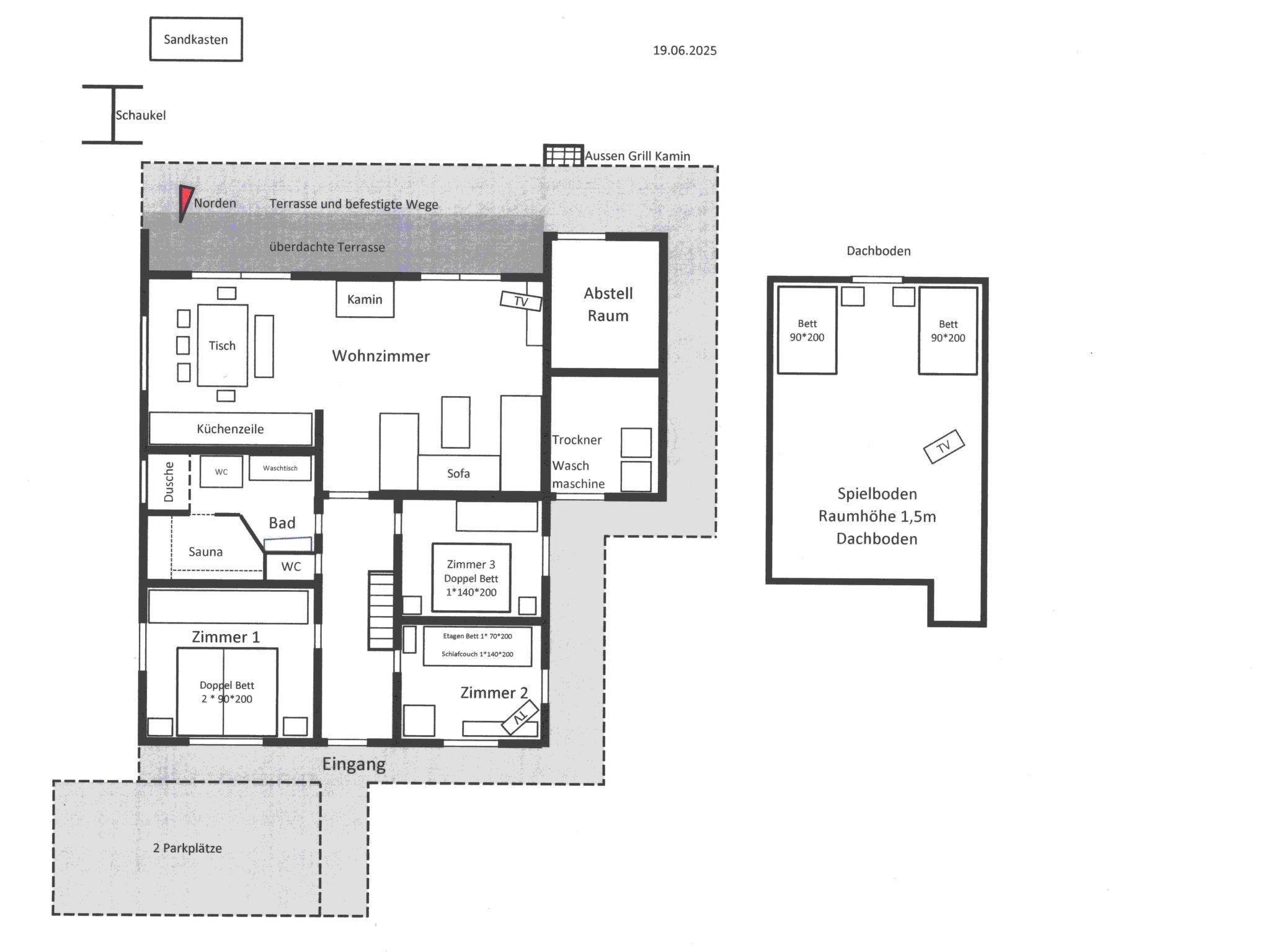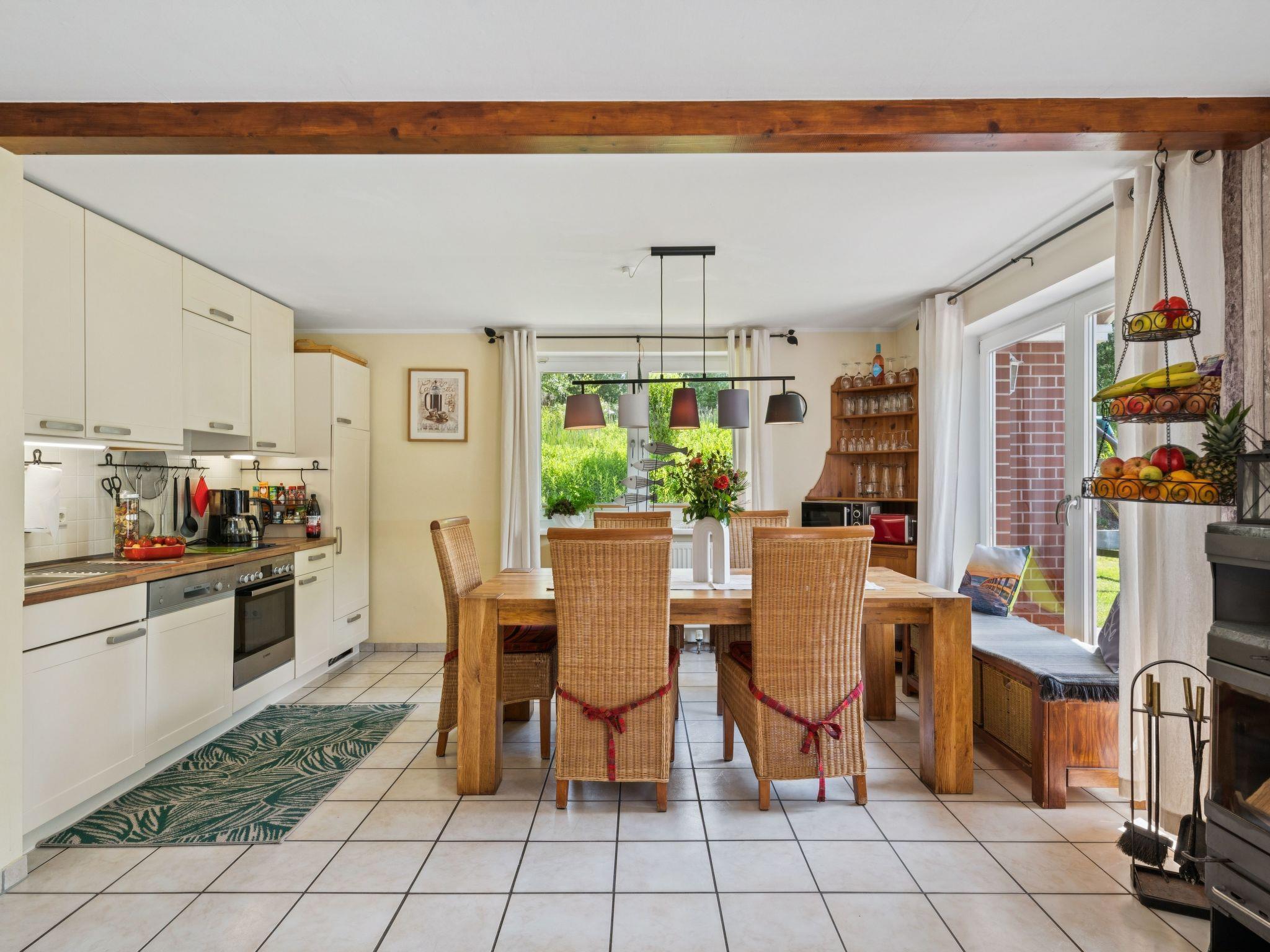 Inside, you will find a large living area with a cosy wood-burning stove, a real leather couch and a 42-inch LED TV, ideal for relaxing evenings. The centrepiece of the house is the wellness bathroom with a sauna that can accommodate up to four people, complemented by a guest WC. Three tastefully furnished bedrooms and a play loft provide ample space for peace and privacy. Underfloor heating, a comprehensive selection of games and a fibre-optic WLAN connection add to the sense of well-being. The kitchen is fully equipped and a storage room with washing machine and tumble dryer round off the offer.