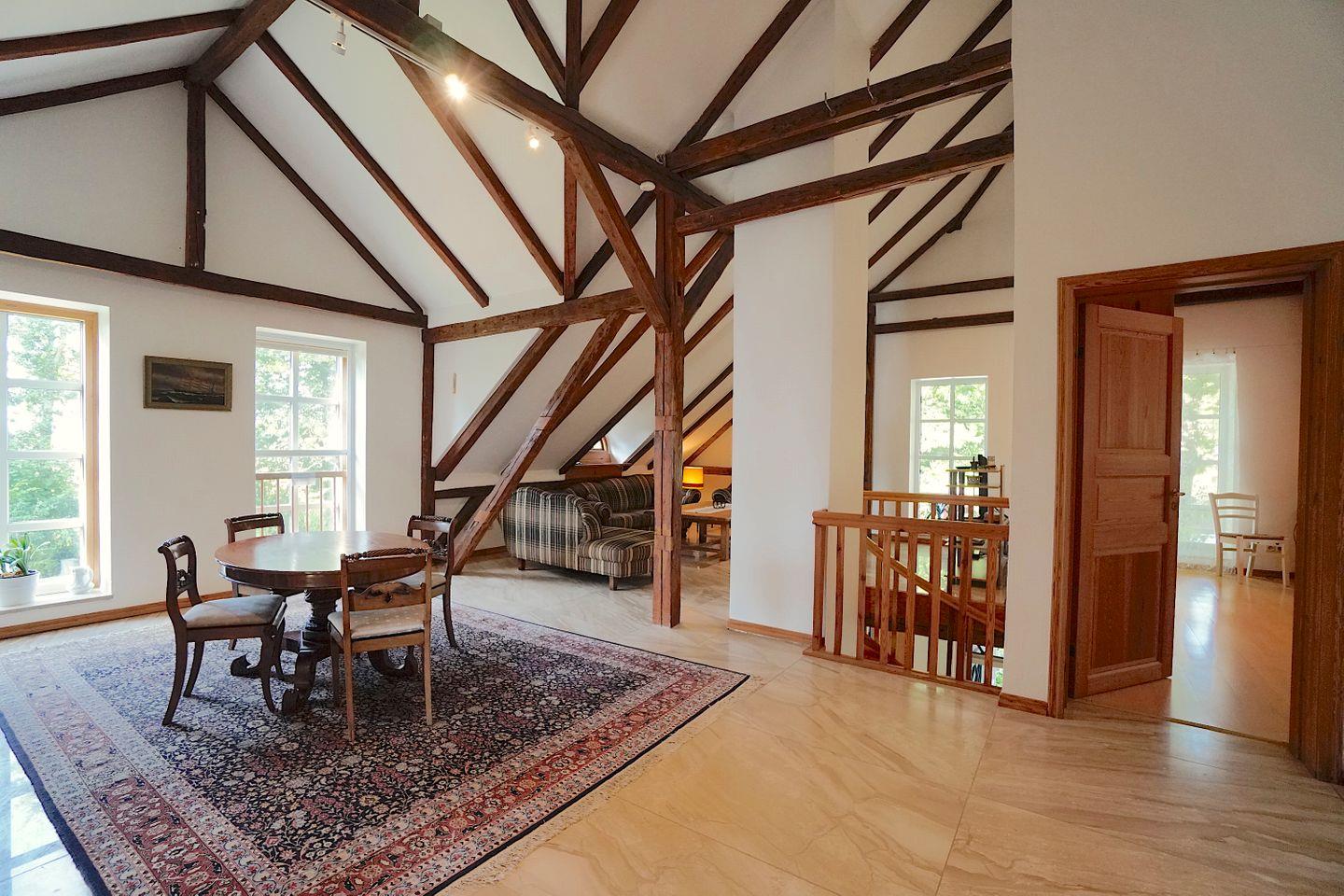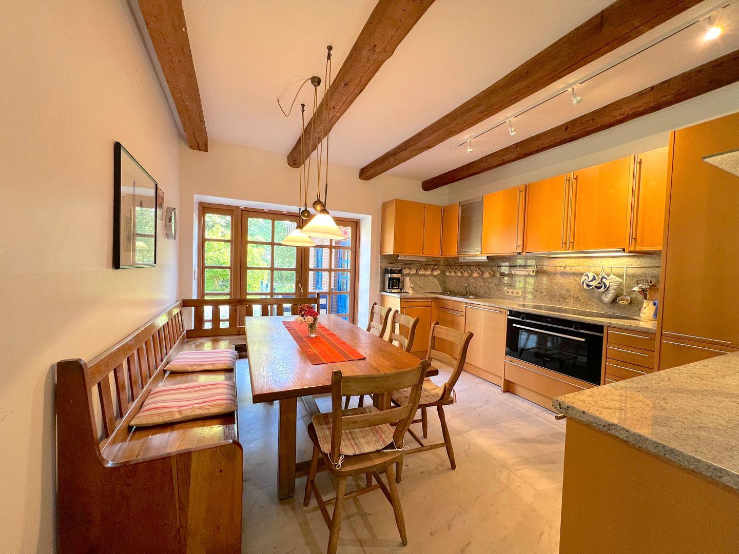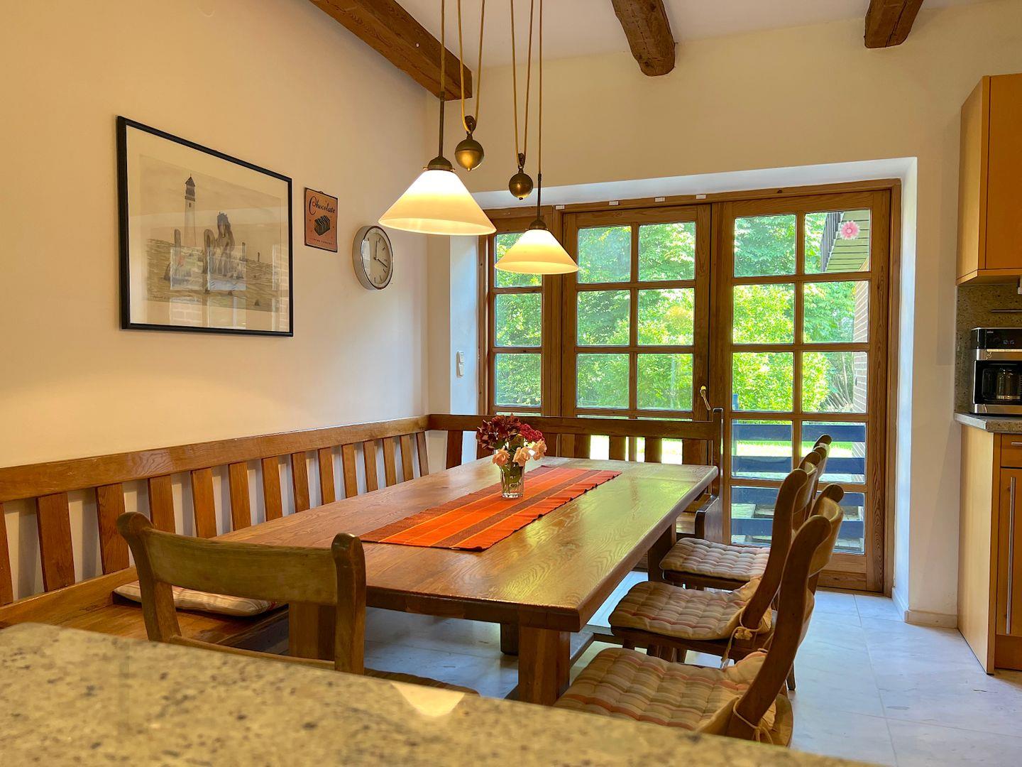Im Erdgeschoss befindet sich ein riesiger Wohn- Essbereich, optisch unterteilt durch den mittig platzierten Kamin. Die große Wohnküche mit Blick auf den Karpfenteich und den Garten greift mit der rustikalen Eckbank das Hofgefühl auf und bietet ausreichend Fläche zum Speisen und Spielen.