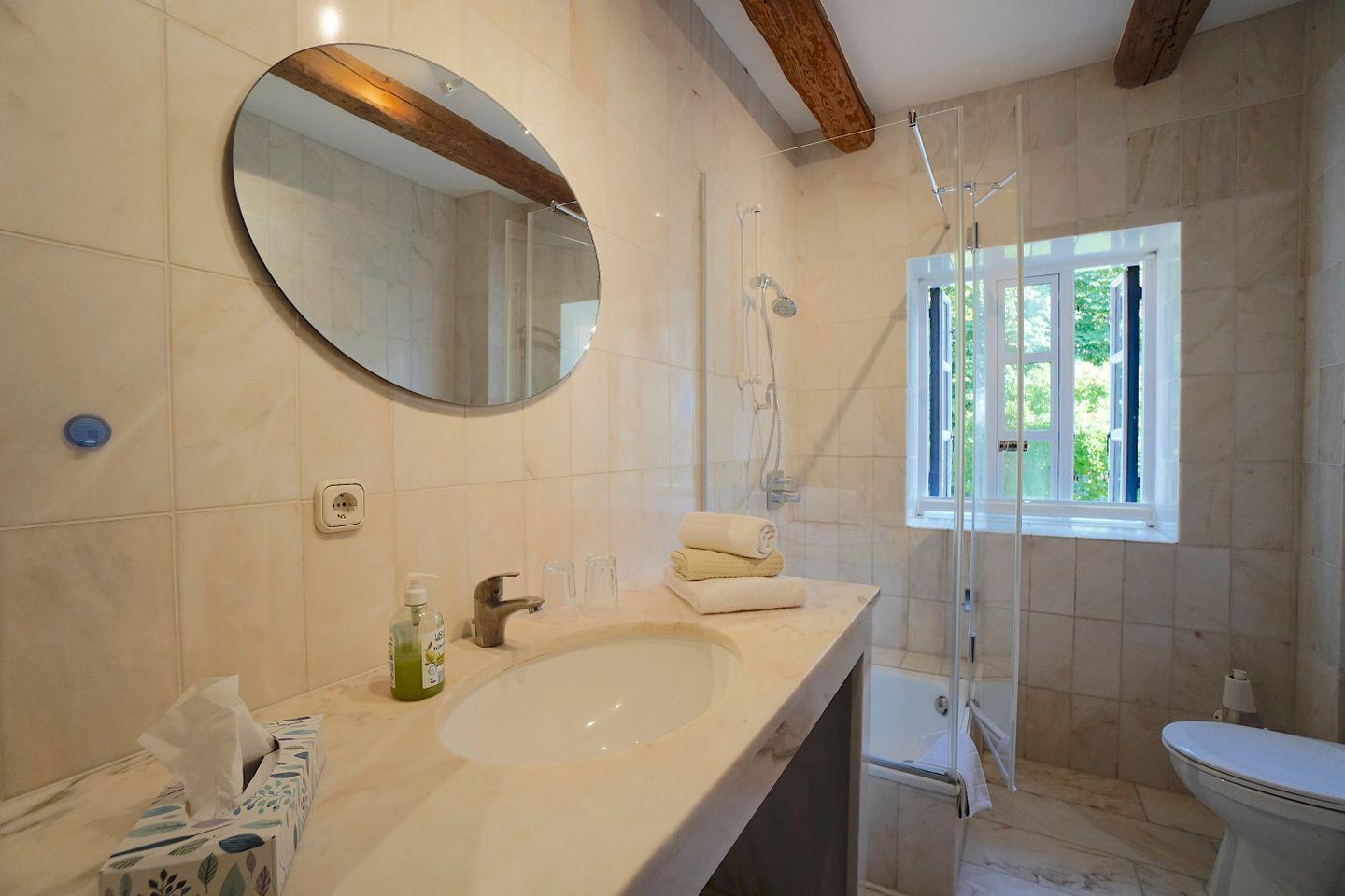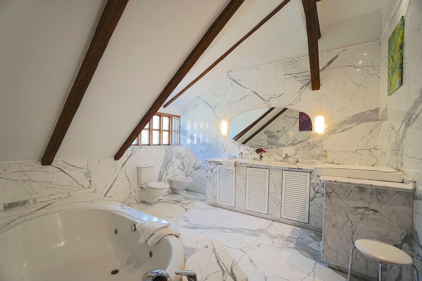 Sowohl vom Flur als auch vom Hauptschlafzimmer (mit Fernseher) geht das hochwertige Marmorbad mit Badewanne ab, hier wird das Zähneputzen zum Erlebnis.