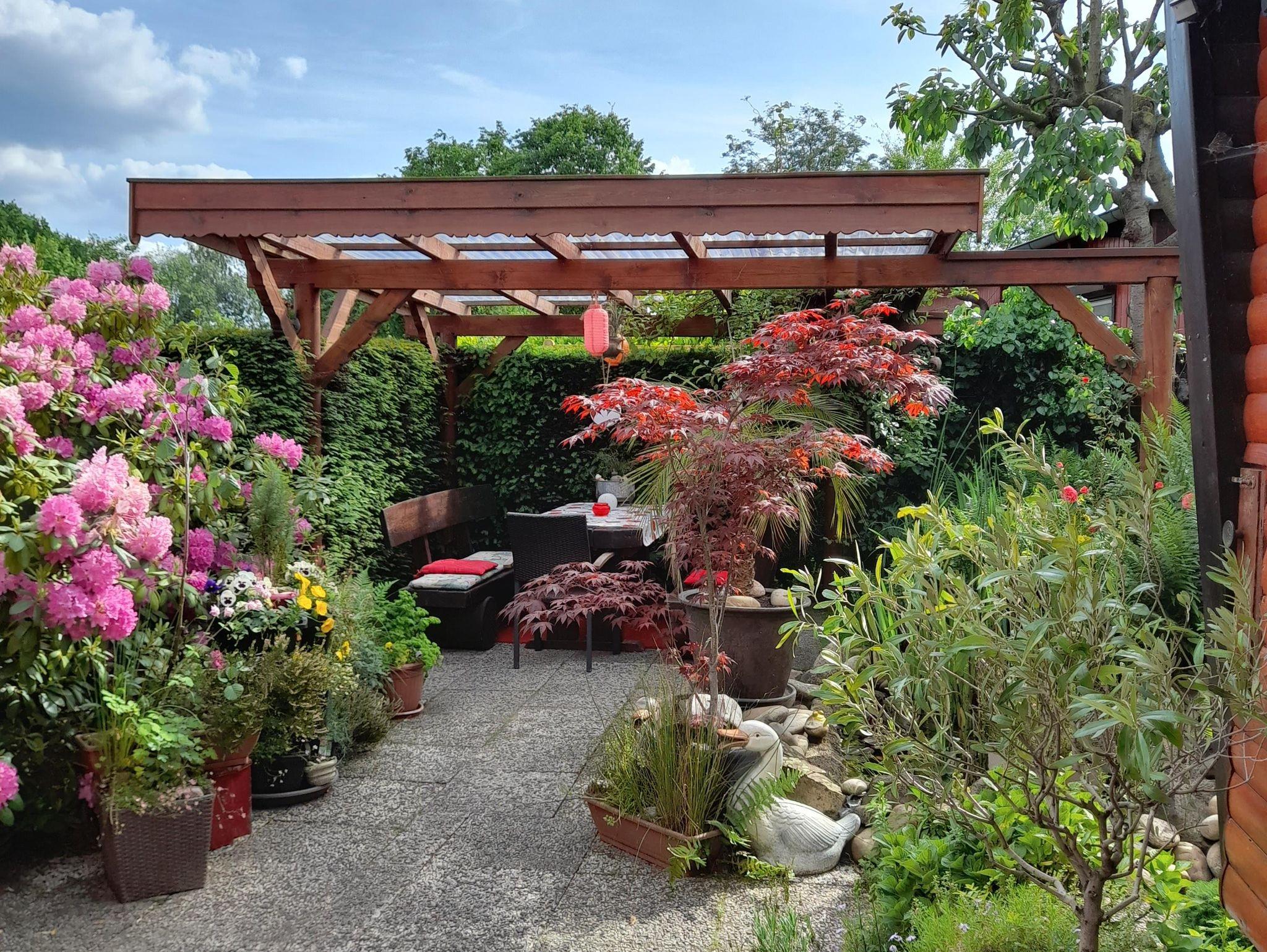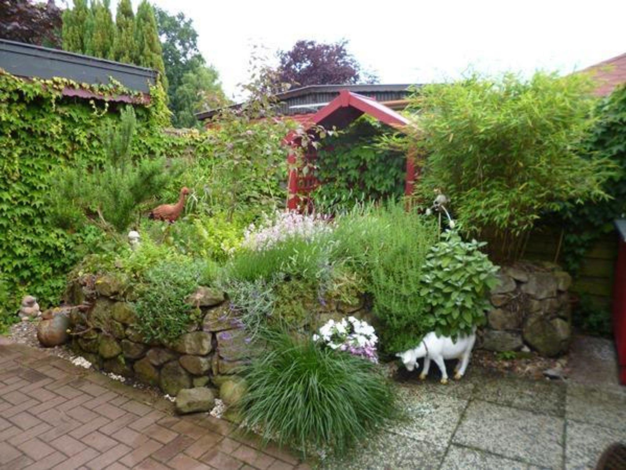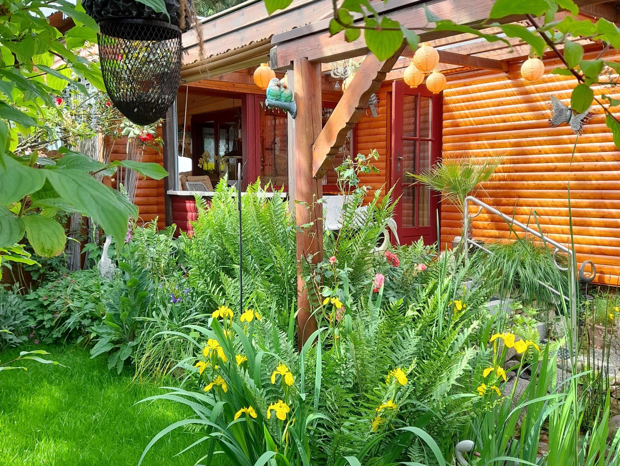 Im Eingangsbereich zum FH empfängt Sie gleich ein Kräutergarten, dessen Kräuter mitbenutzt werden können. Wenn Sie entspannt auf der überdachten Terrasse sitzen, gucken Sie auf einen kleinen Wasserlauf, der in den kleinen angrenzenden Teich führt und können den freien Blick über das Gartentörchen, über die Wiese zum See genießen. Auch der Freisitz ist nicht nur urig, sondern auch überdacht und vor Blicken von außen geschützt.