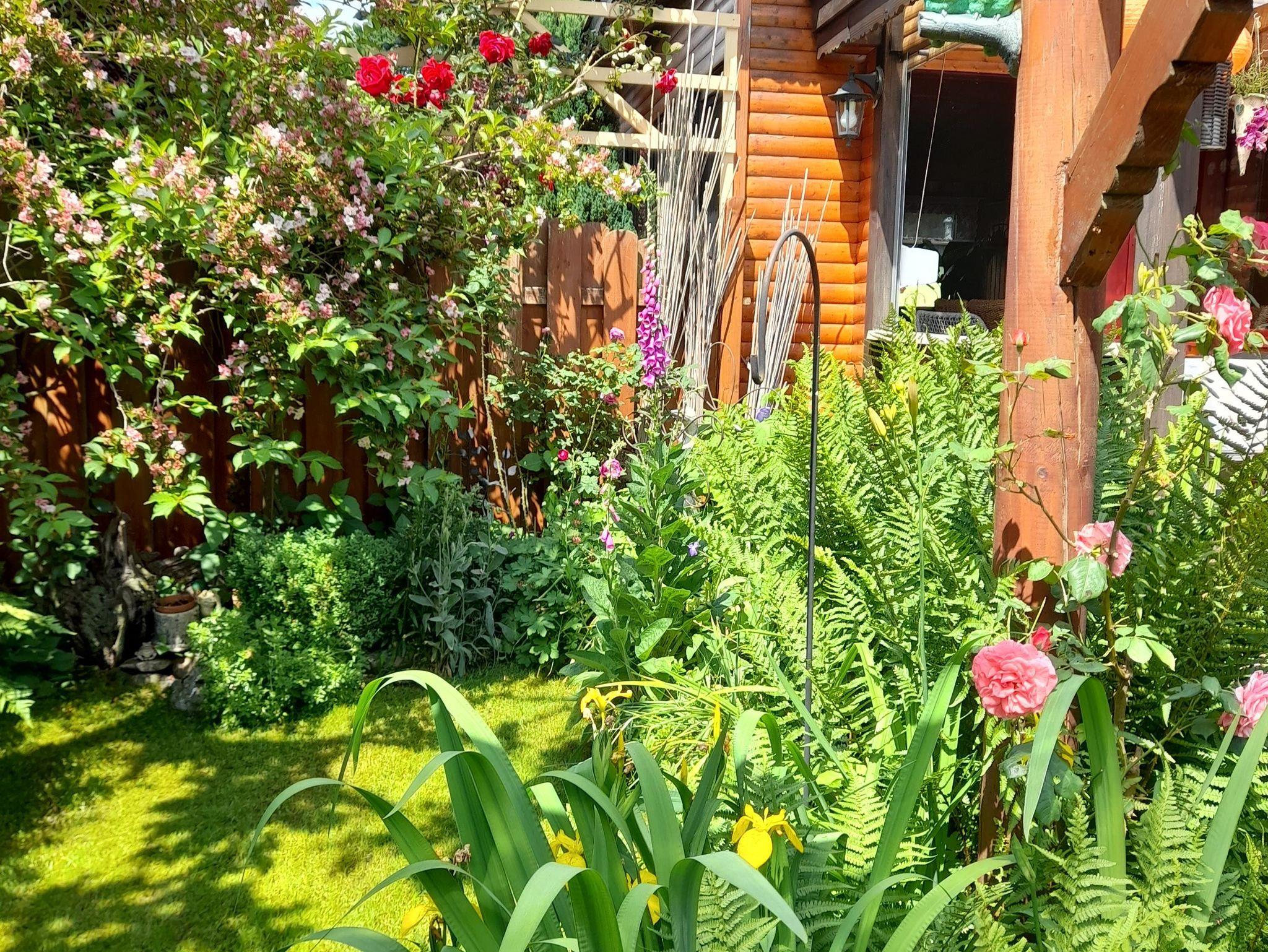 Im Garten gibt es einen überdachten Freisitz mit rustikalem Tisch und 2 Bänken, einen kl. Teich mit Wasserfall, der von der überdachten Terrasse (10 m² incl. Treppenzugang) herunter in den Teich mündet. Im Eingangsbereich des Grundstücks empfängt Sie ein gemütliches Atrium mit Kräutergarten. Für Ihr Auto steht eine große Parkfläche am Ferienhaus zur Verfügung.