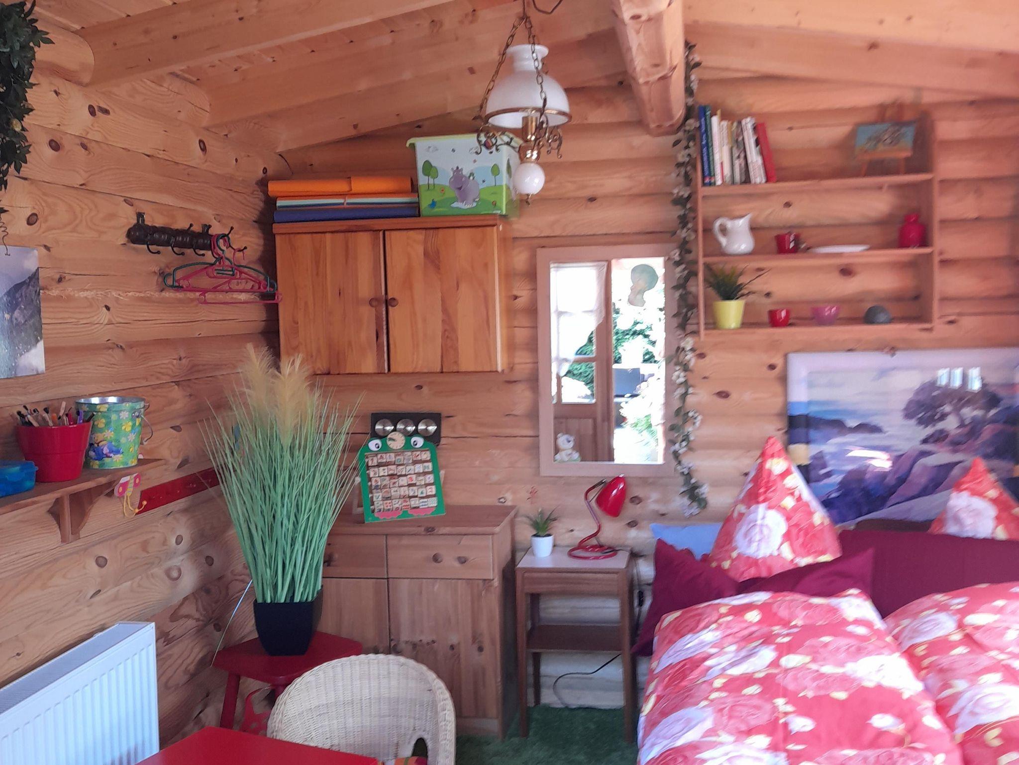 Ein kleines Schlafhäuschen (Nebengebäude) ist ca. 3 m vom Haupthaus entfernt und bietet 2 Schlafplätze, ist beheizbar und gut für Kinder oder auch Erwachsene geeignet, die im Sommer der Natur noch näher sein wollen. Angrenzend der Anbau, mit Waschmaschine, einem zweiten Kühlschrank, auch mit Kühlfach sowie einer Waschmaschine.