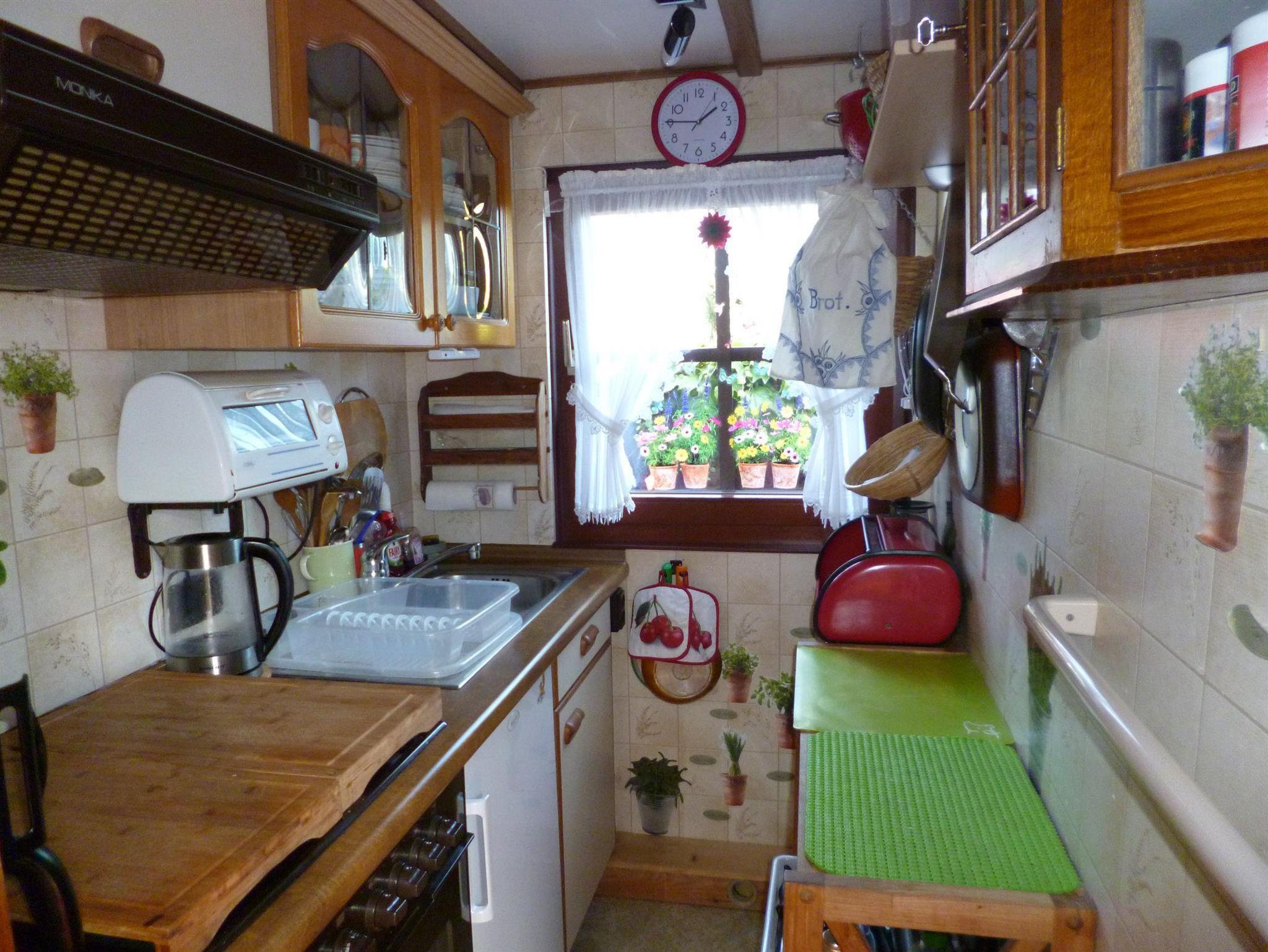 Küche: Küchenzeile mit Backofen, 4 fl. Gasherd + Dunstabzugshaube, kl. Grill,2 Kühlschränke mit Tiefkühlfach, extra Regal (f. Zubereitung Essen), Kaffeemaschine m. Thermoskanne, Toaster, Wasserkocher, Küchenwaage, komplette Ausstattung mit Ess- und Kochgeschirr und div. zahlreichen Gläsern sowie Grundausstattung von Gewürzen, Mehl, Salz, Zucker etc. vorhanden. Ebenso Spül- und Putzmittel. Für den/die „KüchenmeisterIn“ ein kl. Küchenradio.