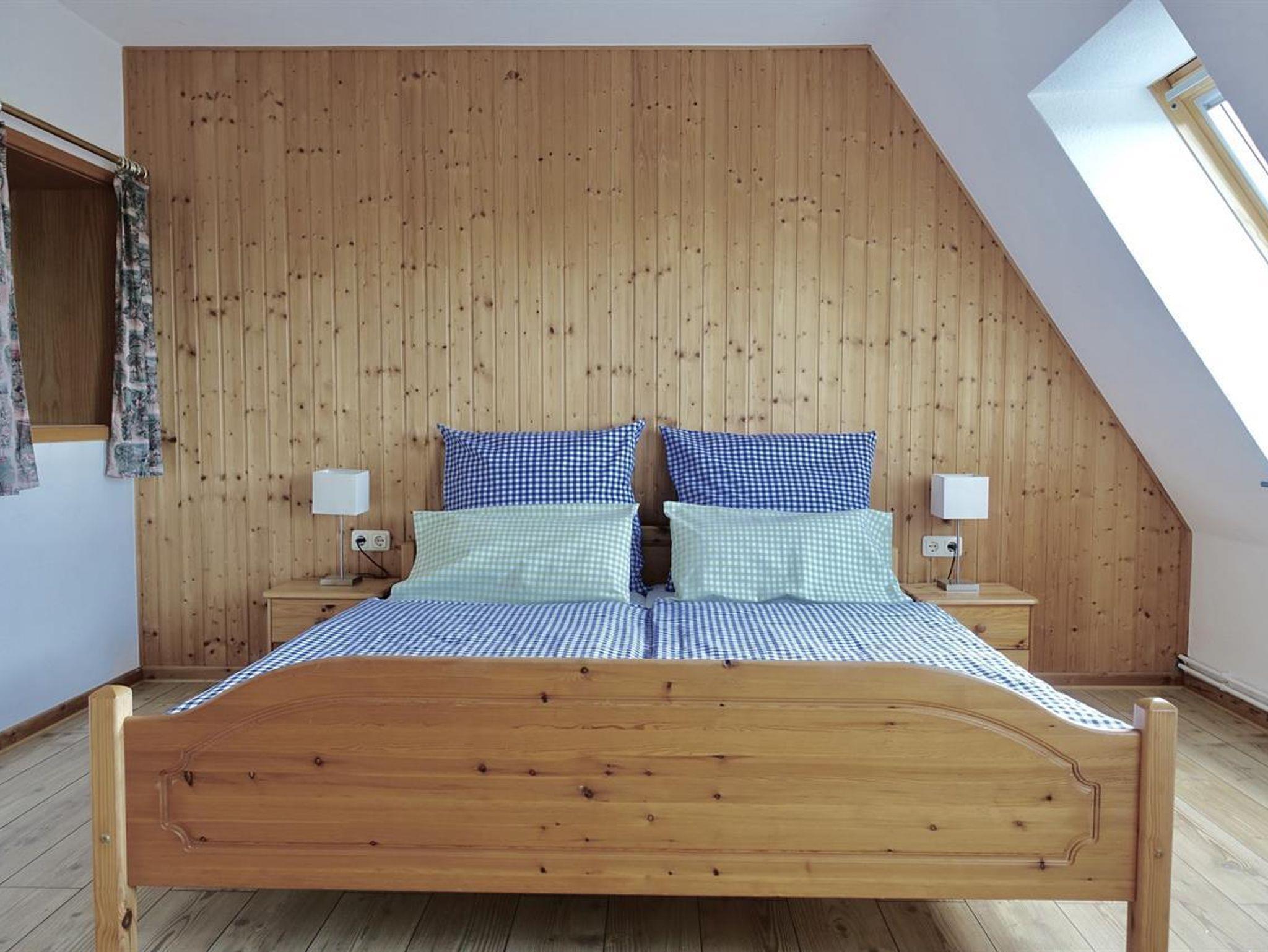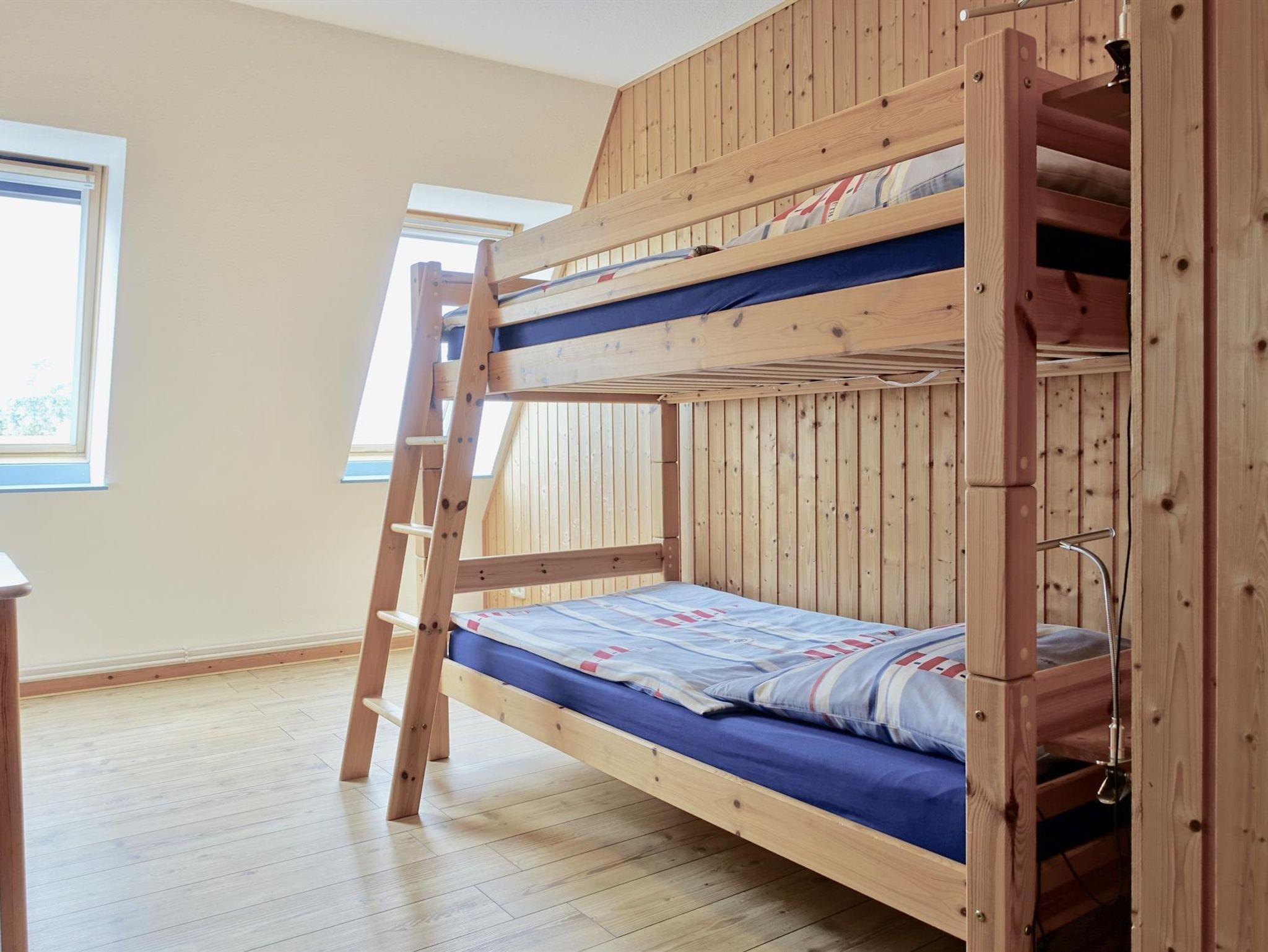 Im Obergeschoss finden Sie die beiden Schlafräume, eines mit einem Doppelbett (2 x 1,80m) und ein weiteres Schlafzimmer mit einem Etagenbett und einem Einzelbett. Ebenfalls im Obergeschoss ist das zweite Badezimmer mit Dusche und WC.
