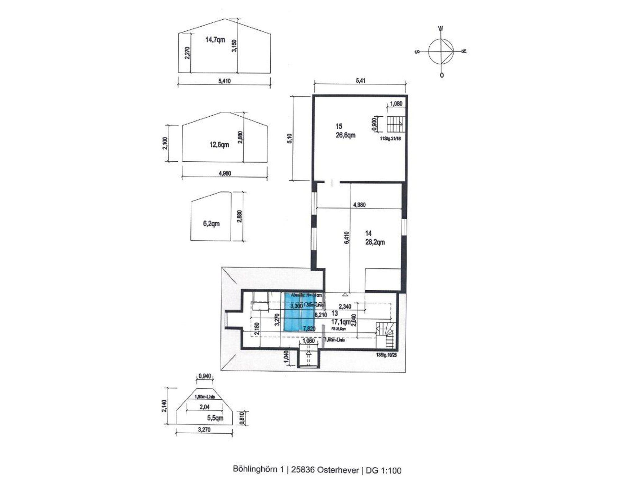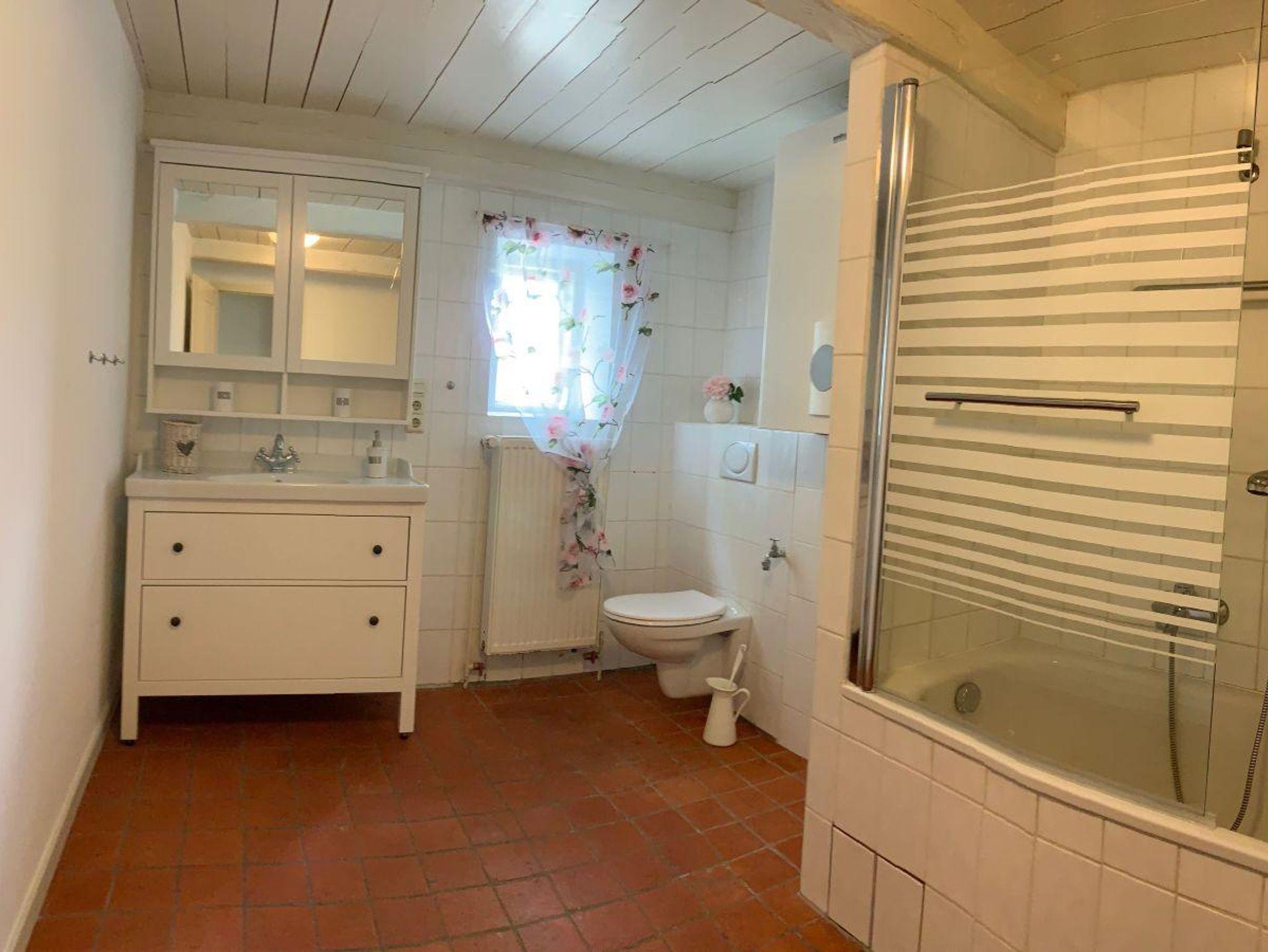 Es gibt zwei Bäder, die alle mit einer Dusche ausgestattet sind. Eins hat eine Badewanne. Zusätzlich gibt es im Untergeschoss einen Wellnessbereich, der aus einer Sauna, einem Whirlpool und einem Duschbad besteht. Die große Terrasse liegt im Süden.