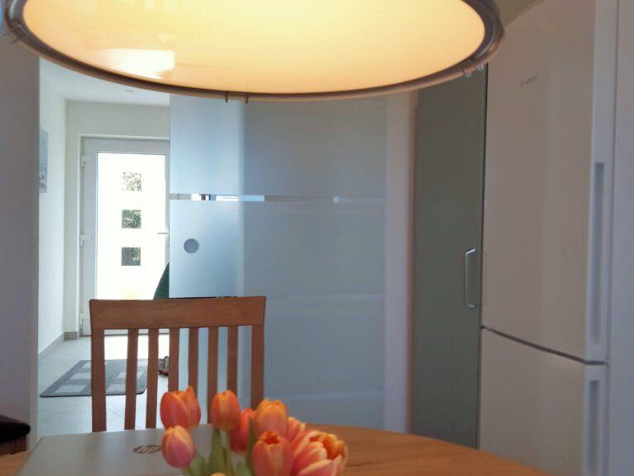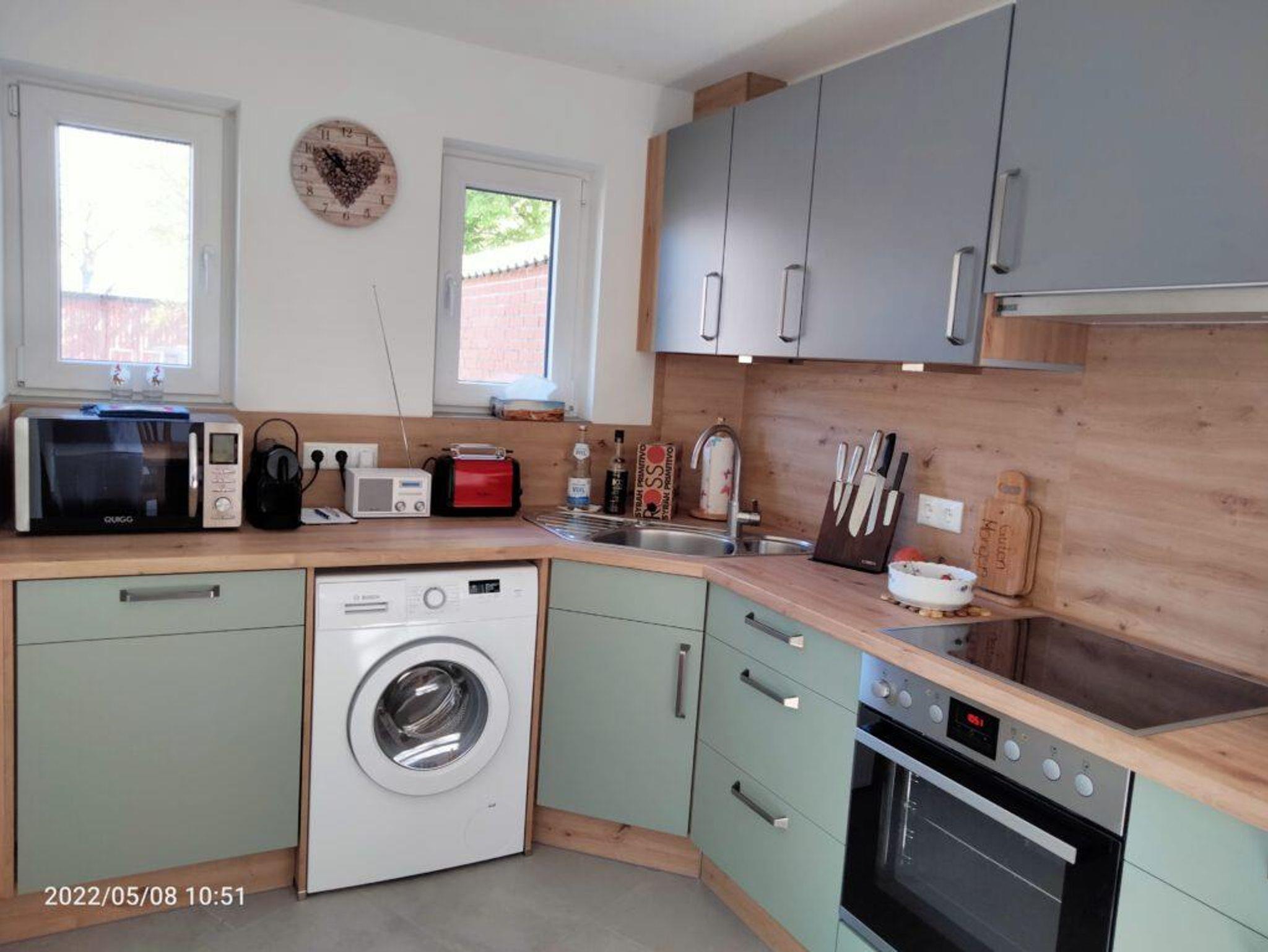Küche mit Ausgang zur Terrasse, Essbereich. Die Küche ist ausgestattet mit Cerankochfeld, Backofen, Kühl-Gefrierkombination, Mikrowelle, Geschirrspülmaschine und Waschmaschine. Bügelbrett und Bügeleisen vorhanden.