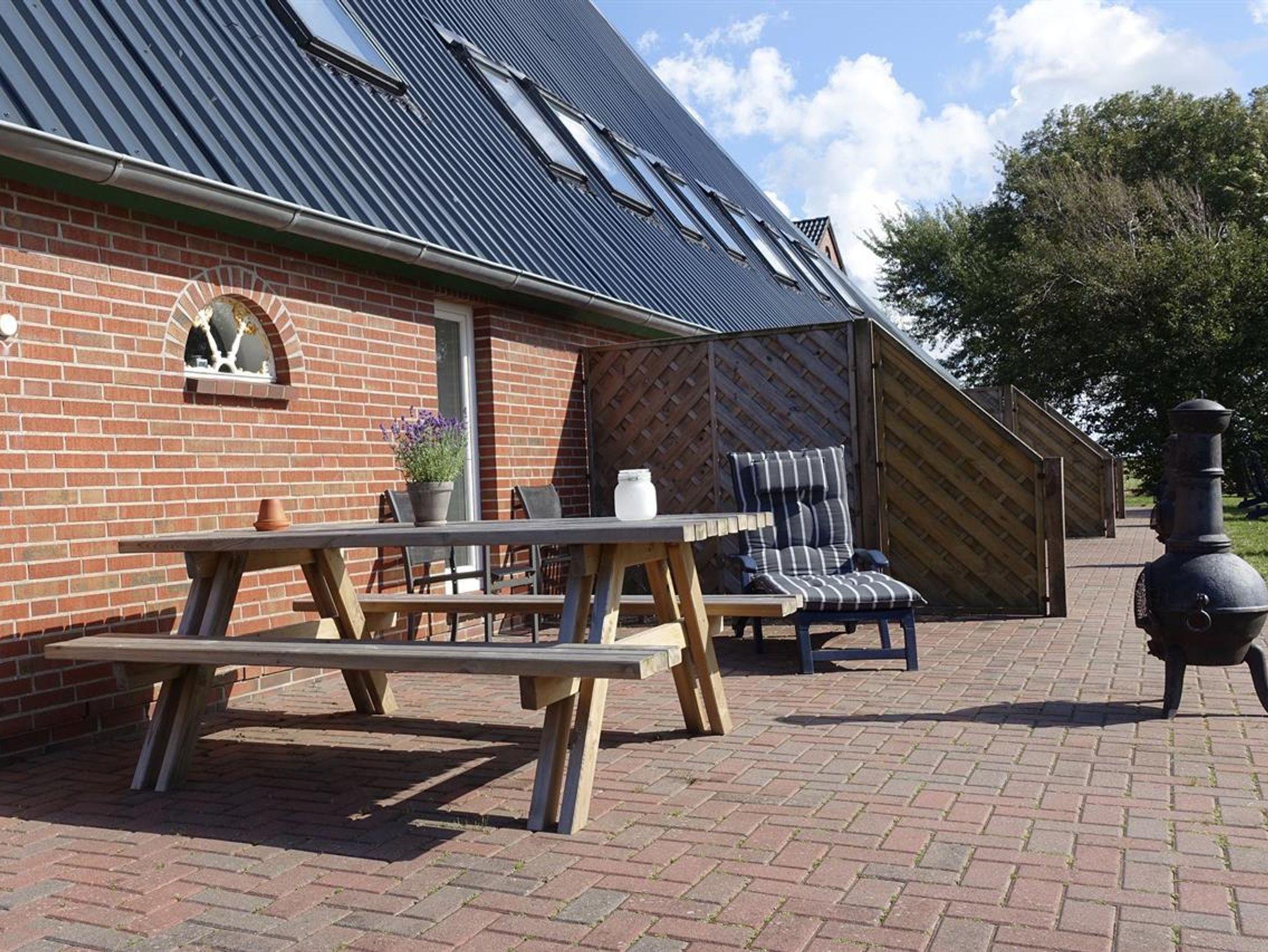 Vom Wohnbereich aus gelangen Sie auf Ihre eigene Terrasse mit Gartenmöbeln und Grillmöglichkeit. Der Blick geht in den Garten, über die Felder bis zum Deich am Wattenmeer. Nachts leuchtet am Horizont der bekannte Leuchtturm von Westerhever.