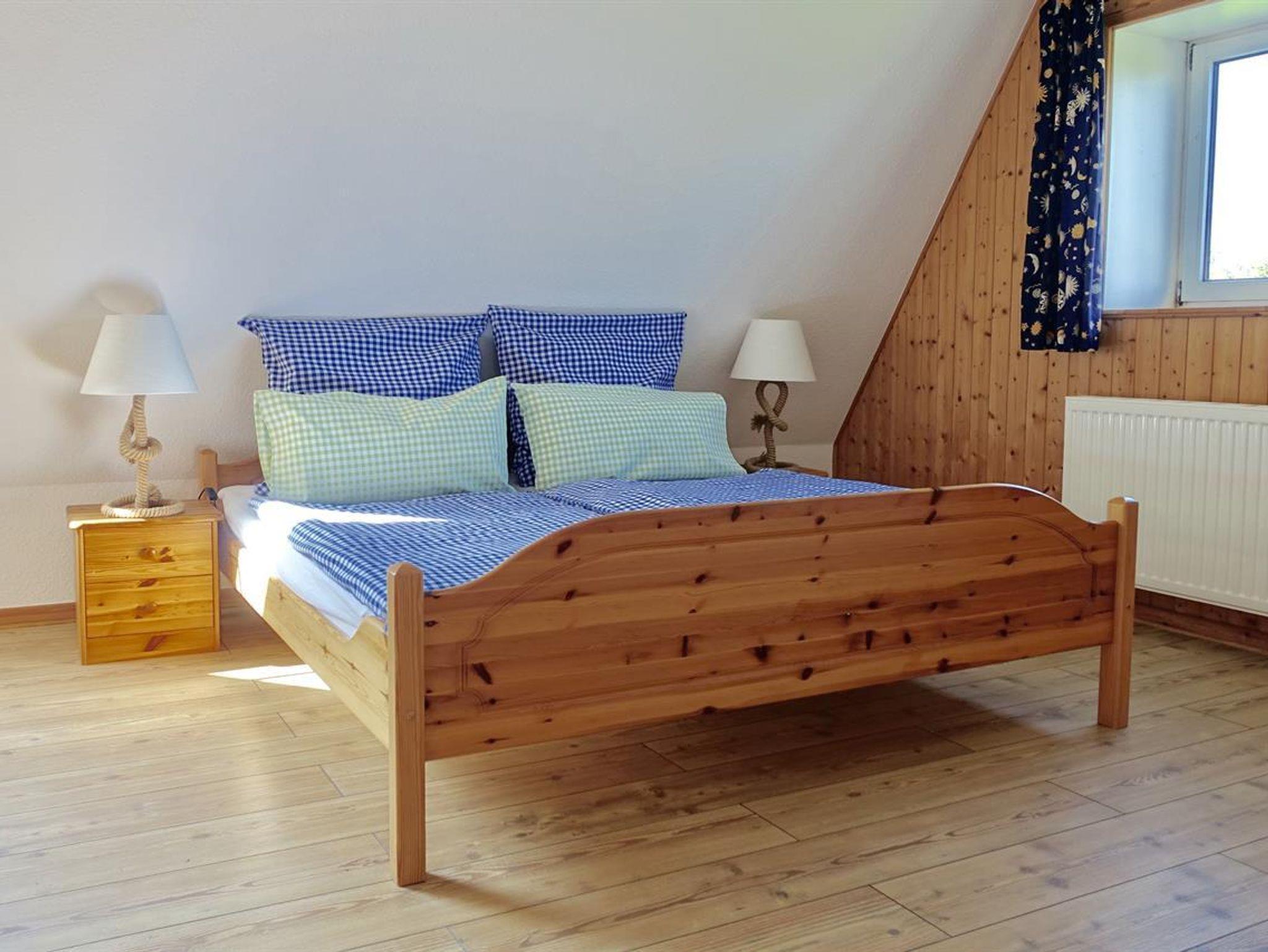 Im Erdgeschoss befindet sich eine komplett ausgestattete offene Wohnküche (Backofen, 4-Platten-Herd, Mikrowelle, Kaffeemaschine, Toaster, Geschirrspüler, Kühlschrank) mit Essbereich sowie die großzügige Sitzecke mit TV und Radio/CD-Player. Zudem finden Sie hier ein großes Tageslicht-Badezimmer mit Dusche und WC. Im Obergeschoss liegen die beiden Schlafräume (1 Doppelbett-Zimmer und ein Zimmer mit zwei Einzelbetten).