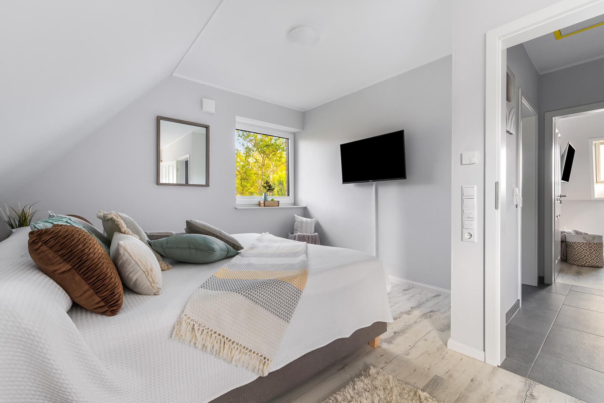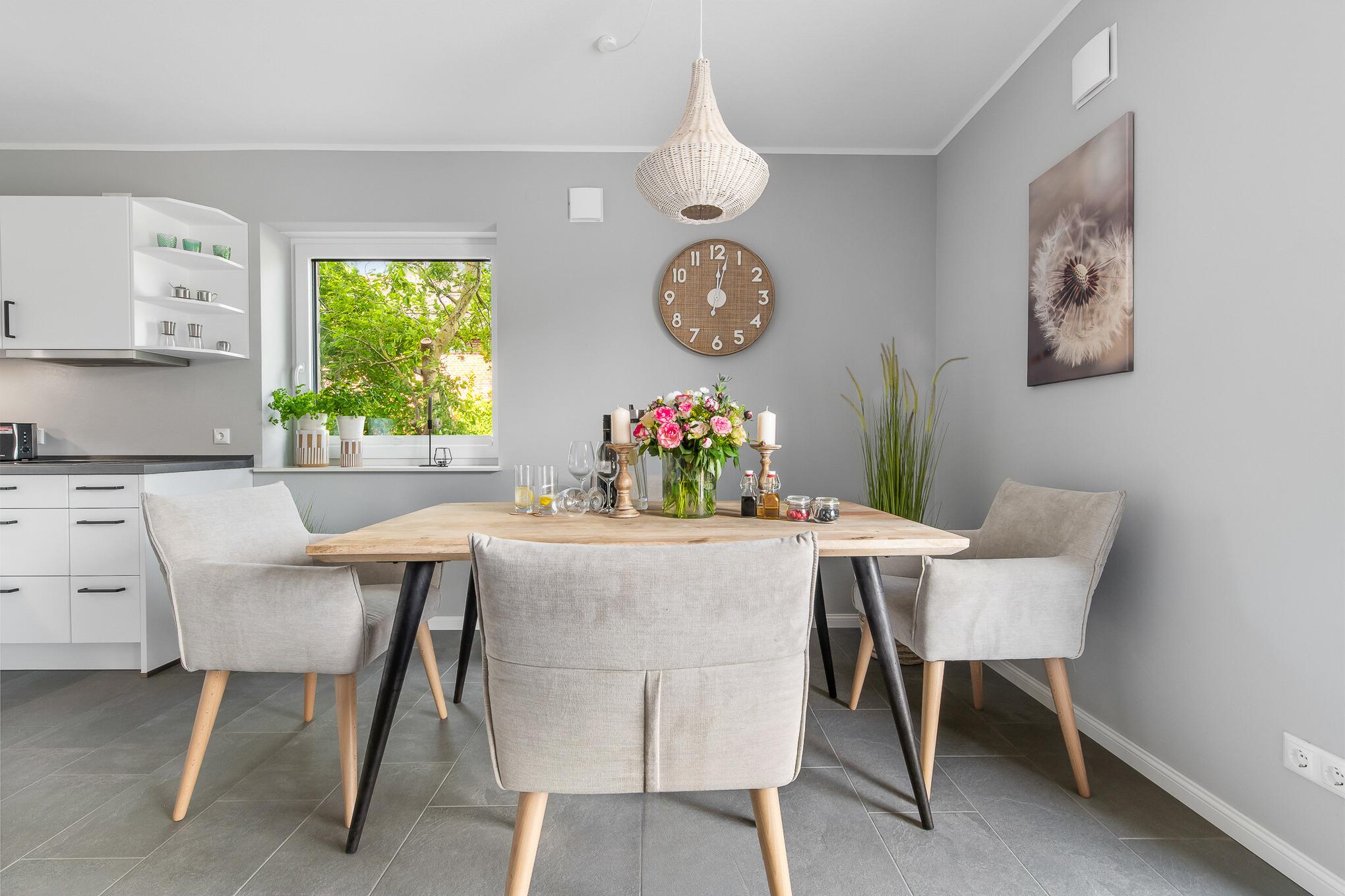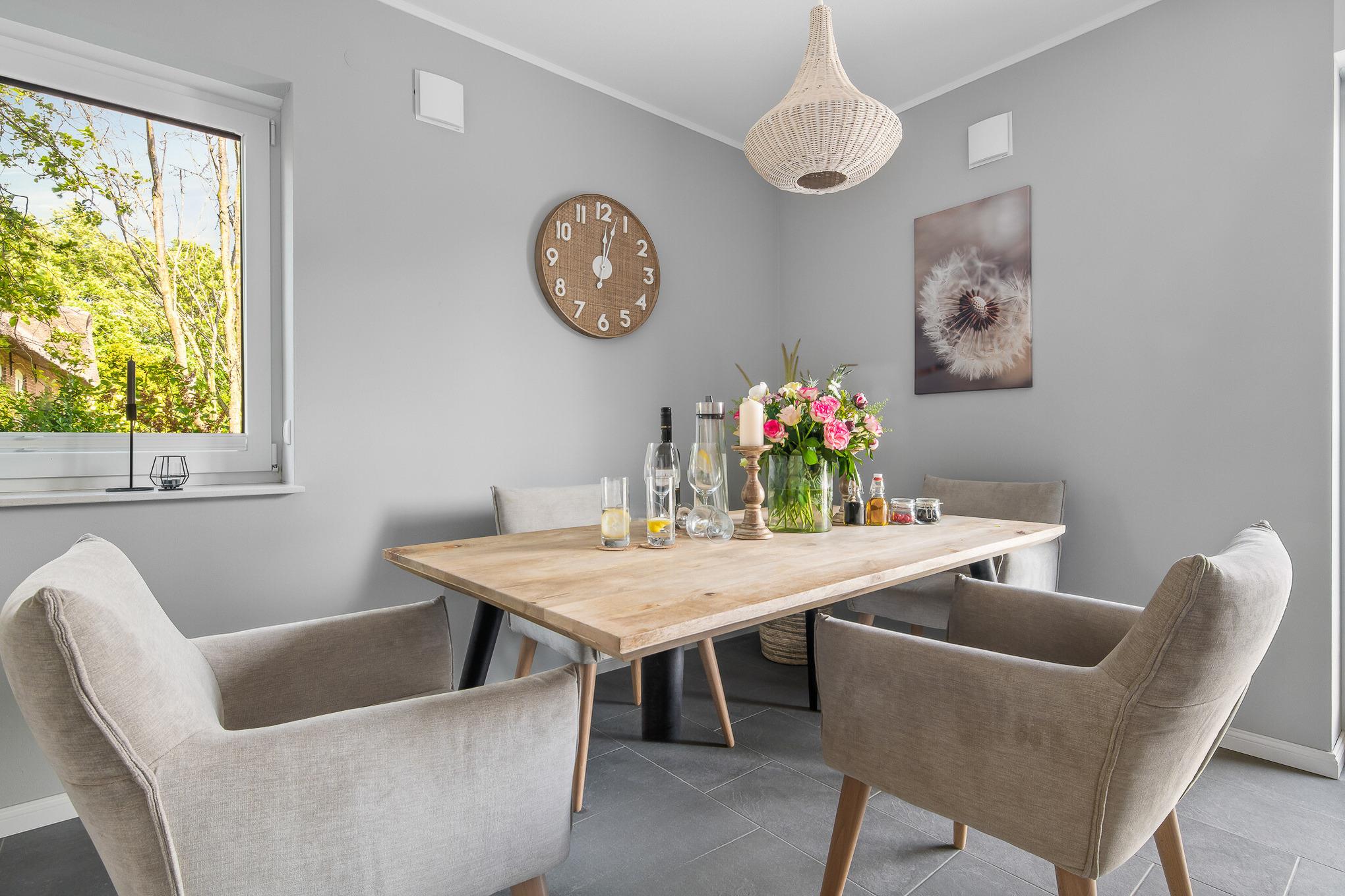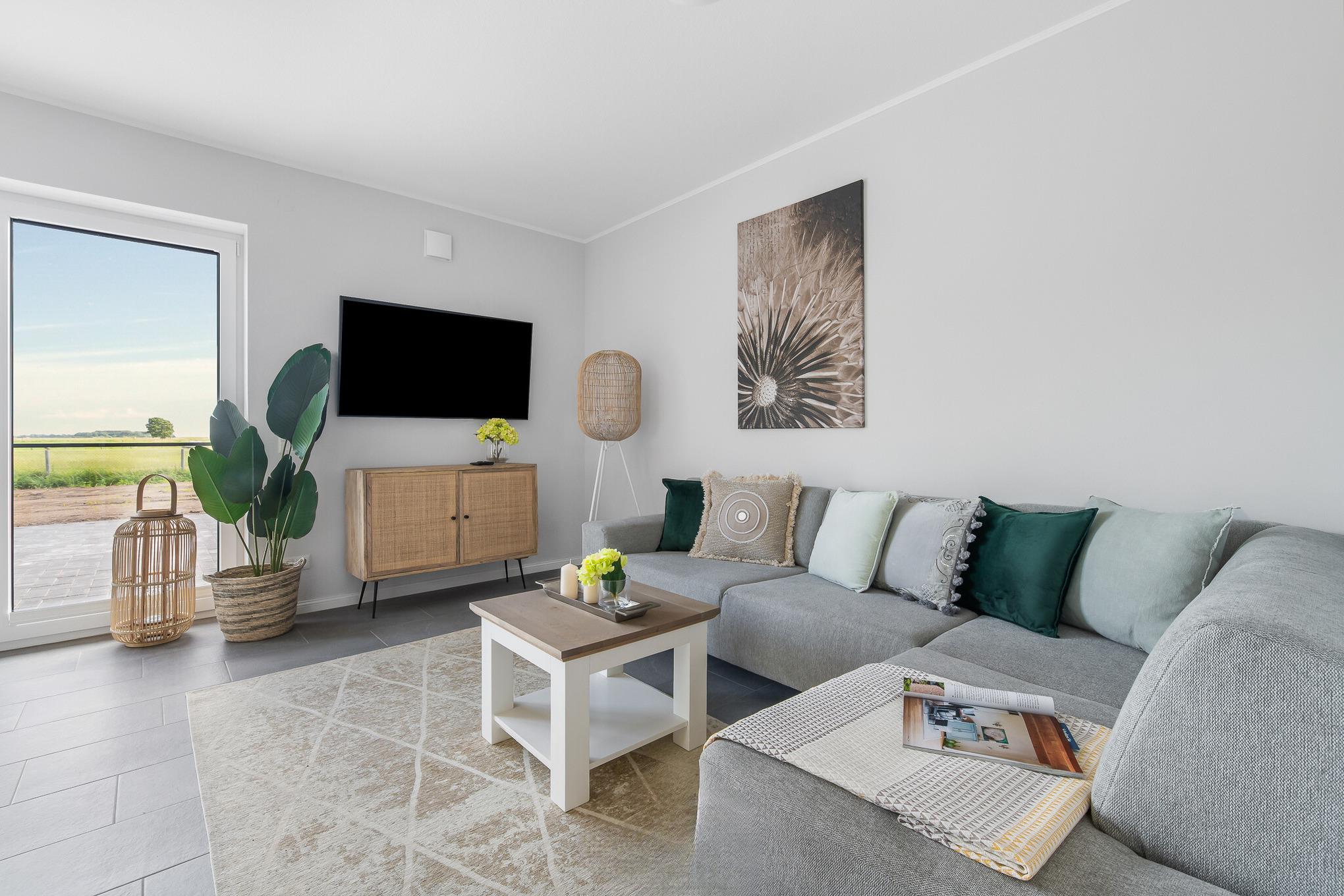 Die elegante Doppelhaushälfte "Deichlöpper" bietet ein hochwertiges und modernes Ambiente, das Ihren Aufenthalt an der Nordsee zu einem unvergesslichen Erlebnis machen wird! Besonders hervorzuheben ist die nachhaltige Bauweise des Hauses. Es entspricht nicht nur dem Standard von KfW 40 plus, sondern bezieht seinen Strom vollständig aus erneuerbaren Energiequellen. Zusätzlich wurde eine Erdwärmepumpe installiert. Der großzügige Wohnbereich ist stilvoll eingerichtet und mit einem Flatscreen-TV ausgestattet. Die separate, moderne Küche bietet alles, was Sie für einen gelungenen Kochabend benötigen. In den beiden Schlafzimmern befinden sich jeweils ein großes Doppelbett sowie ein Flatscreen-TV. Die beiden modernen Bäder verfügen jeweils über eine ebenerdige Dusche. Alle Fenster sind mit elektrischen Aussenrollläden ausgestattet. Zum Haus gehören zudem eine Terrasse, ein großer, komplett eingezäunter Garten und ein Gemeinschaftsgeräteschuppen. Vor dem Haus steht Ihnen ein großzügiger Parkplatz zur Verfügung. Es gibt zusätzlich einen Carport.
