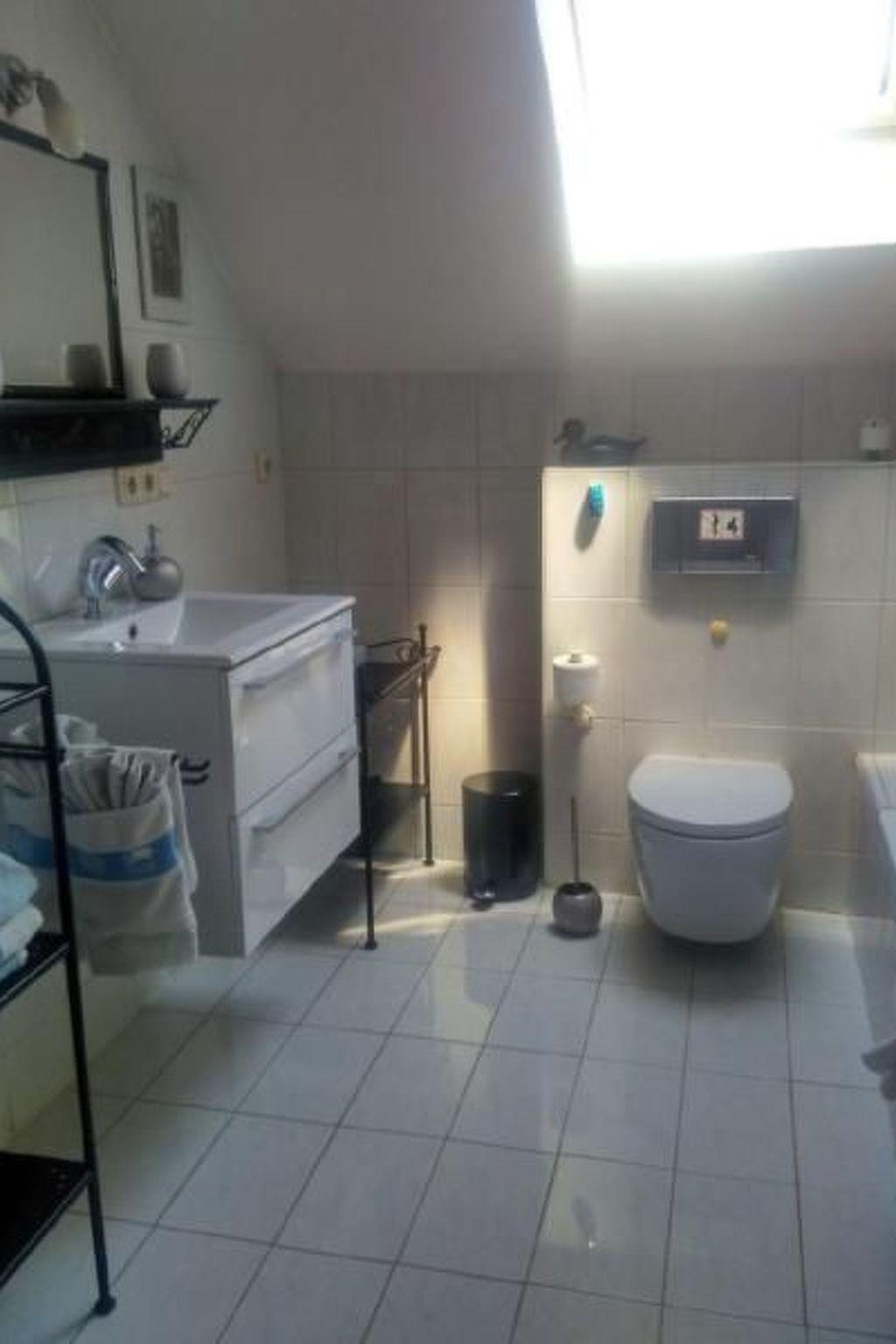 Bathroom with daylight, shower and bathtub, new WC and washbasin with drawers. Shelf for storage. Cupboard with hoover and additional towels. Hairdryer available.
