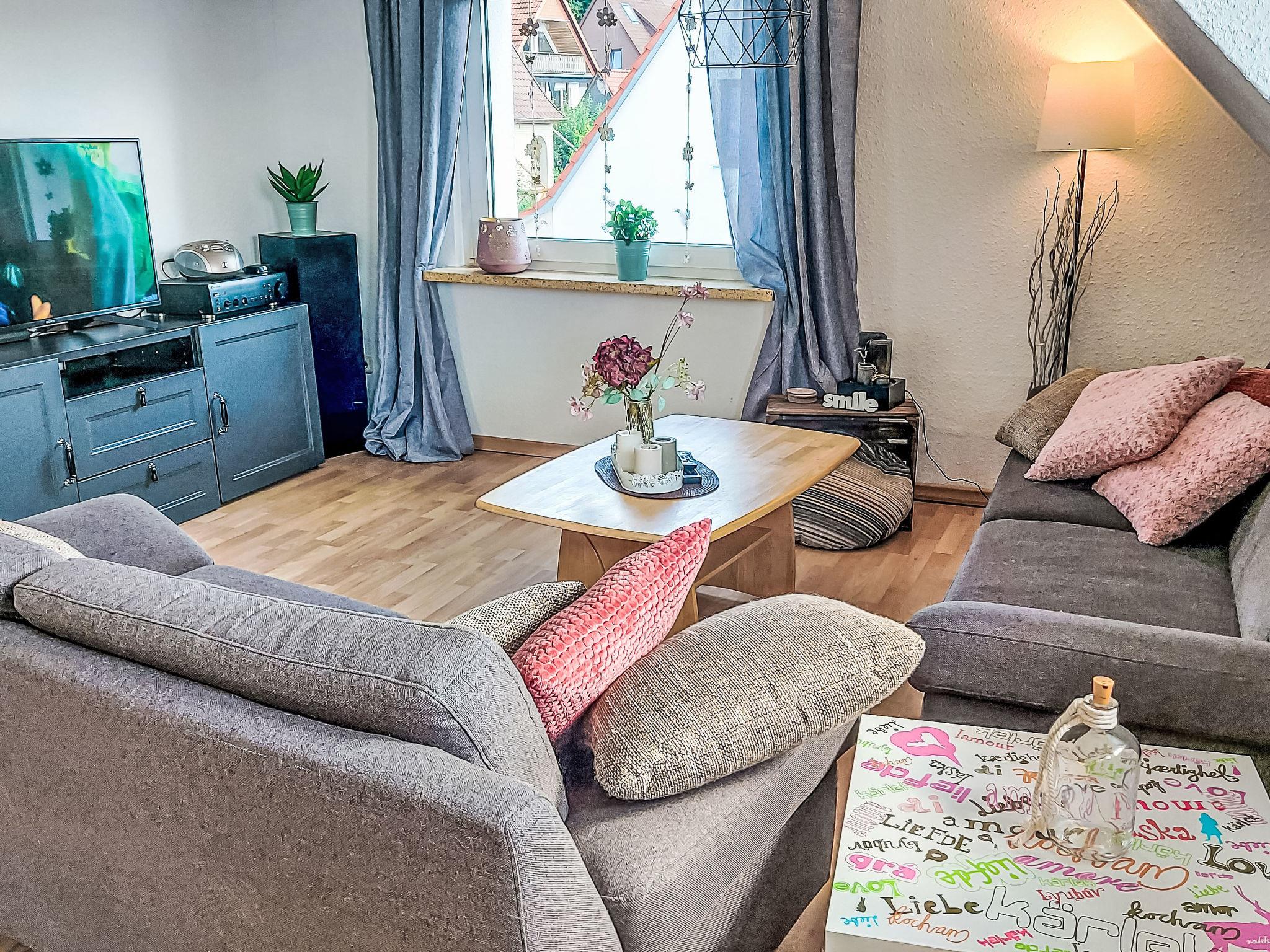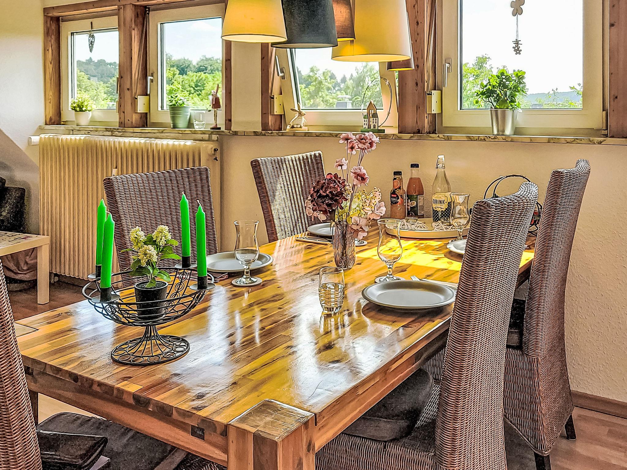 "Phoebe", 3-room apartment 80 m2, on the upper floor. Bright, with sloping ceilings, renovated in 2024, very tasteful and cosy furnishings: living/dining room with satellite TV (flat screen), hi-fi system. Large kitchen (oven, dishwasher, 4 ceramic glass hob hotplates, toaster, kettle, microwave, freezer, electric coffee machine, Capsules for coffee machine (Senseo)) with dining table. Shower/WC. Gas heating. Large terrace. Terrace furniture. Beautiful view of the countryside. Facilities: children's high chair, baby cot, hair dryer. Internet (WiFi, free). Please note: non-smokers only. Maximum 2 pets/ dogs allowed. Smoke alarm, fire extinguisher.