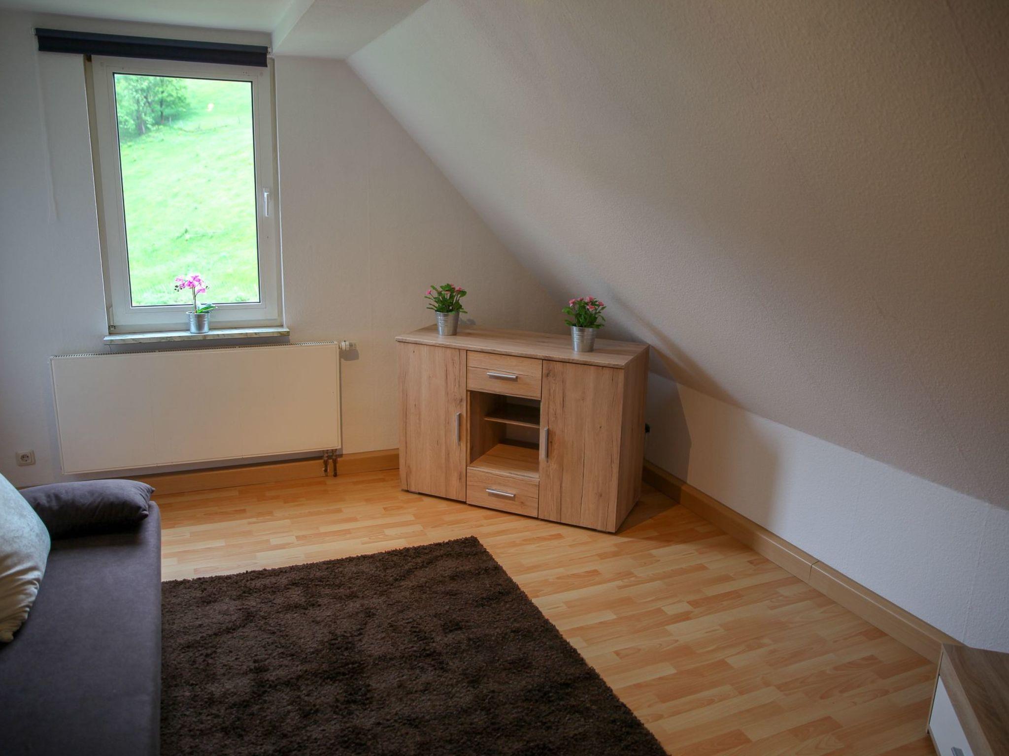 This flat is located on the 2nd floor of a detached house with garden - truly "in the countryside" - directly at the foot of the surrounding mountains before the Lerbacher Serpentinen near the ski slope and NaturErlebnisPark and is divided into a living room with couch, flat screen TV, a bedroom with a double bed (two seven-zone cold foam mattresses 2.00 m x 0.90 m), a bathroom with shower / WC, a hallway with dining table and a modern kitchen.