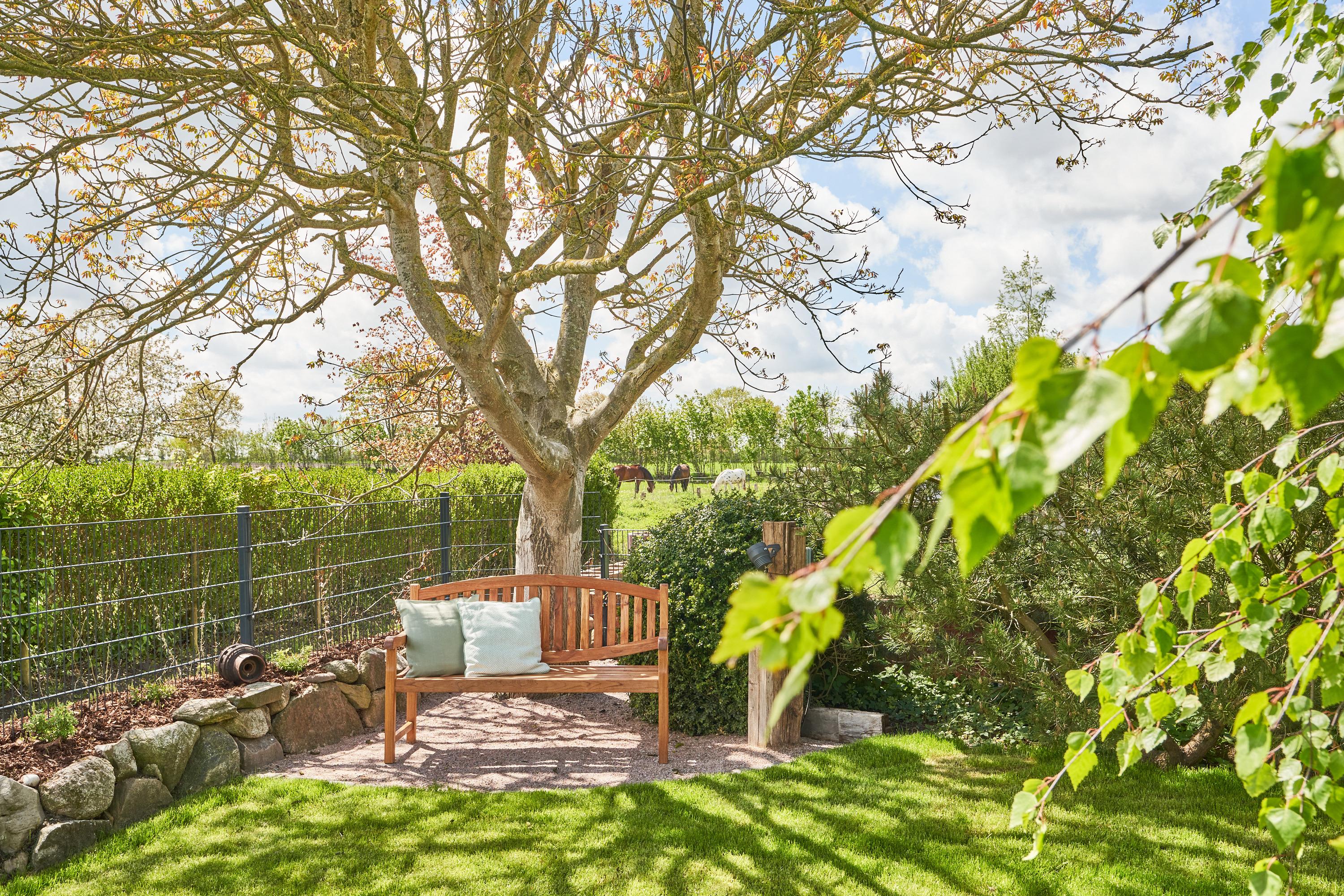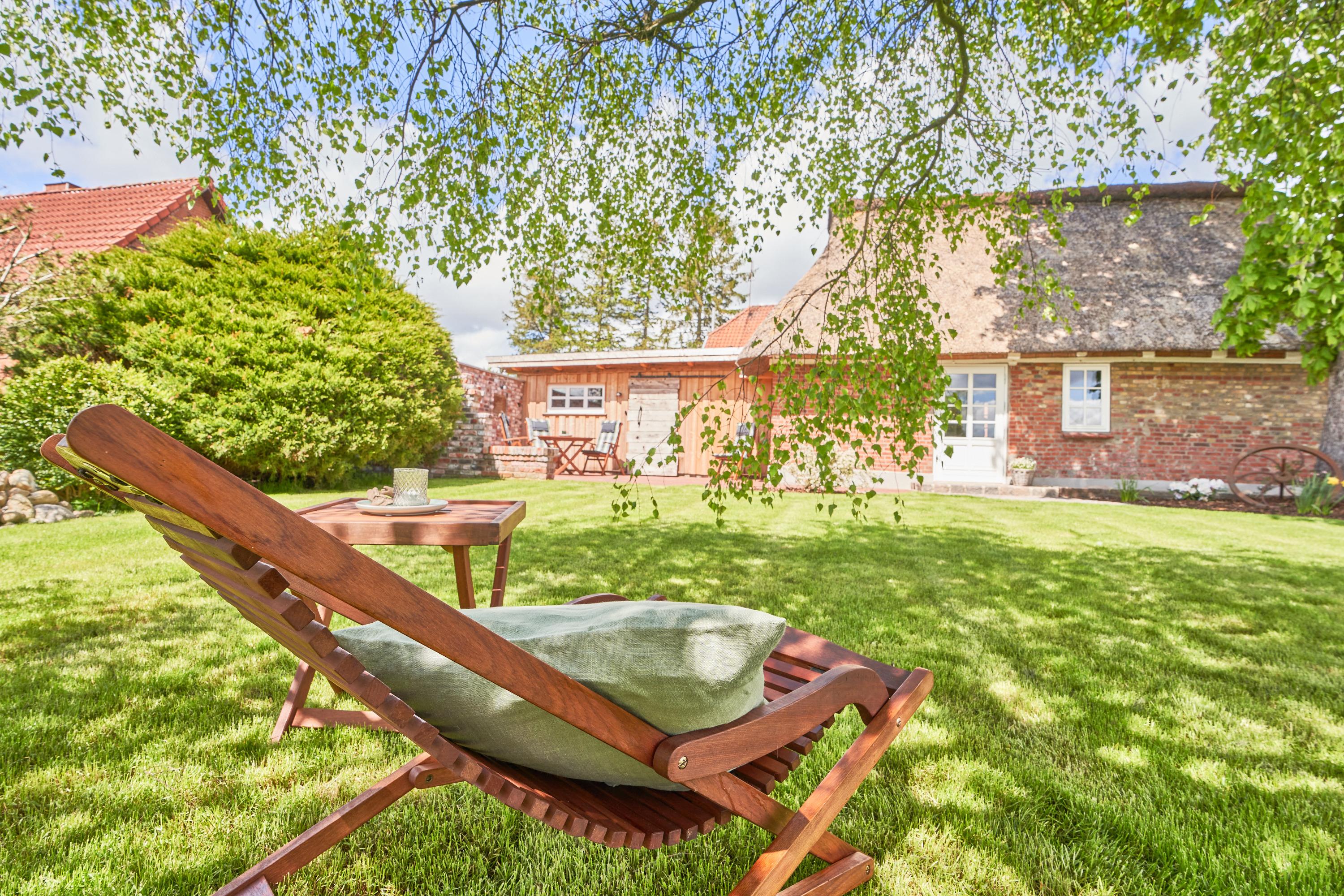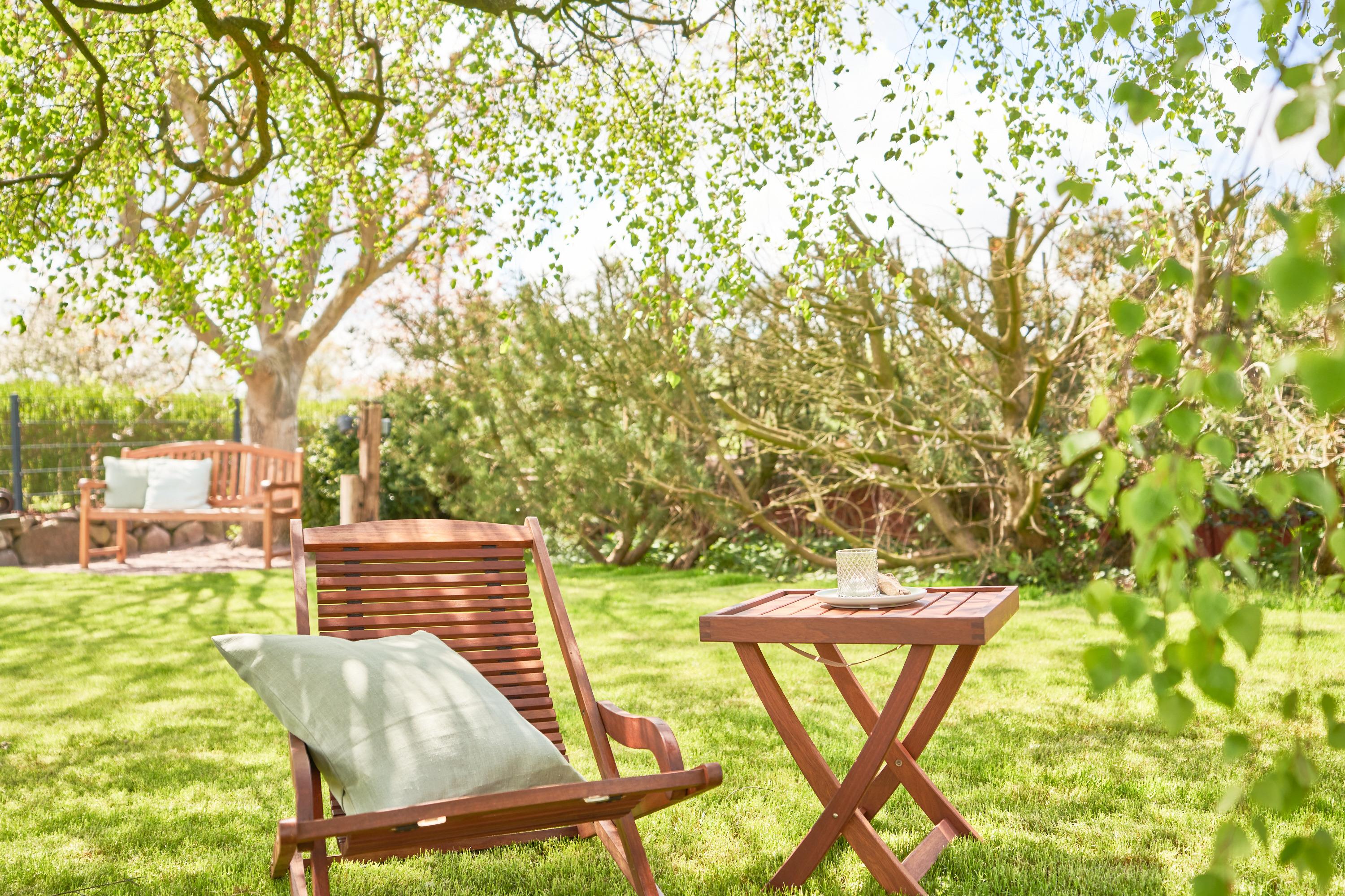 Wenn Sie Ihre Urlaubstage mal frei von Aktivitäten verbringen möchten, lädt die grüne Gartenlandschaft der Kleinen Oase zum Verweilen ein. Sie öffnet sich nach Süden. Es gibt genügend Plätze zum Ausspannen und Durchatmen: Unter dem Walnussbaum, dessen ätherischen Öle Geist und Körper entspannen, lädt eine Bank zum Verweilen ein. Oder Sie pausieren auf dem Rasen unter der Trauerbirke, deren langen Zweige sich wie ein grünes Dach ausbreiten. Der eingezäunte Garten ist zusätzlich mit einer Ilexhecke umrahmt. So können Sie sich rundum eingebettet fühlen. Der 1,20 m hohe Metallzaun schützt Hunde vor unverhofften Ausflügen.