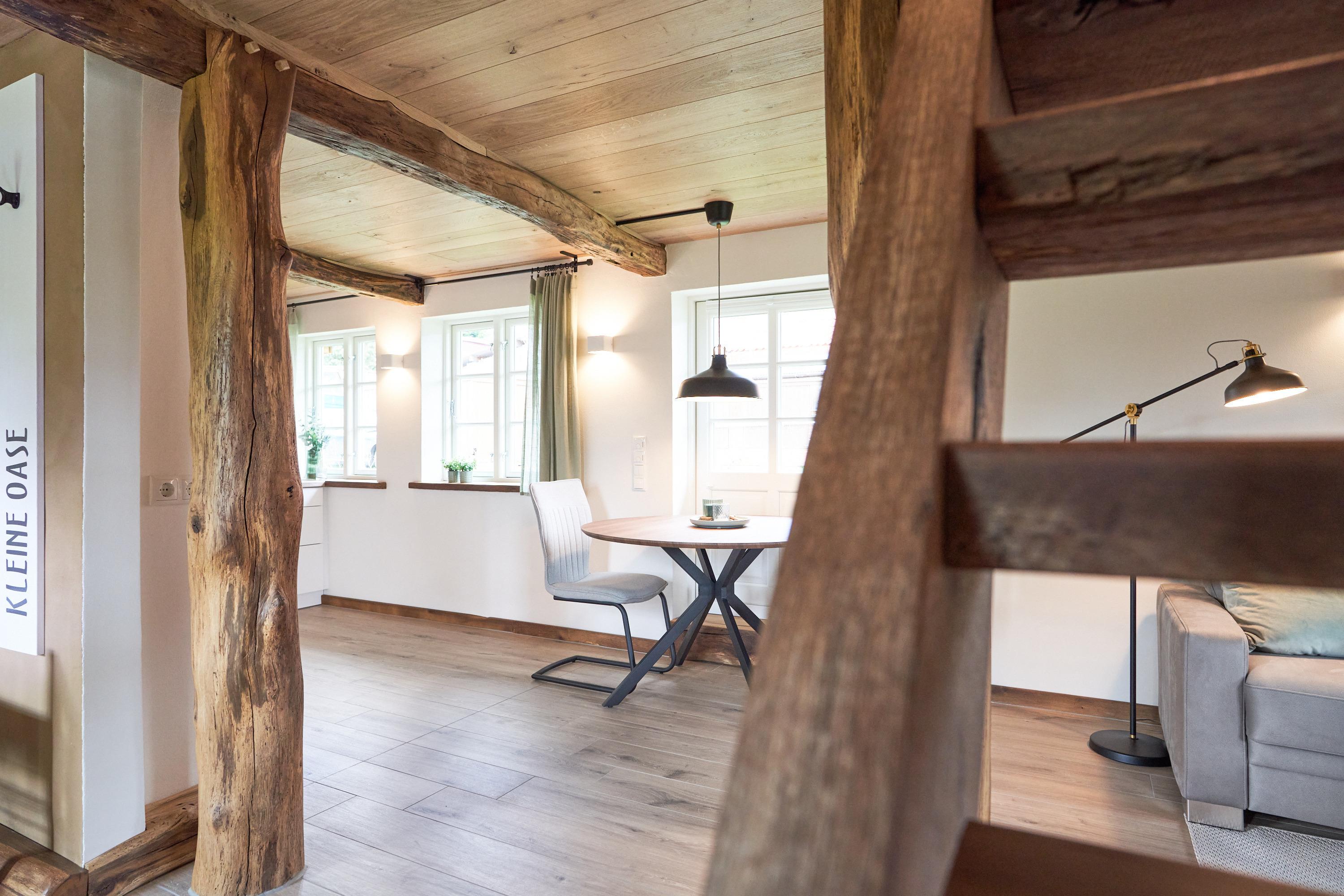 Willkommmen in der Kleinen Oase! Hier begrüßen Sie ein angenehmes Klima und erdende Farben. Bei der Renovierung wurden vor allem Naturmaterialien verwendet. Die Wände wurden mit Lehm auf einer Holzfaserdämmung verputzt und zum Teil mit einer atmungsaktiven Lehmfarbe weiß gestrichen. Alle alten Balken des Hauses wurden in liebevoller Kleinstarbeit freigelegt und mit Leinöl restauriert. Die Kombination aus Holz und Lehm ergibt ein irdenes Aroma und lässt Sie sogleich entspannen. Die Farben der Inneneinrichtung holen die Natur ins Haus. Der sandige Lehmputz und das Grün der Dekoration ergänzen sich gemeinsam mit den Holzbalken und den handgefertigten Eichen-Fensterbänken zu einer Oase. Der Fußboden im Wohn- und Küchenbereich ist gefliest und wird über eine Fußbodenheizung temperiert. Hinter dem bequemen Ecksofa befindet sich ebenfalls eine Wandheizung. Besonders an kalten Tagen hat man dadurch das Gefühl, ein Ofen würde die Wohnung heimelig erwärmen, während Sie Ihren Abend vielleicht bei einem Glas Wein vor dem Flat-TV ausklingen lassen. Die Wandbeleuchtung illuminiert dabei den Raum in warmen Licht.