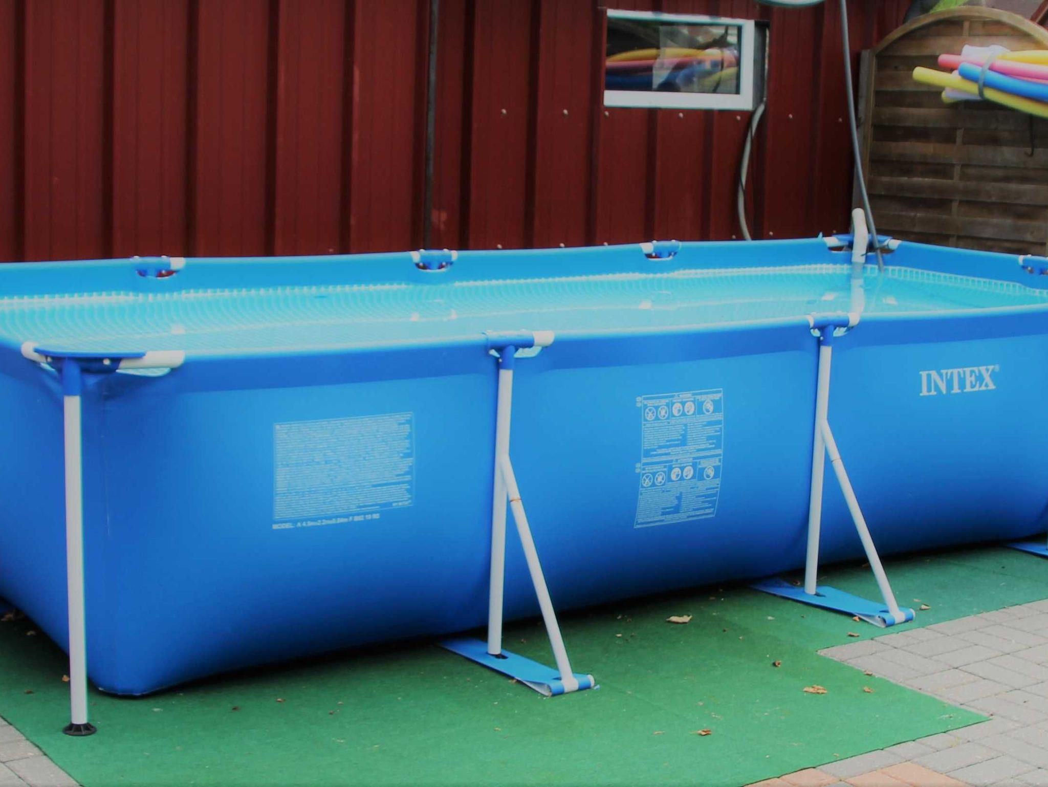 Eine Terrasse /Garten mit Gartenmöbeln Spielbereich und Pool lädt zum Verweilen ein.