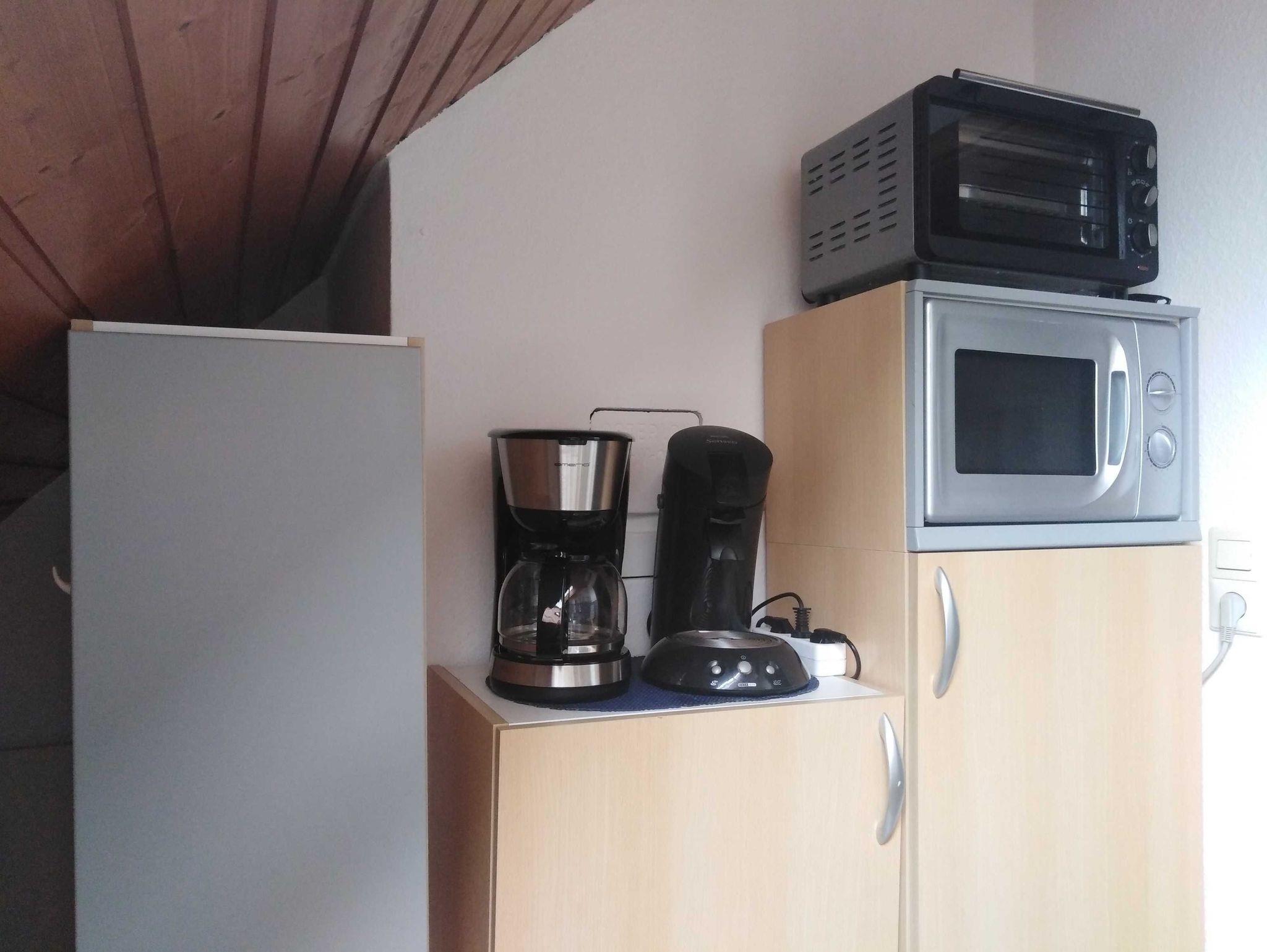 Kühlschrank mit Gefrierfach, Mikrowelle, Mini-Backofen, Kaffeemaschine, Wasserkocher, Eierkocher und