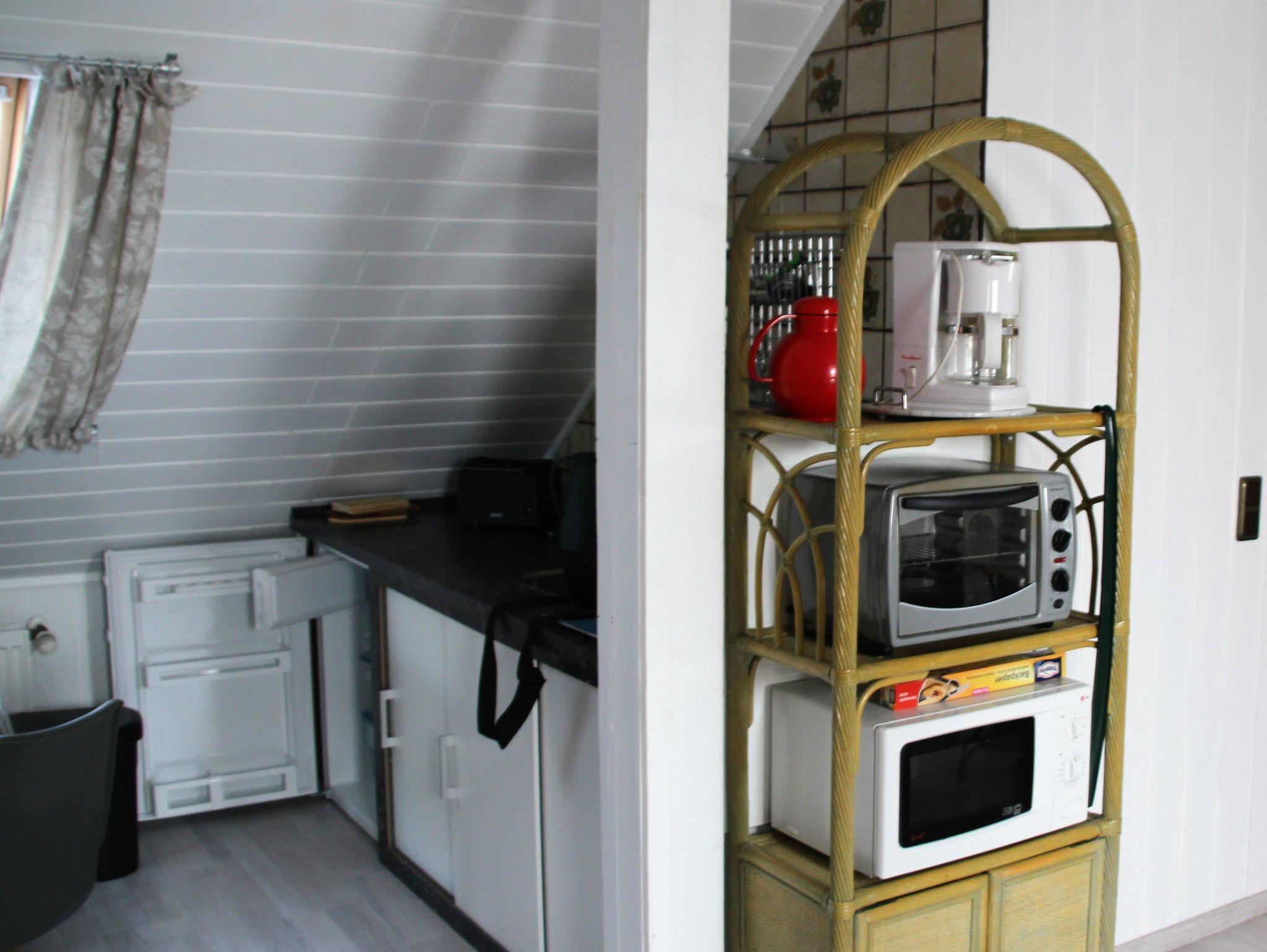 Eine Kaffeemaschine, Mikrowelle, Geschirr, Gläser usw. sowie Bettwäsche und Handtücher werden gestellt.
