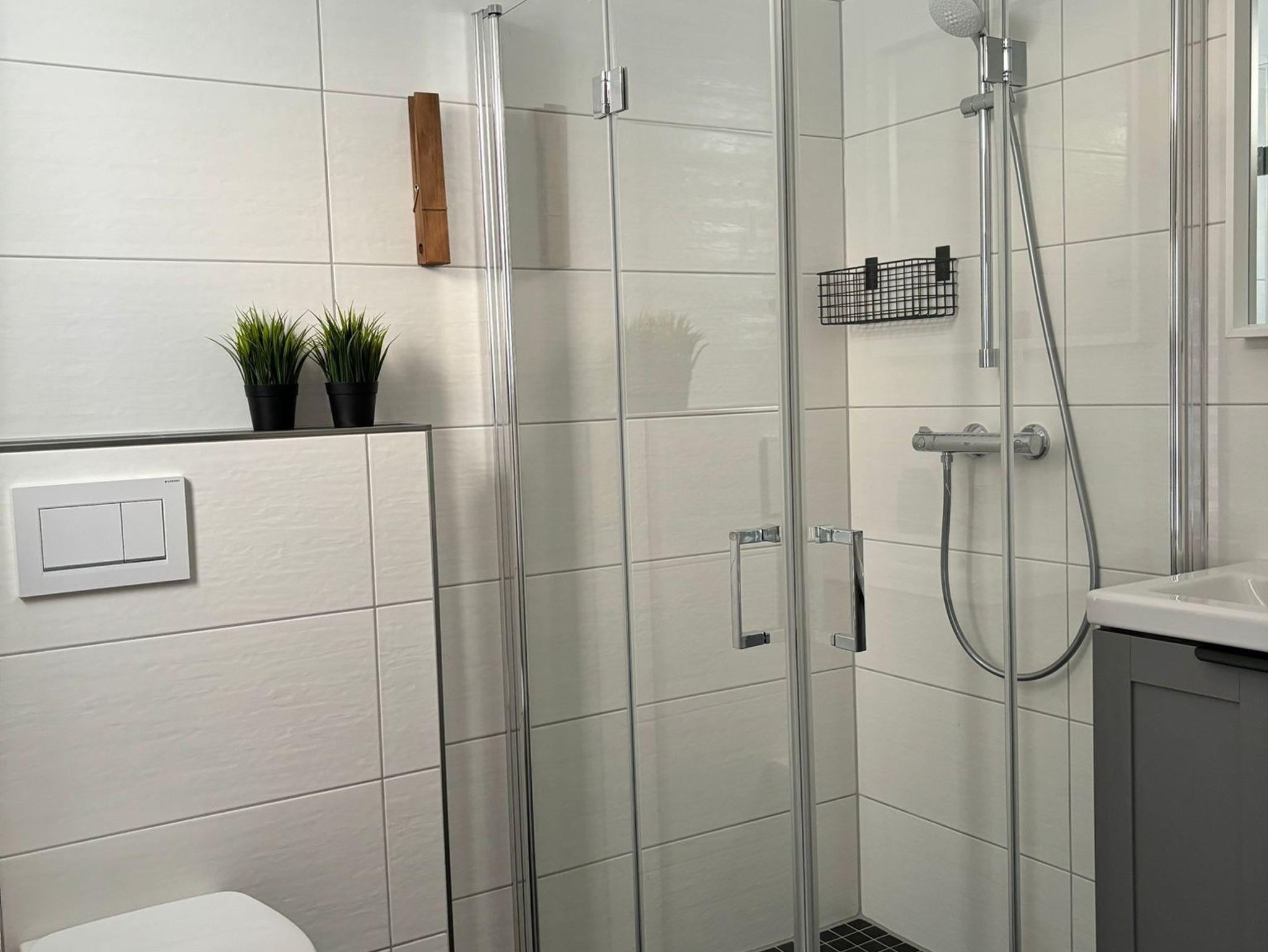 Im Bad ist eine ebenerdige Dusche, ein WC und ein Waschbecken vorhanden.