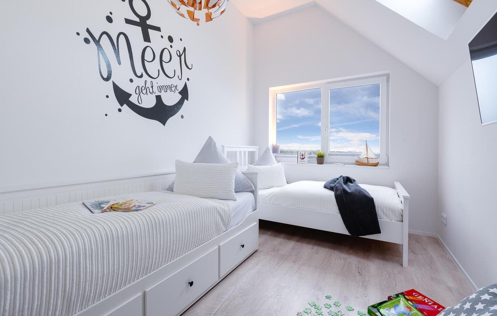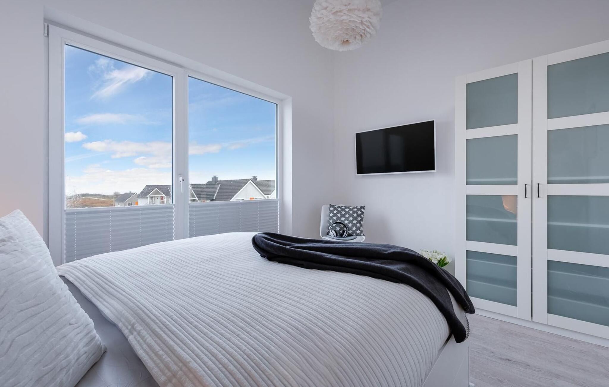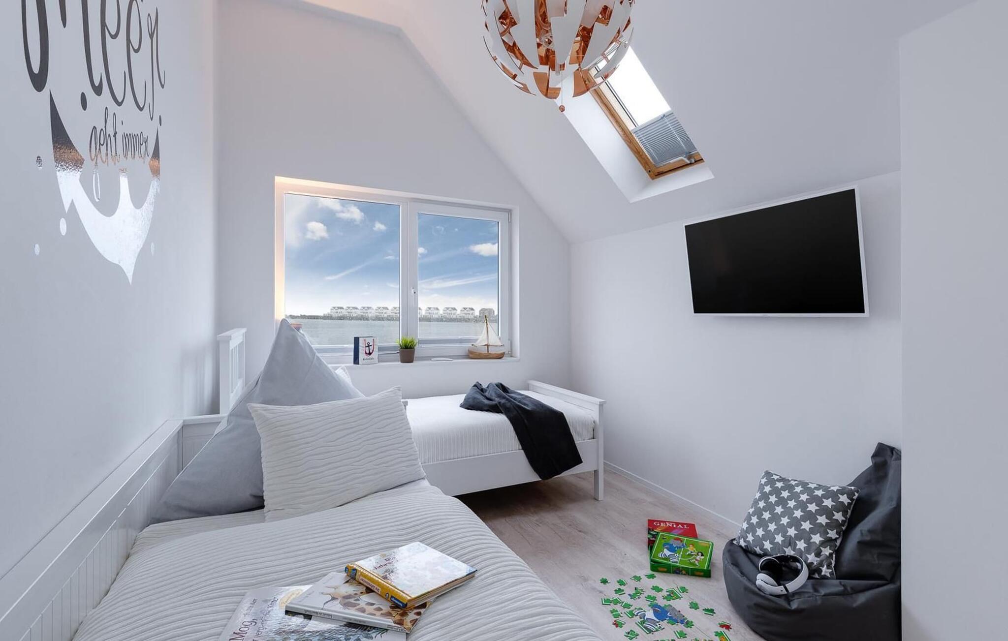 Ferielejlighedens afslapningsområde er på andet niveau. Det store soveværelse har en hyggelig dobbeltseng. Det andet soveværelse er udstyret med en enkeltseng og en udtræksseng, så der er plads til 3 personer. Derudover giver et ovenlys jer mulighed for at se på stjernerne! Begge soveværelser har fladskærms-tv med streamingtjenester fra Netflix og Amazon Prime Video. Der er også et sted at sove på den komfortable sovesofa i opholdsområdet.