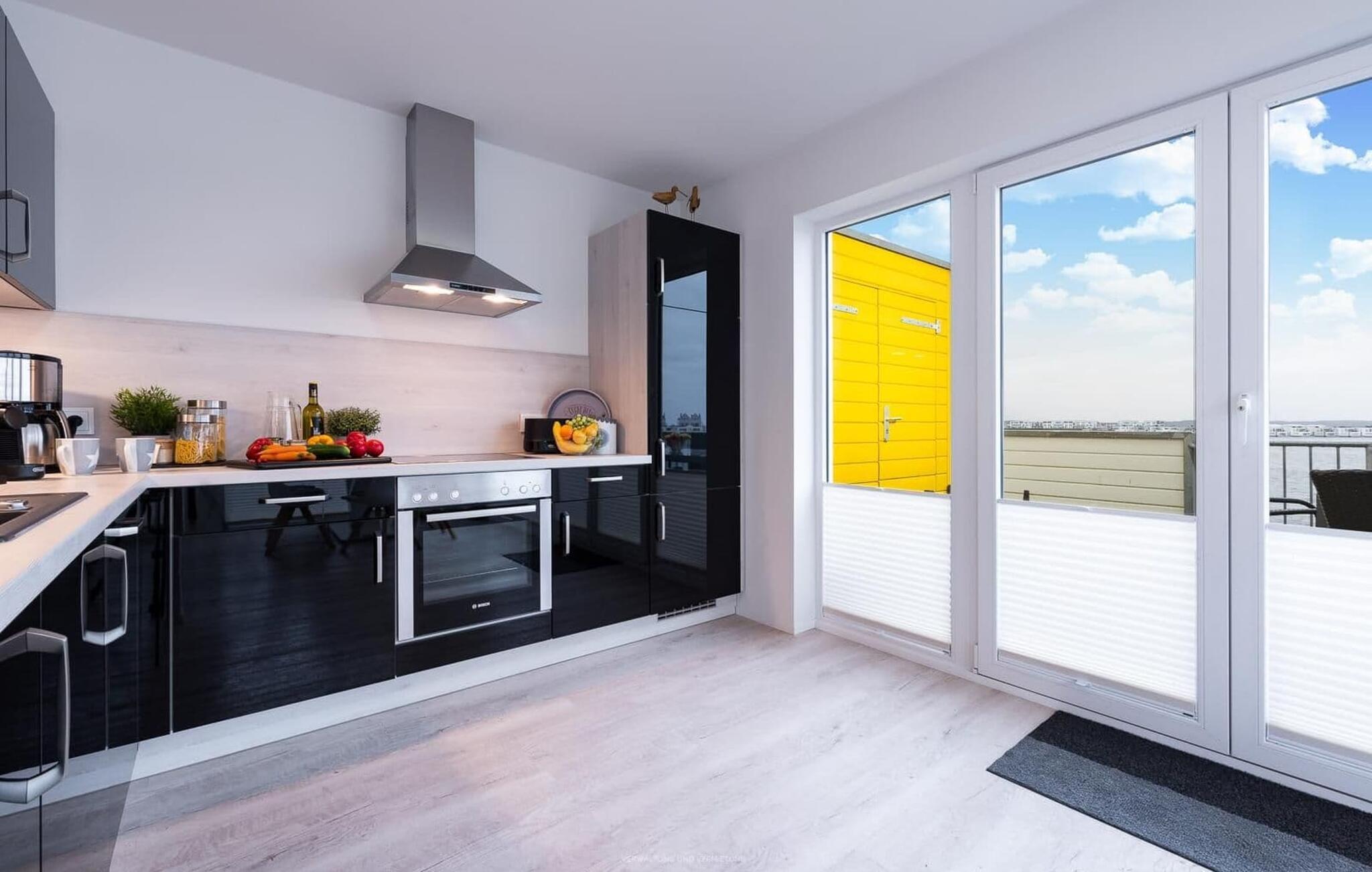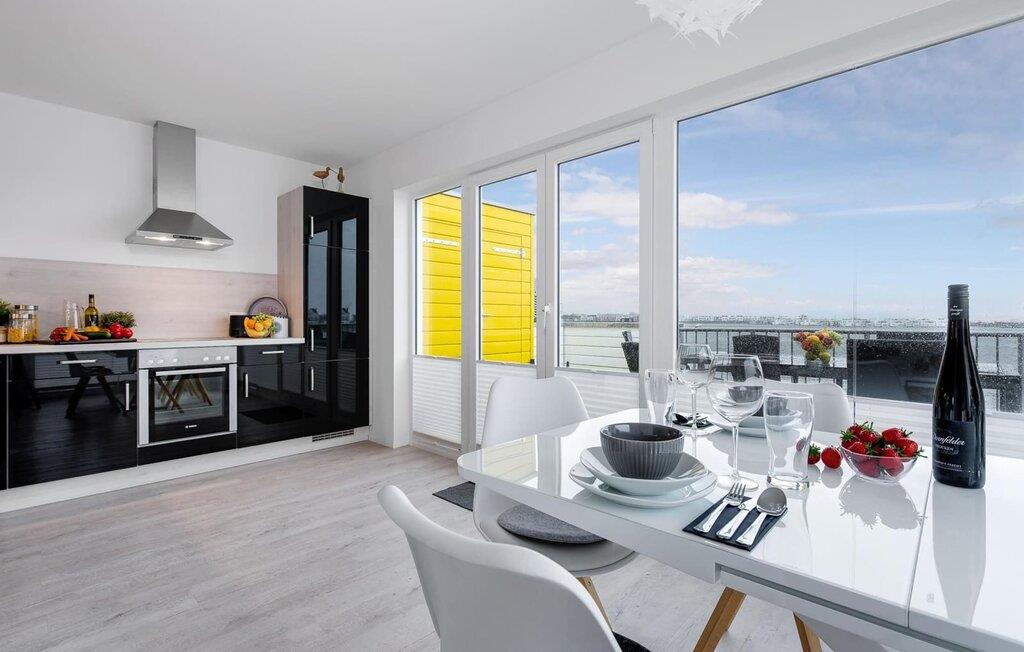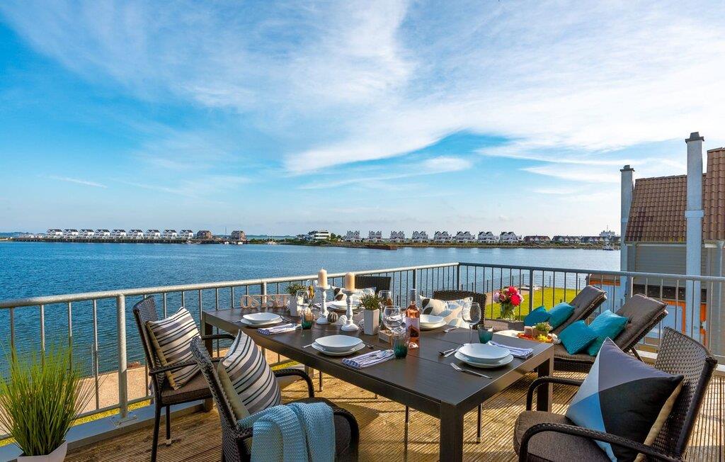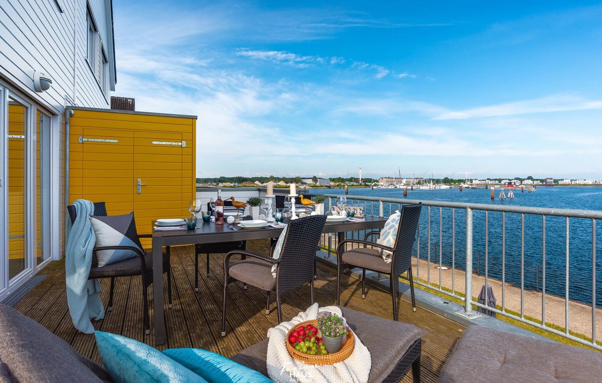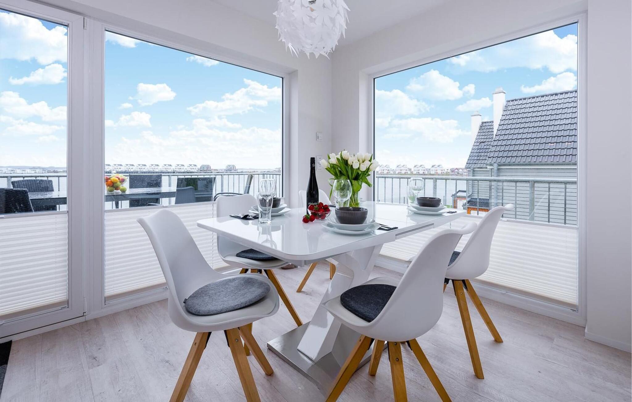 Ferielejlighedens opholds-/spisestue er oversvømmet med lys og har panoramavindue fra gulv til loft mod de tilstødende terrasser på begge sider. En fantastisk udsigt åbner op på terrassen ved siden af spisepladsen med udsigt over sejler- og sportsbådhavnen i OstseeResort Olpenitz. Havnebiograf og romantiske solnedgange er garanteret, og I kan også slappe af her med en god bog.